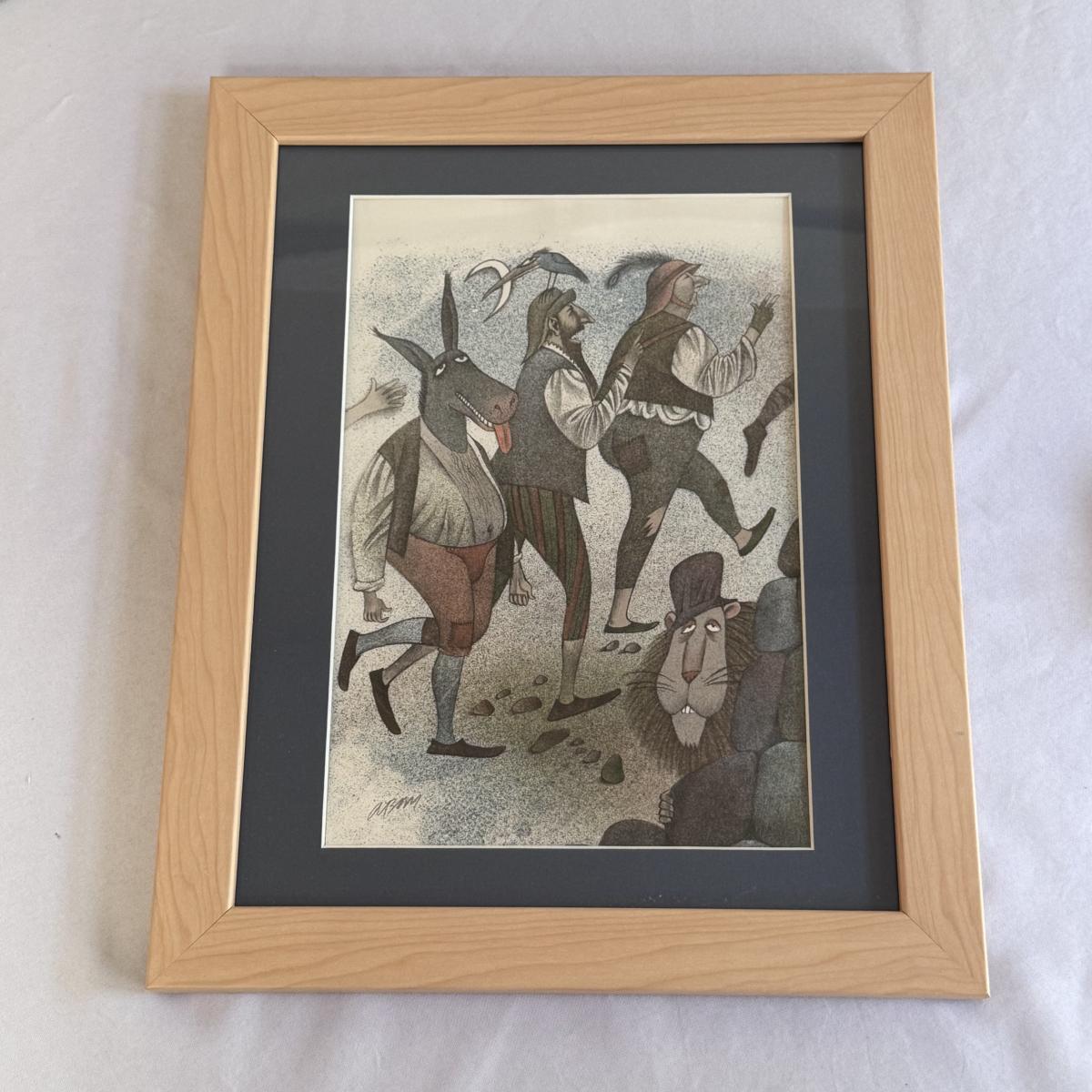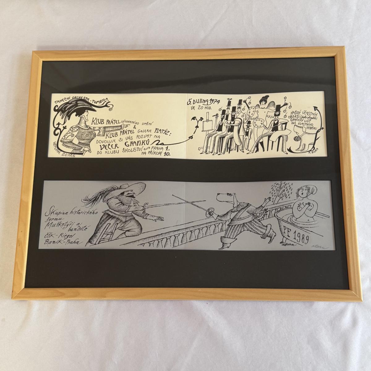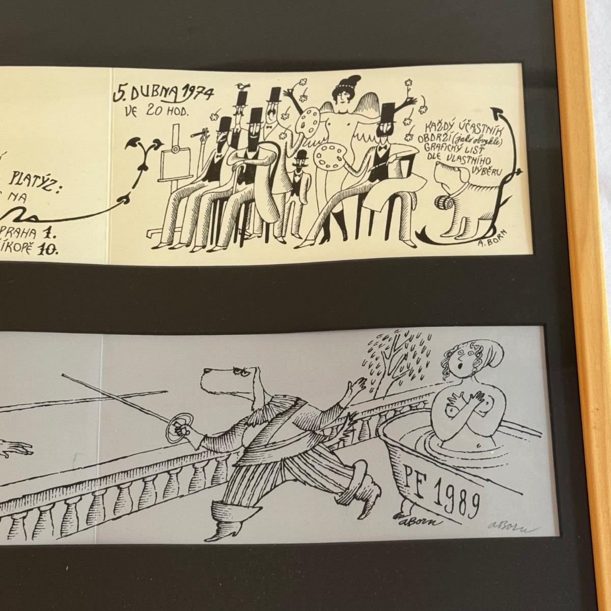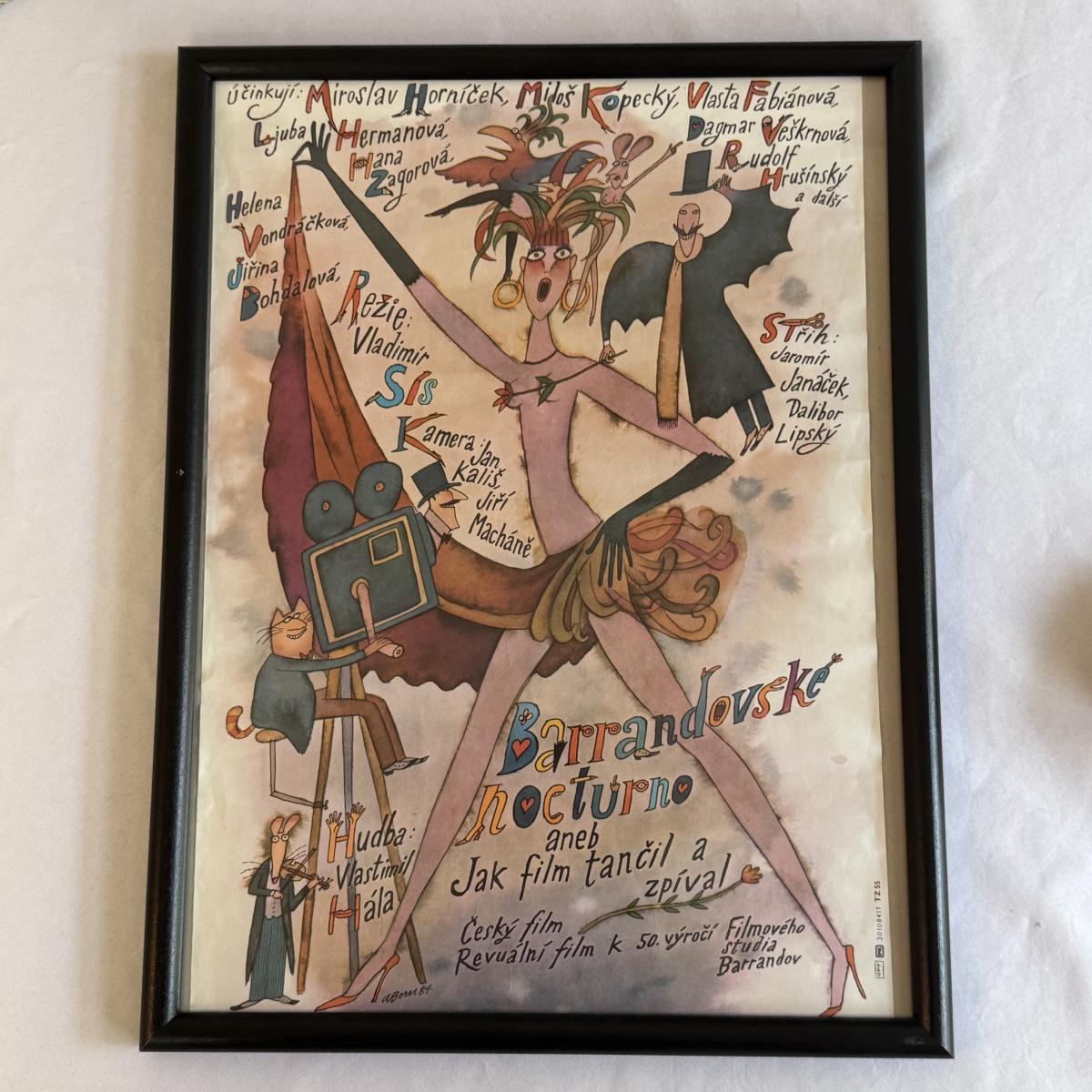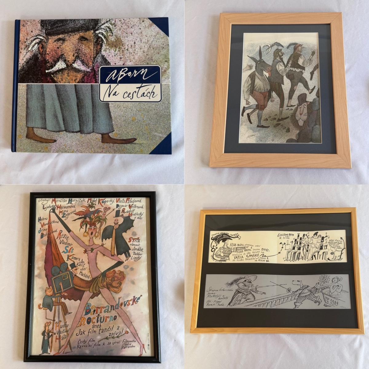 This lot includes one framed movie poster from the 1984 Czechoslovakia film “Barrandovské nocturno aneb Jak film tančil a zpíval” by Adolf Born. It also includes a print with animals by Adolf Born, a book on Adolf Born’s art titled “A Born Na Cestách,” and one last print of what appears to be a comic by Adolf Born. The animals print and comic print both appear to be signed with pencil at the bottom. All three pieces of art are protected in a wooden frame, with glass, and matting. The largest piece of art is the framed comics that measures 19” x 15”H. Shipping available. Shipping can be costly. We suggest contacting our preferred local shipping provider, Postage Express, with dimensions and getting an estimate before bidding: (828) 255-9250 or shipping@postageexpressnc.com.