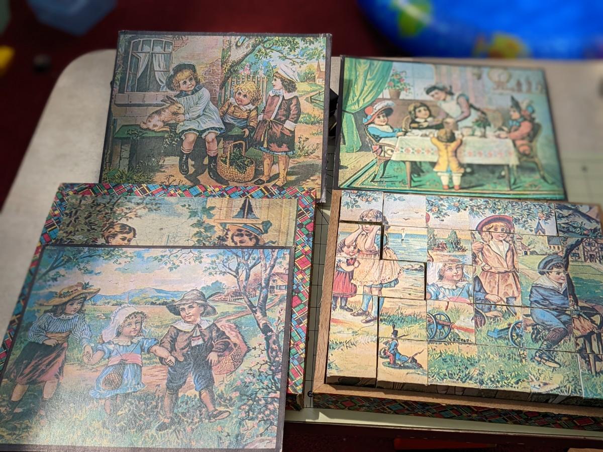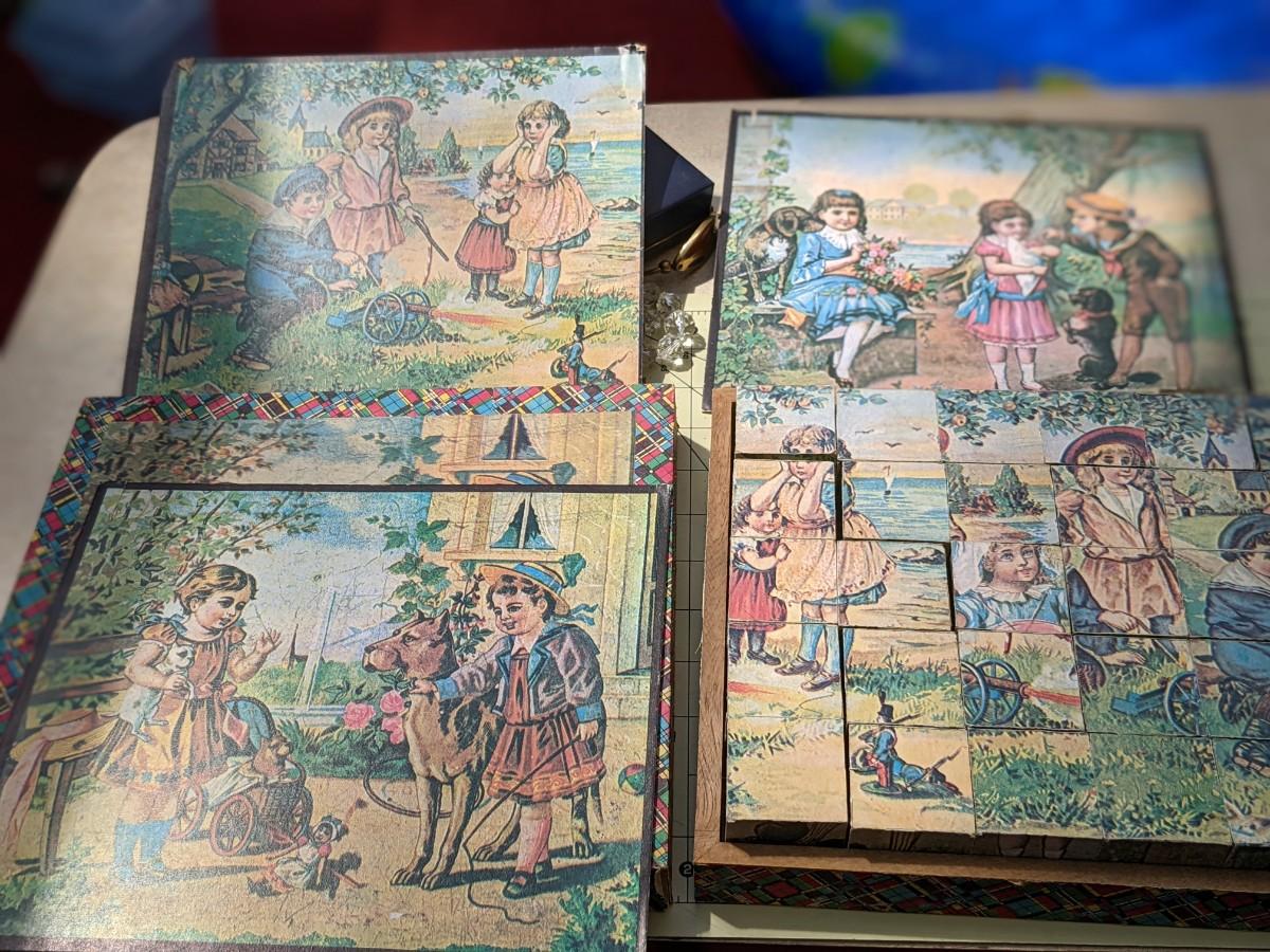 Adorable Antique Victorian Set of Wooden Block Puzzles, 6 Puzzles