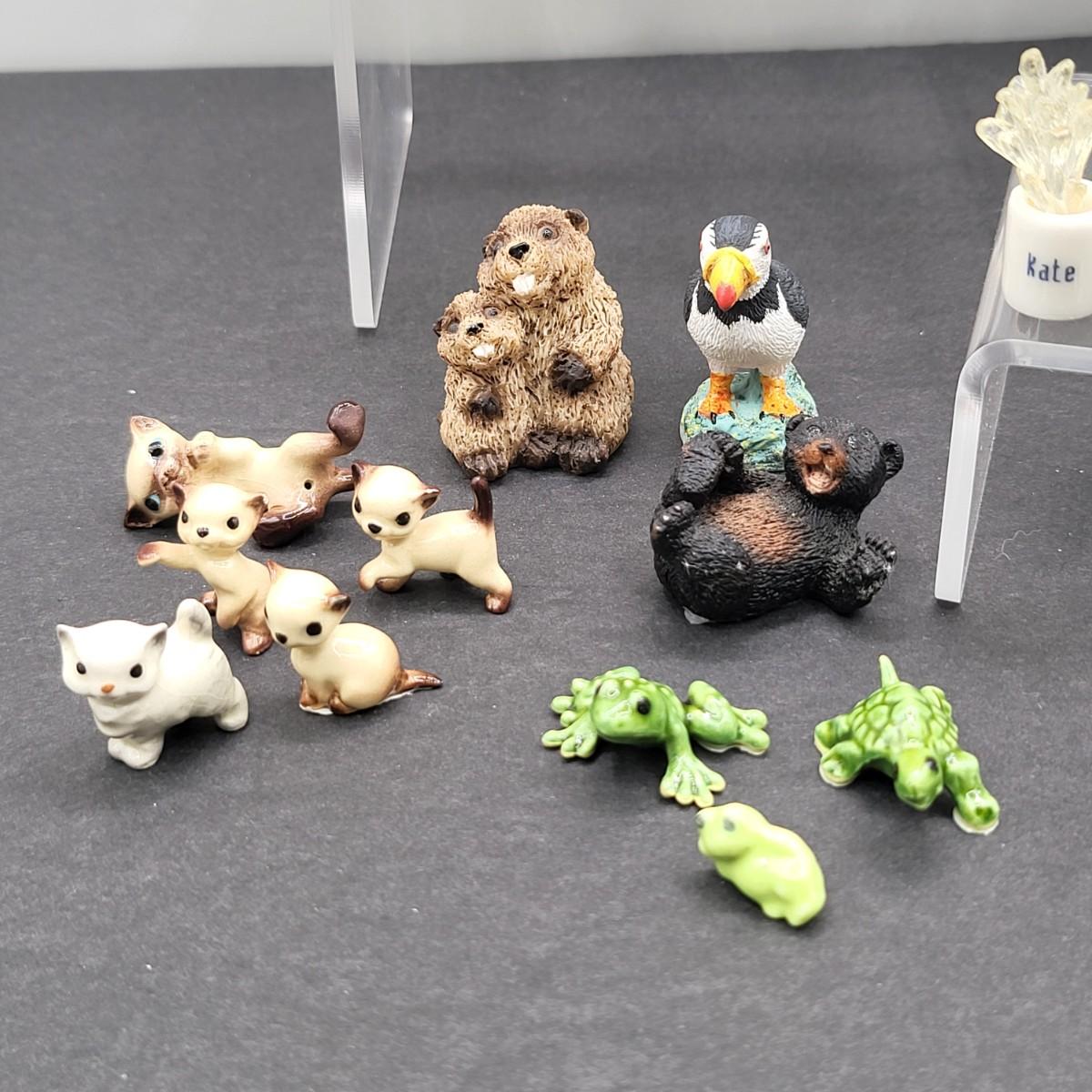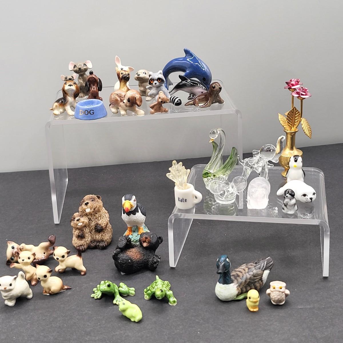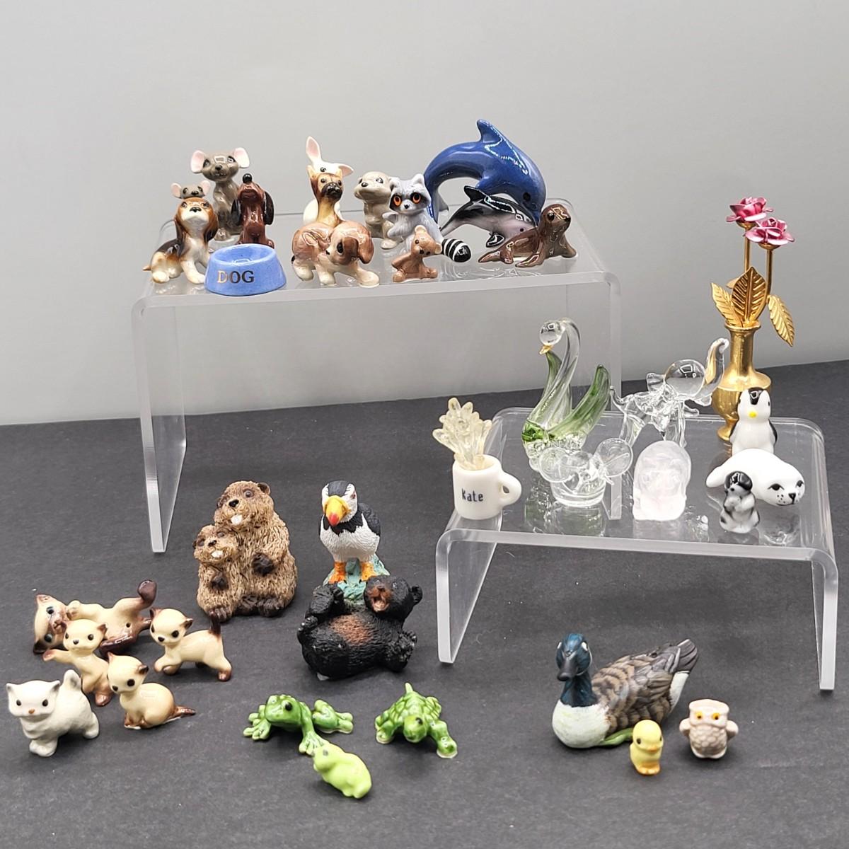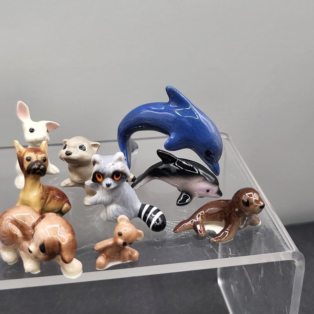 Dogs, cats, dolphins, seal, mice, rabbits, raccoon, birds, frogs & more. Glass, porcelain, resin, brass. Smallest one measures 1/4" and largest 1 1/2".