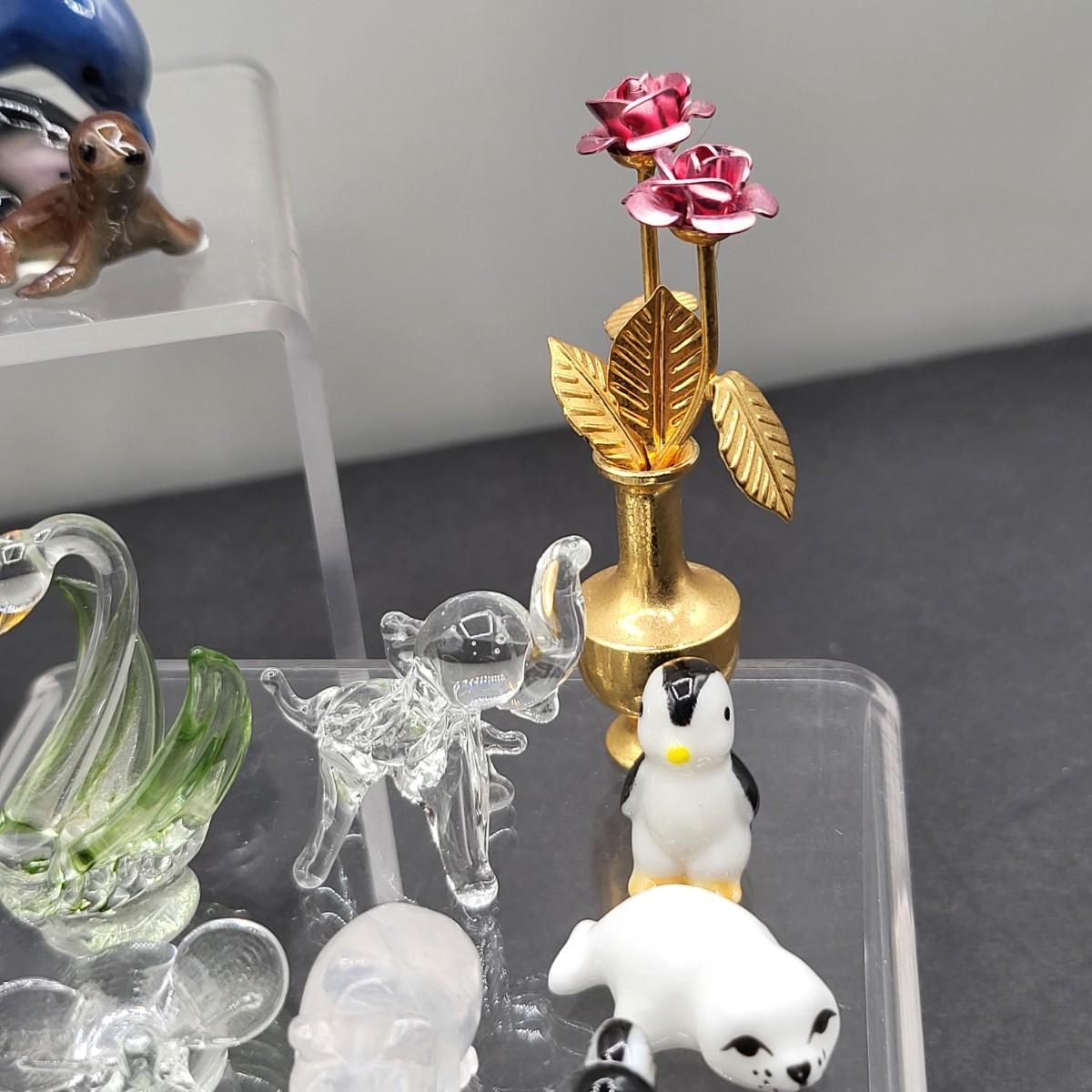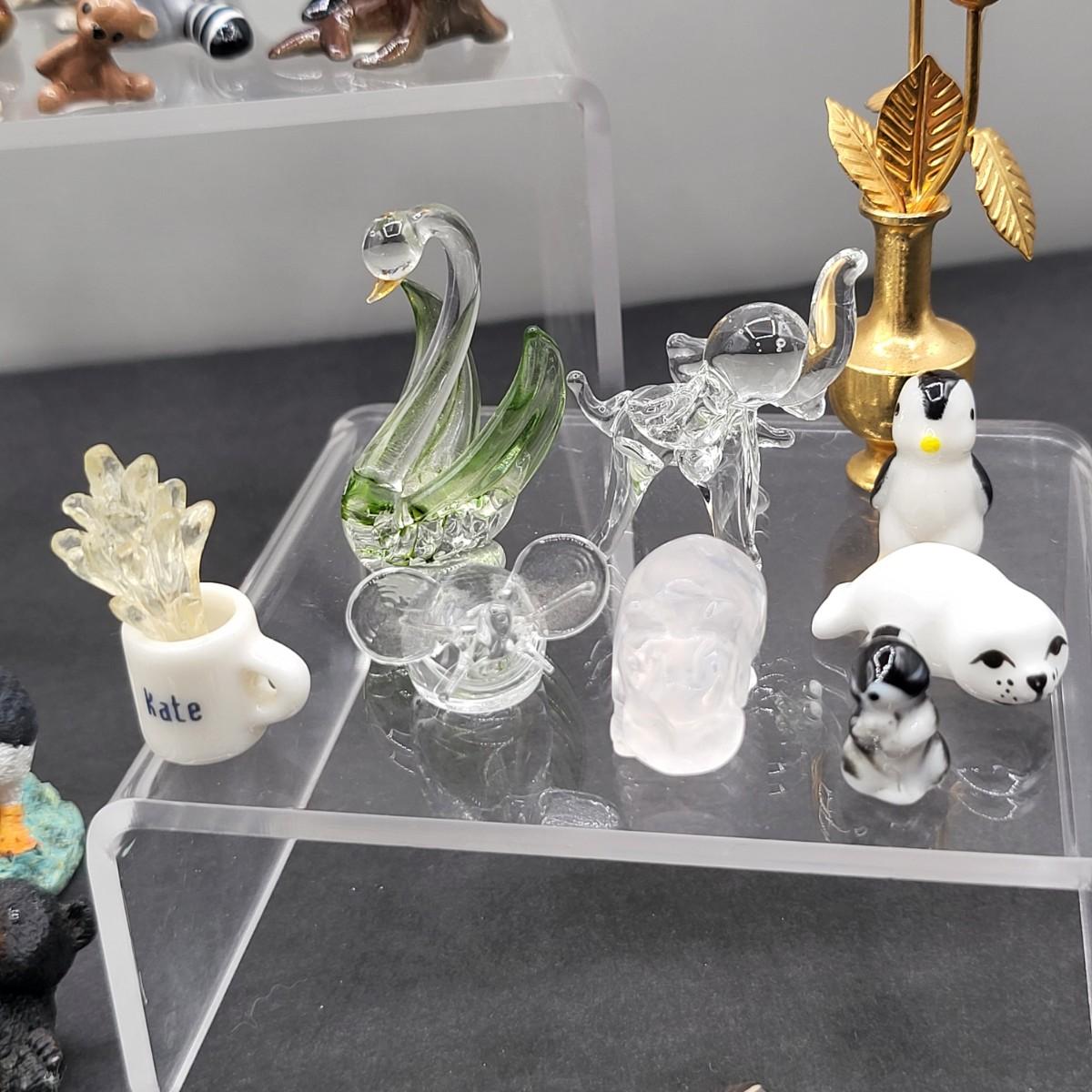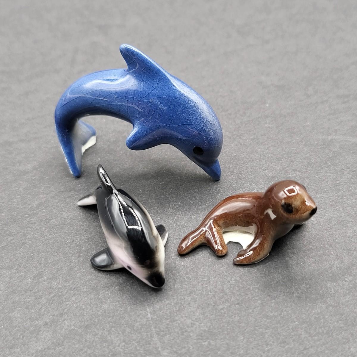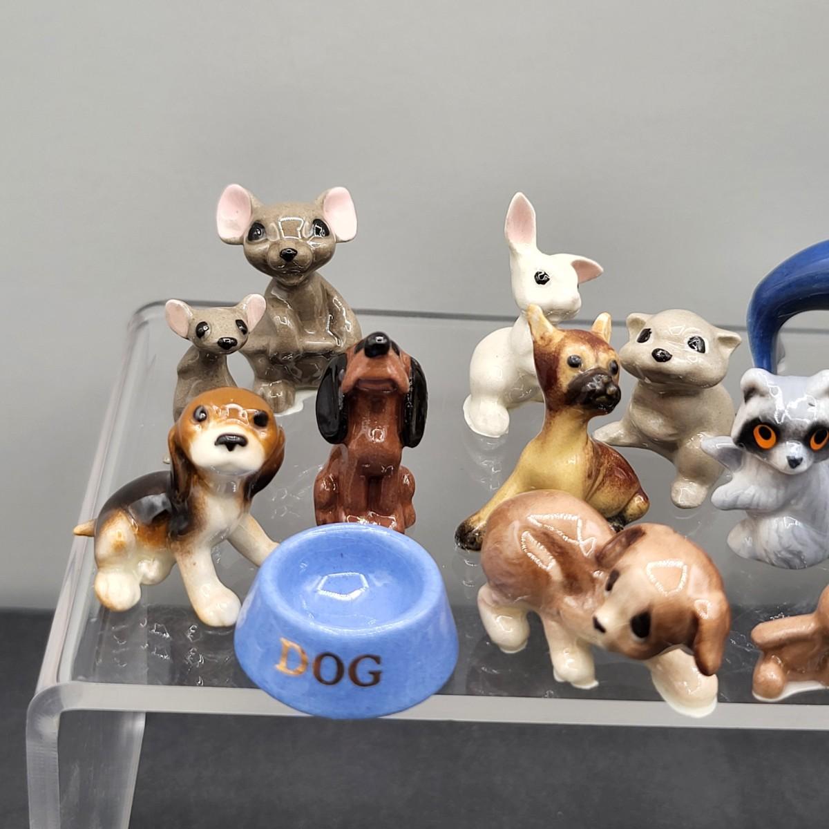 Dogs, cats, dolphins, seal, mice, rabbits, raccoon, birds, frogs & more. Glass, porcelain, resin, brass. Smallest one measures 1/4" and largest 1 1/2".