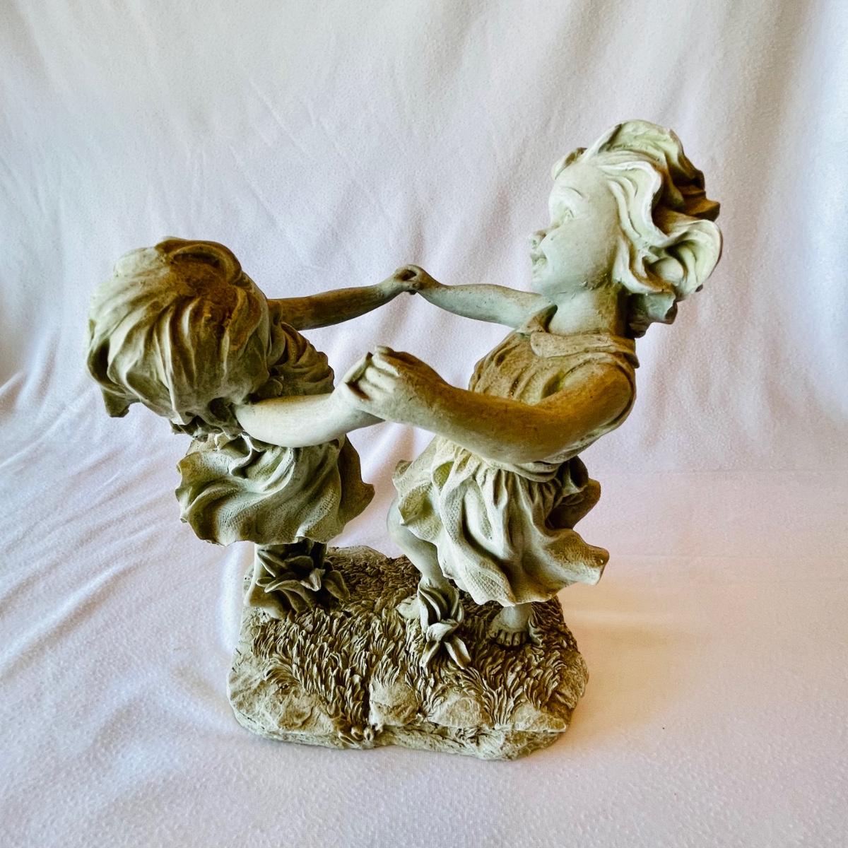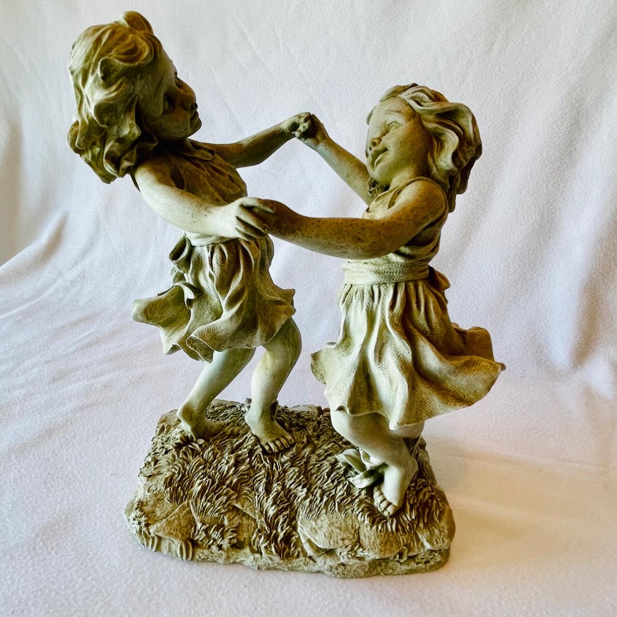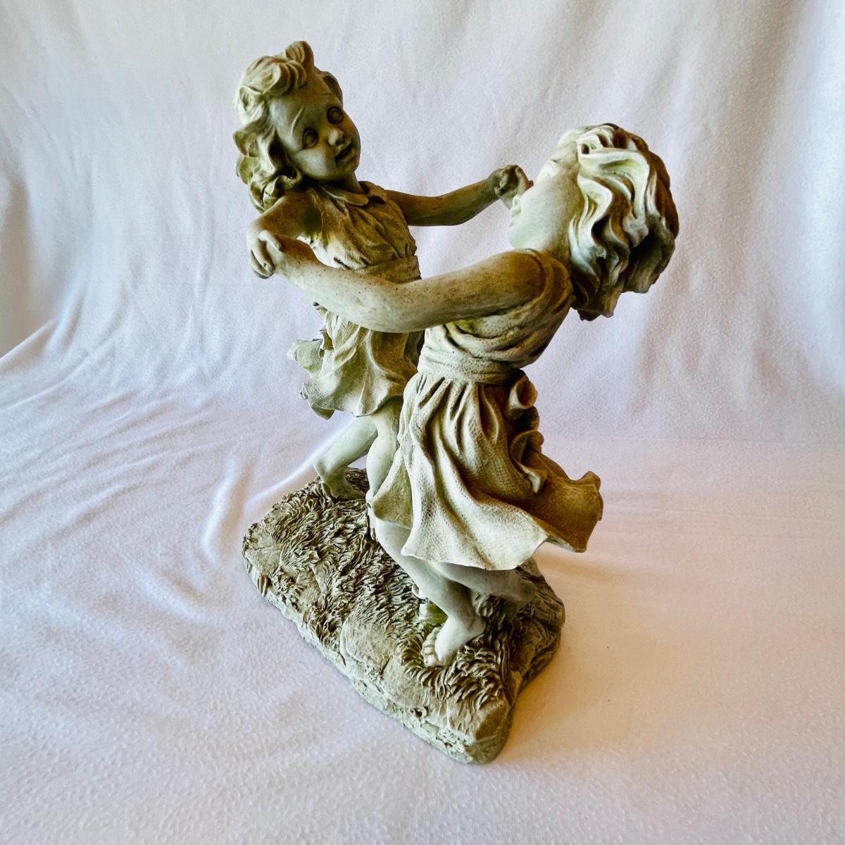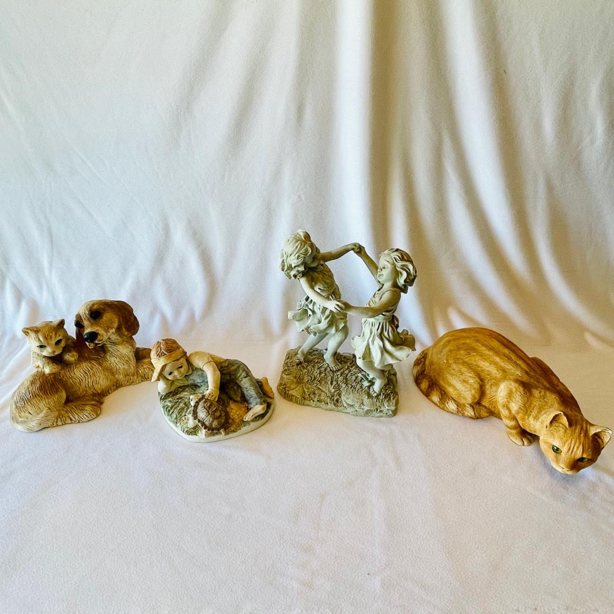 Lot includes 4 adorable sculptures that’s could be displayed inside or outside. Pieces ranging in sizes, smallest being Boy and Turtle 8”L x 6”W x 5.5”H. and largest being the Girls Dancing 8”L x 5”W x 12” H. Dog and kitten sculpture is made from resin. Boy and Turtle is hand painted solid plaster. Girls Dancing has a natural finish. One of the legs has a slight surface crack. Crack does not go all the way through. Red Tabby Cat is a Sandicast sculpture. All pieces are in good condition.