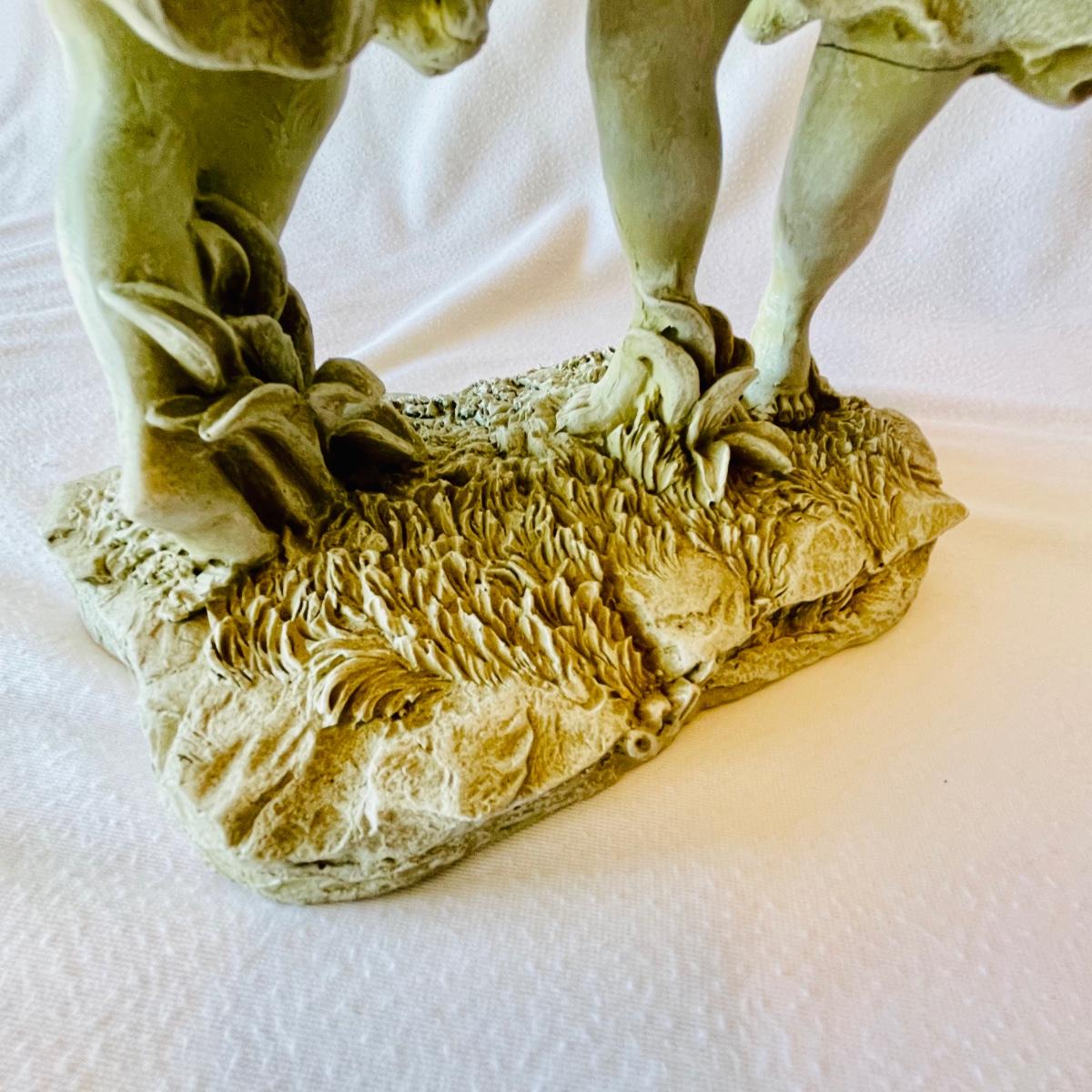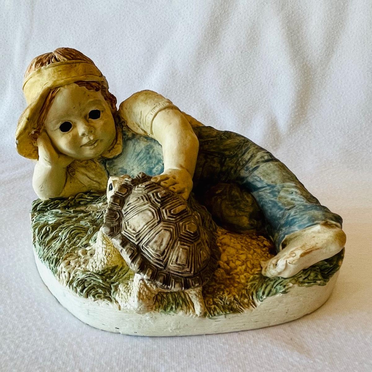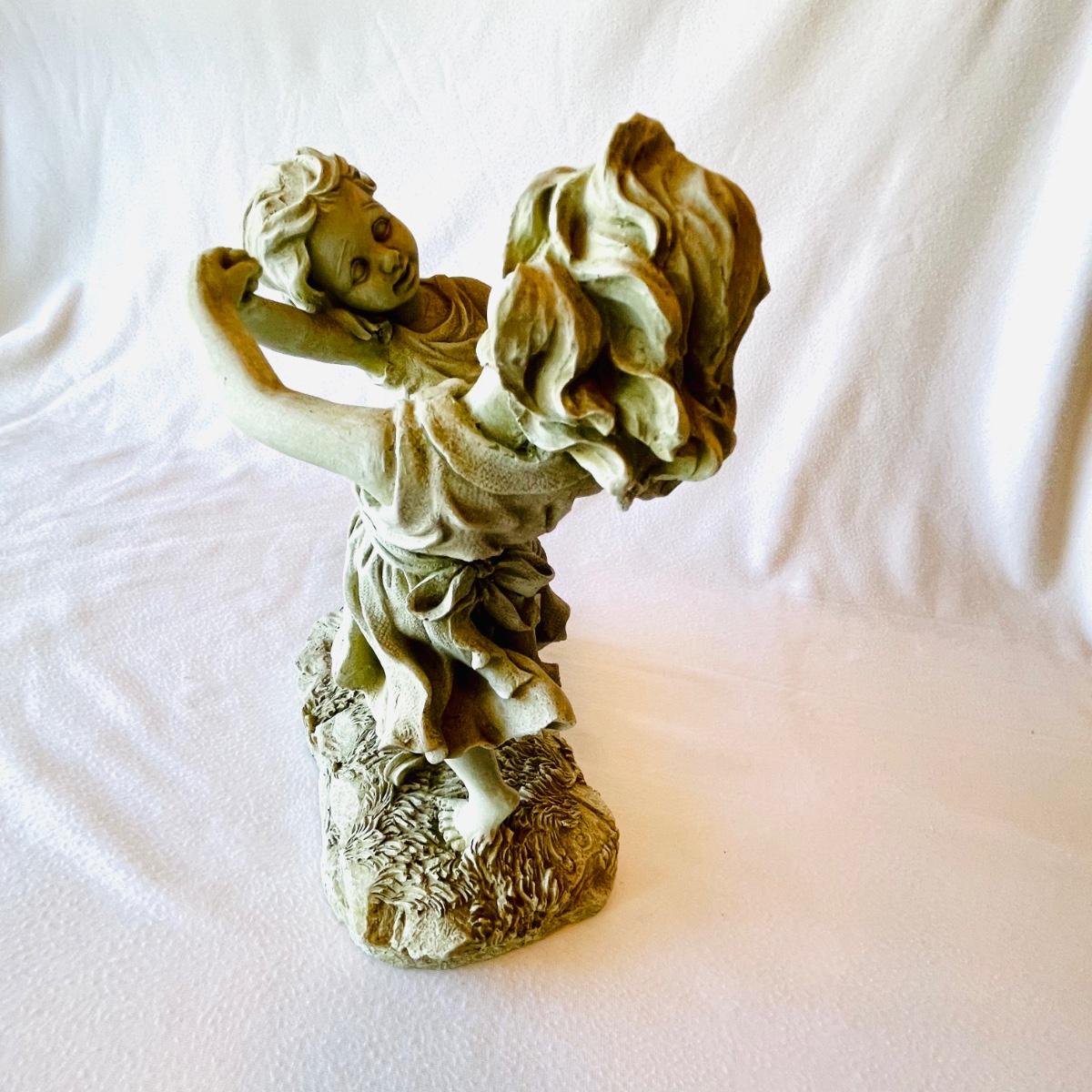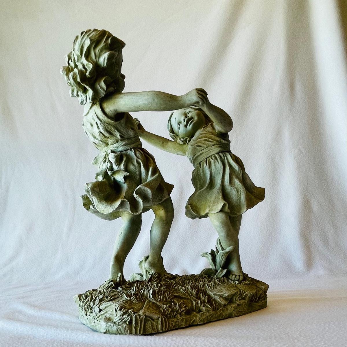 Lot includes 4 adorable sculptures that’s could be displayed inside or outside. Pieces ranging in sizes, smallest being Boy and Turtle 8”L x 6”W x 5.5”H. and largest being the Girls Dancing 8”L x 5”W x 12” H. Dog and kitten sculpture is made from resin. Boy and Turtle is hand painted solid plaster. Girls Dancing has a natural finish. One of the legs has a slight surface crack. Crack does not go all the way through. Red Tabby Cat is a Sandicast sculpture. All pieces are in good condition.