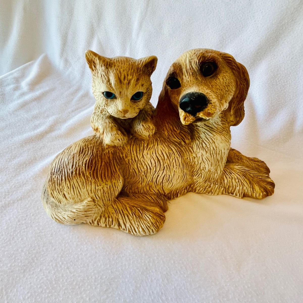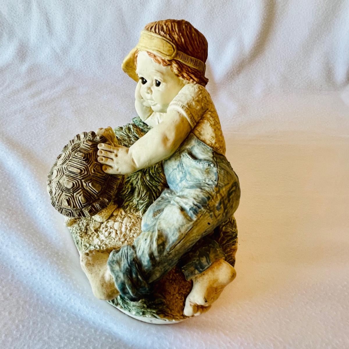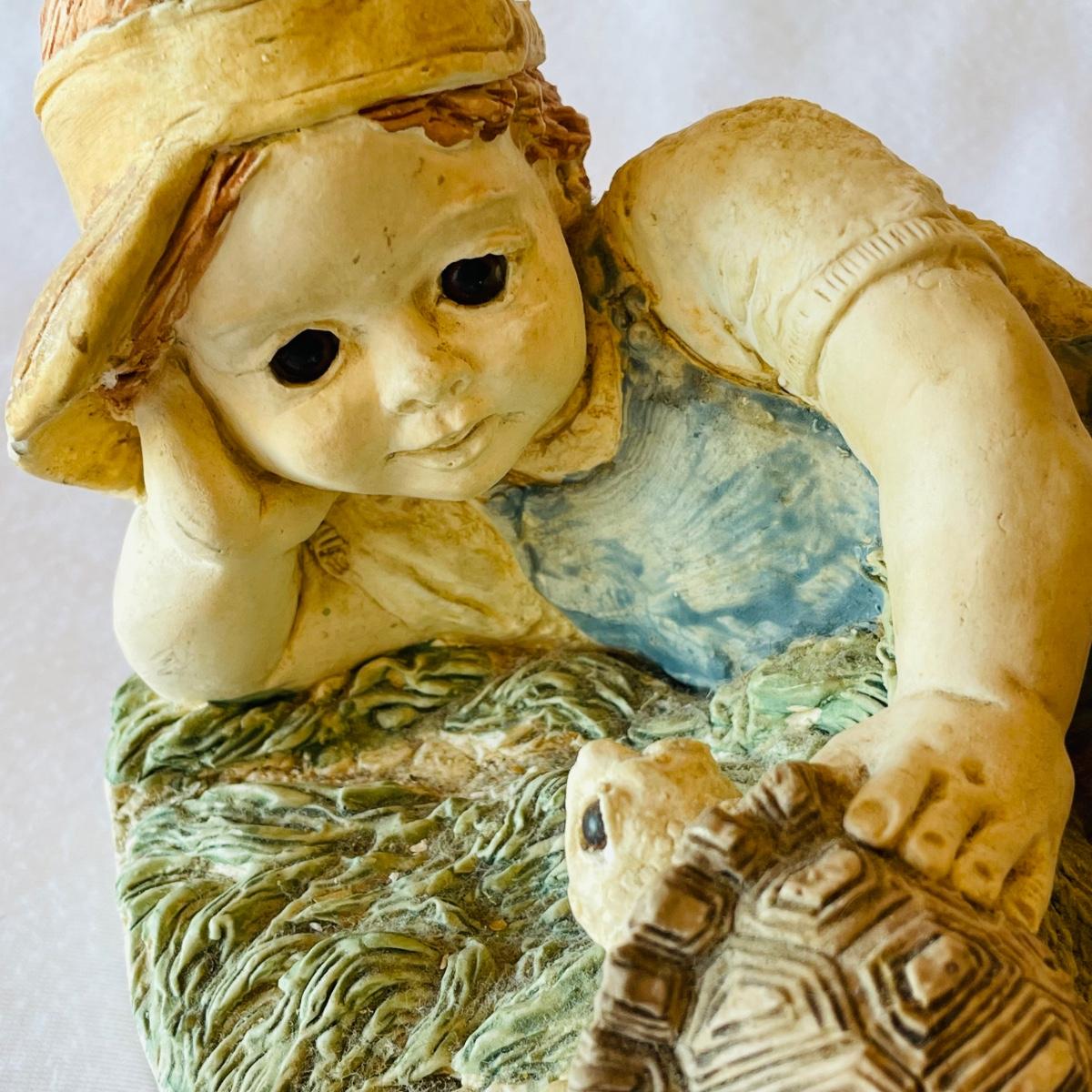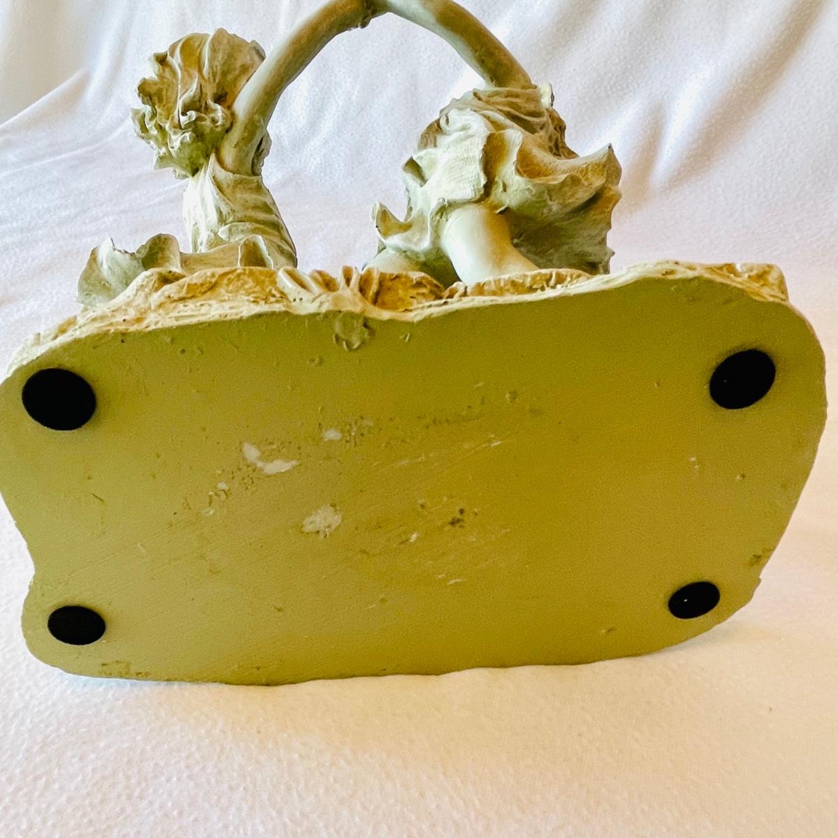 Lot includes 4 adorable sculptures that’s could be displayed inside or outside. Pieces ranging in sizes, smallest being Boy and Turtle 8”L x 6”W x 5.5”H. and largest being the Girls Dancing 8”L x 5”W x 12” H. Dog and kitten sculpture is made from resin. Boy and Turtle is hand painted solid plaster. Girls Dancing has a natural finish. One of the legs has a slight surface crack. Crack does not go all the way through. Red Tabby Cat is a Sandicast sculpture. All pieces are in good condition.