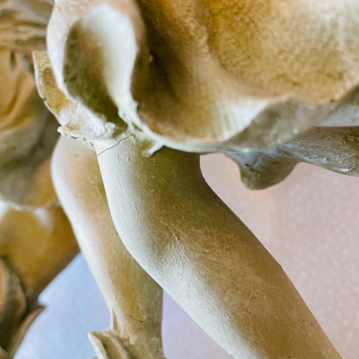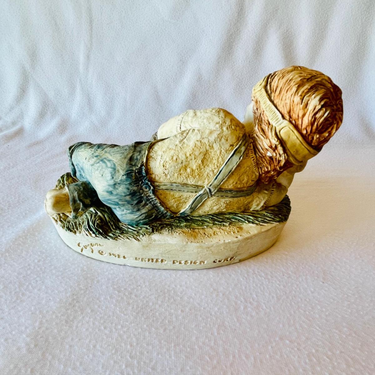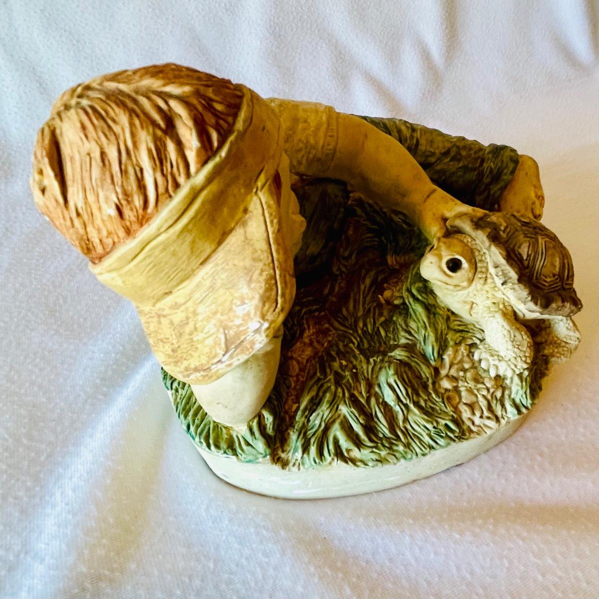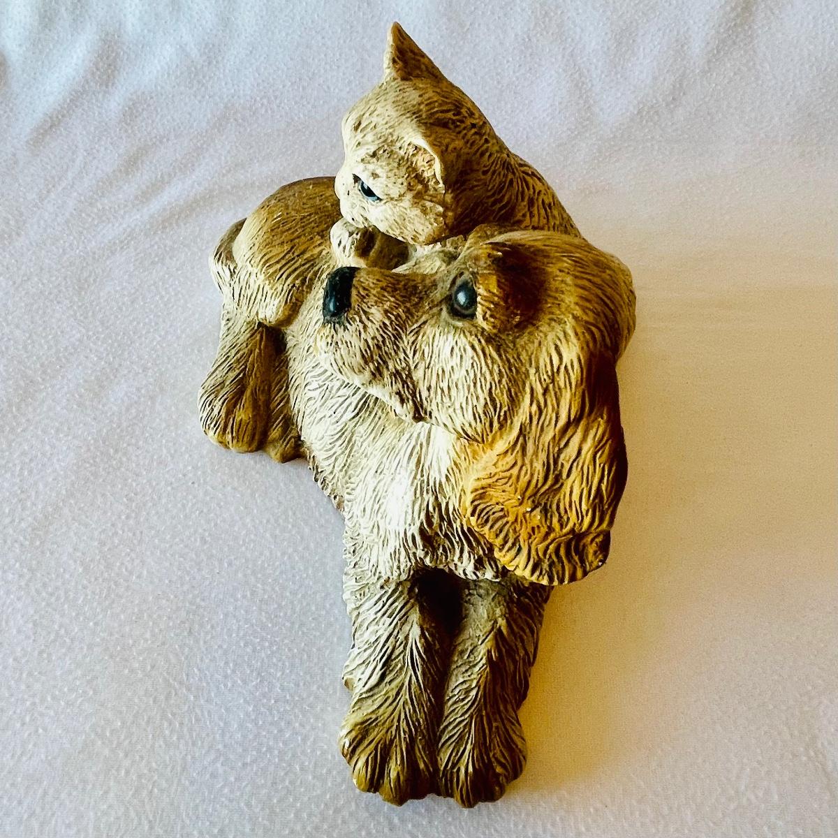Lot includes 4 adorable sculptures that’s could be displayed inside or outside. Pieces ranging in sizes, smallest being Boy and Turtle 8”L x 6”W x 5.5”H. and largest being the Girls Dancing 8”L x 5”W x 12” H. Dog and kitten sculpture is made from resin. Boy and Turtle is hand painted solid plaster. Girls Dancing has a natural finish. One of the legs has a slight surface crack. Crack does not go all the way through. Red Tabby Cat is a Sandicast sculpture. All pieces are in good condition.
