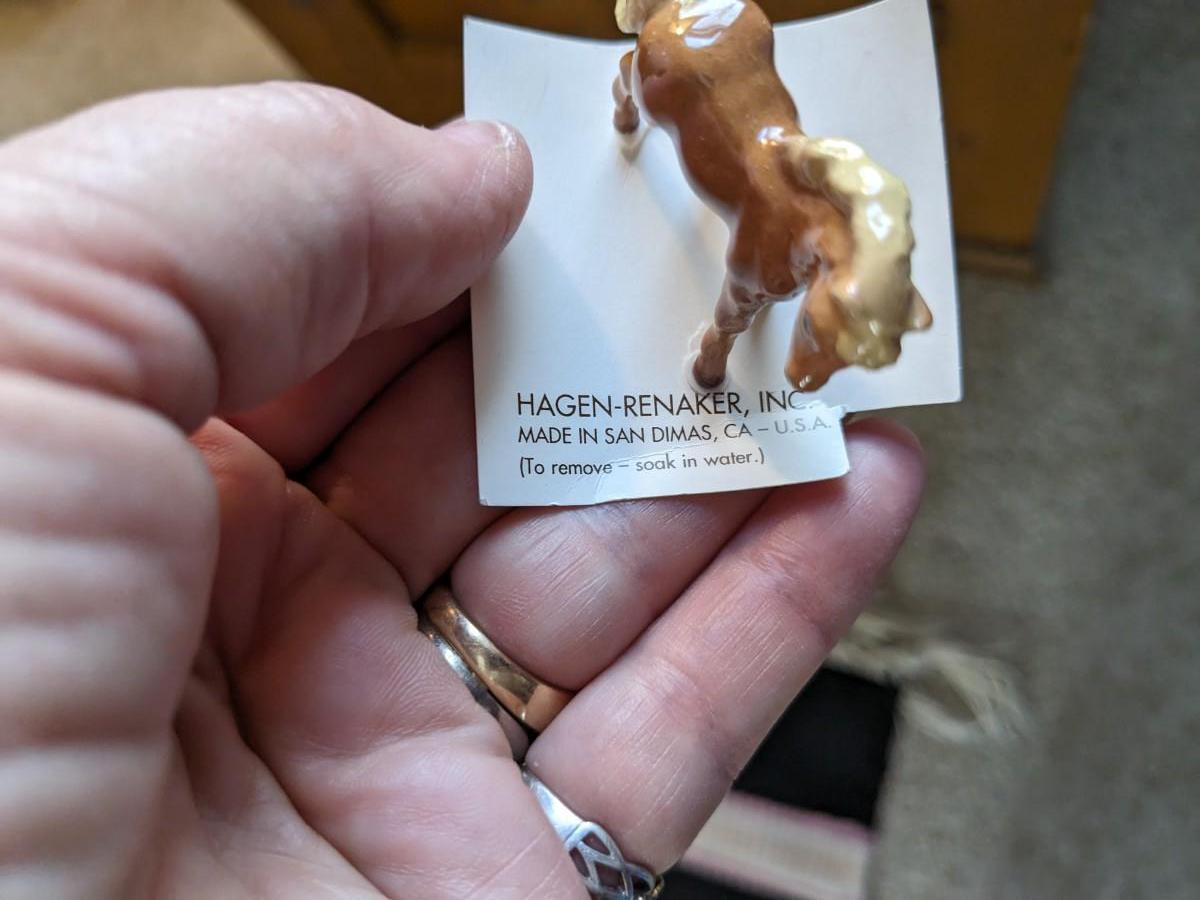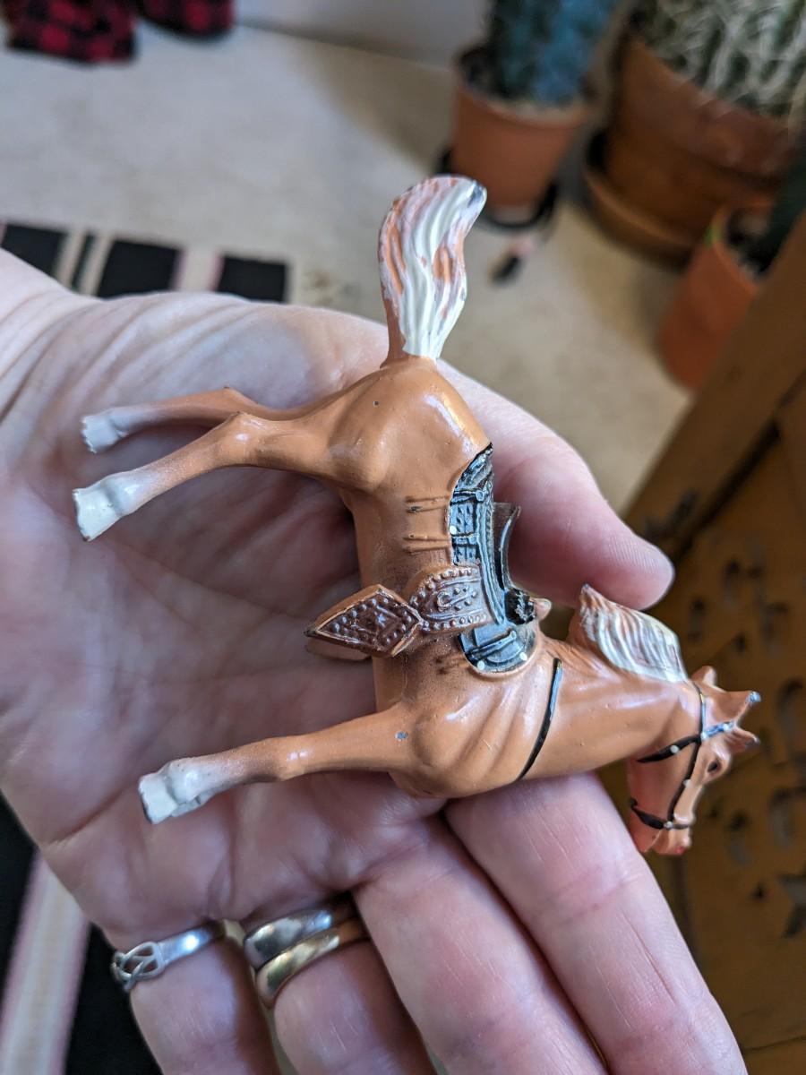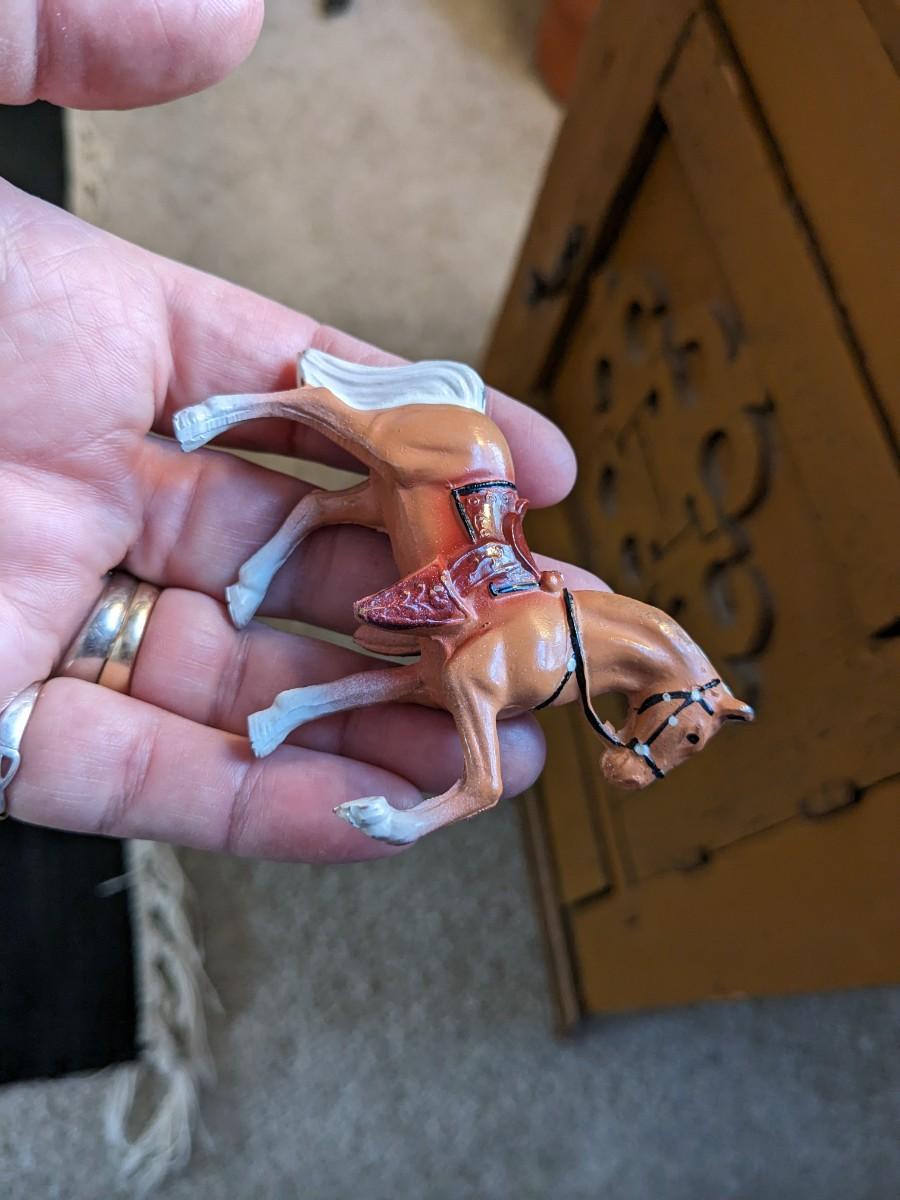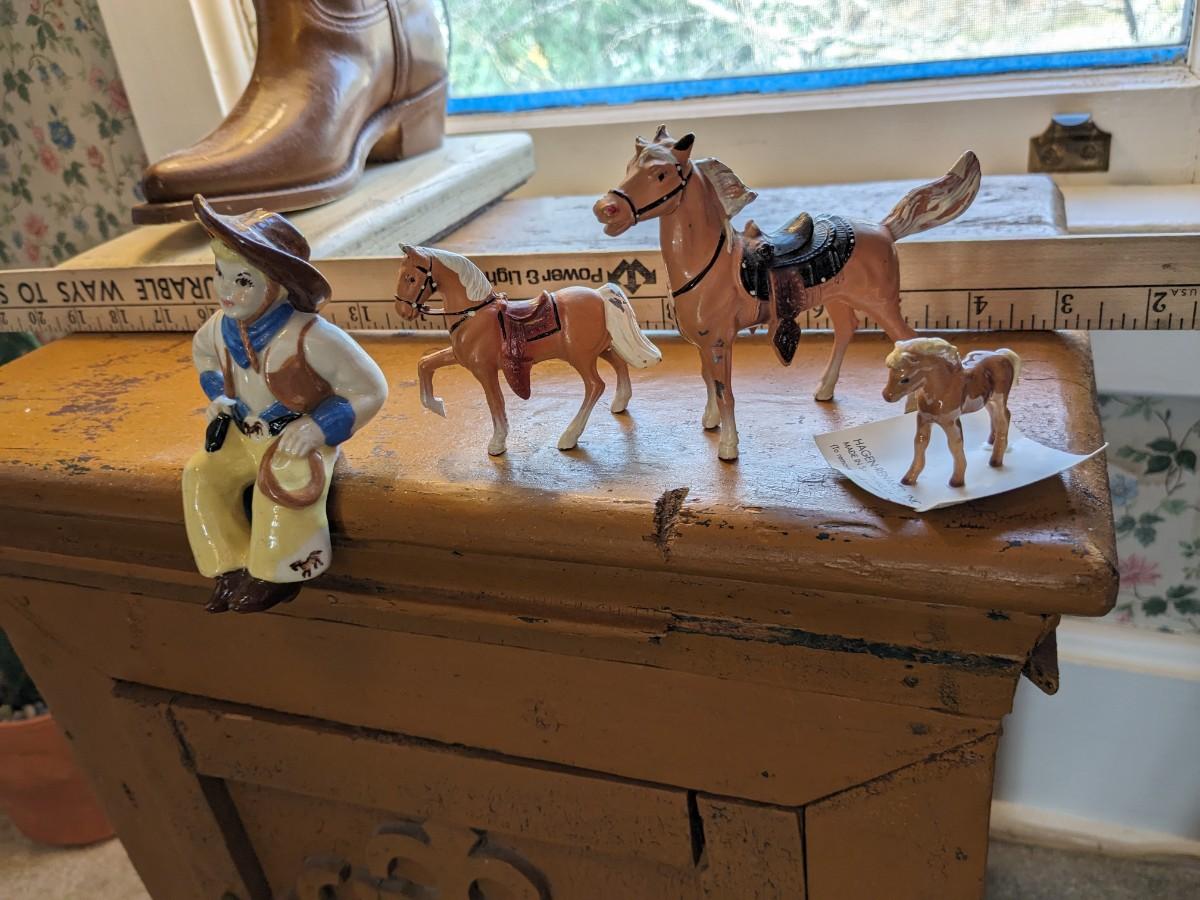 Adorable Vintage Ceramic Cowgirl and Small Horse, 2 Metal Cast Horses