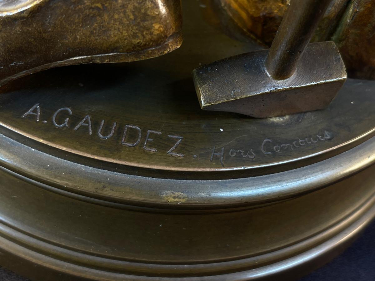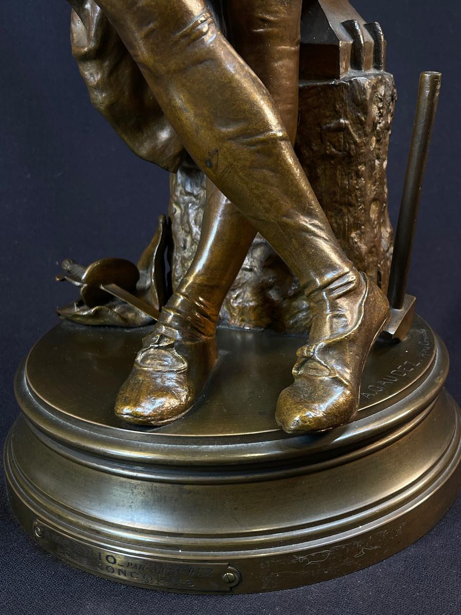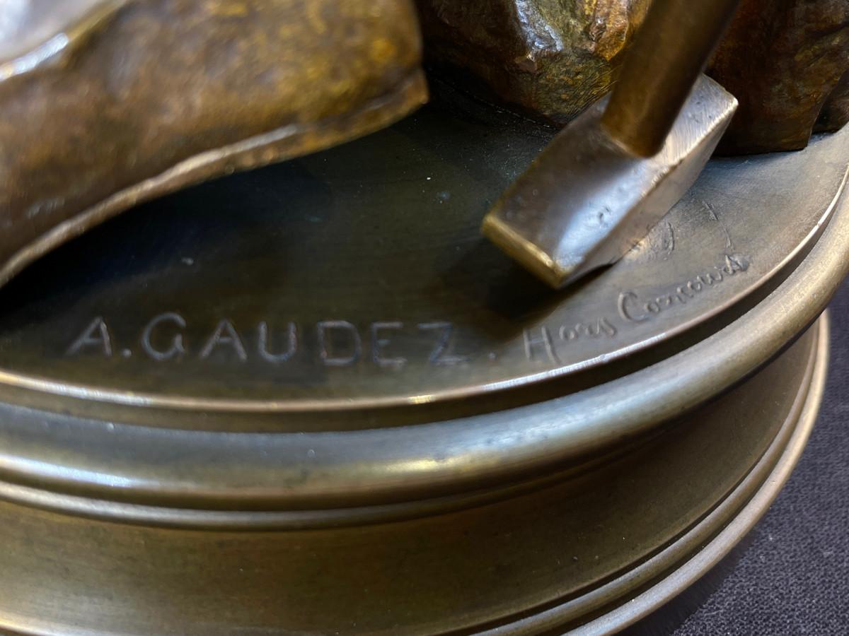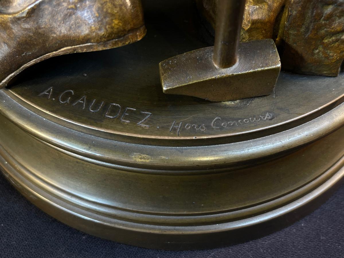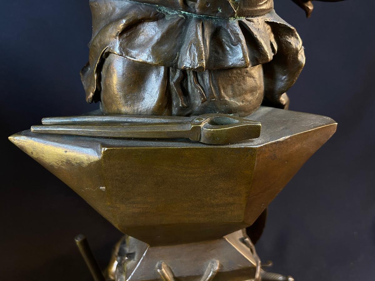 Created by well-listed and noted sculptor, Adrien Etienne Gaudez, the solitary figure is crisply cast and chased, even the tiniest details filed by hand for a flawless finished surface.  The sculpture is finished in a rich brown chemical patination shows hints of the more golden bronze hues in edges of relief. “¨“¨The figure shows a practiced and experienced smith, posed with his forging hammer, his leather smock folded back exposing the legs, each ripple and crease of the garb captured with stunning accuracy. Each tool and the scrolled plans scattered across the naturalistic base are nearly perfect representations of reality. “¨“¨