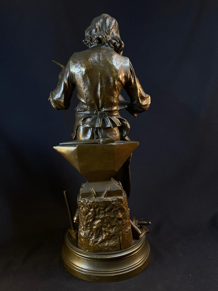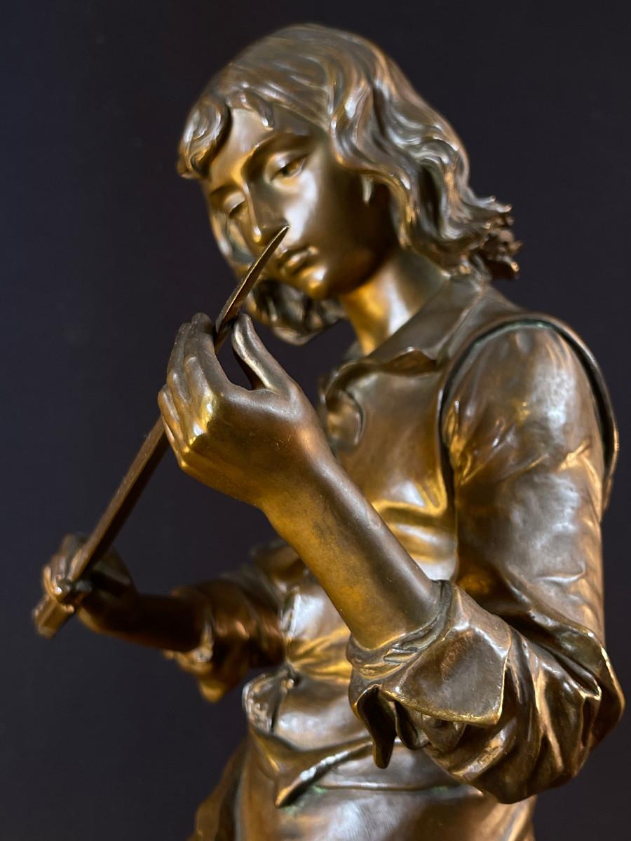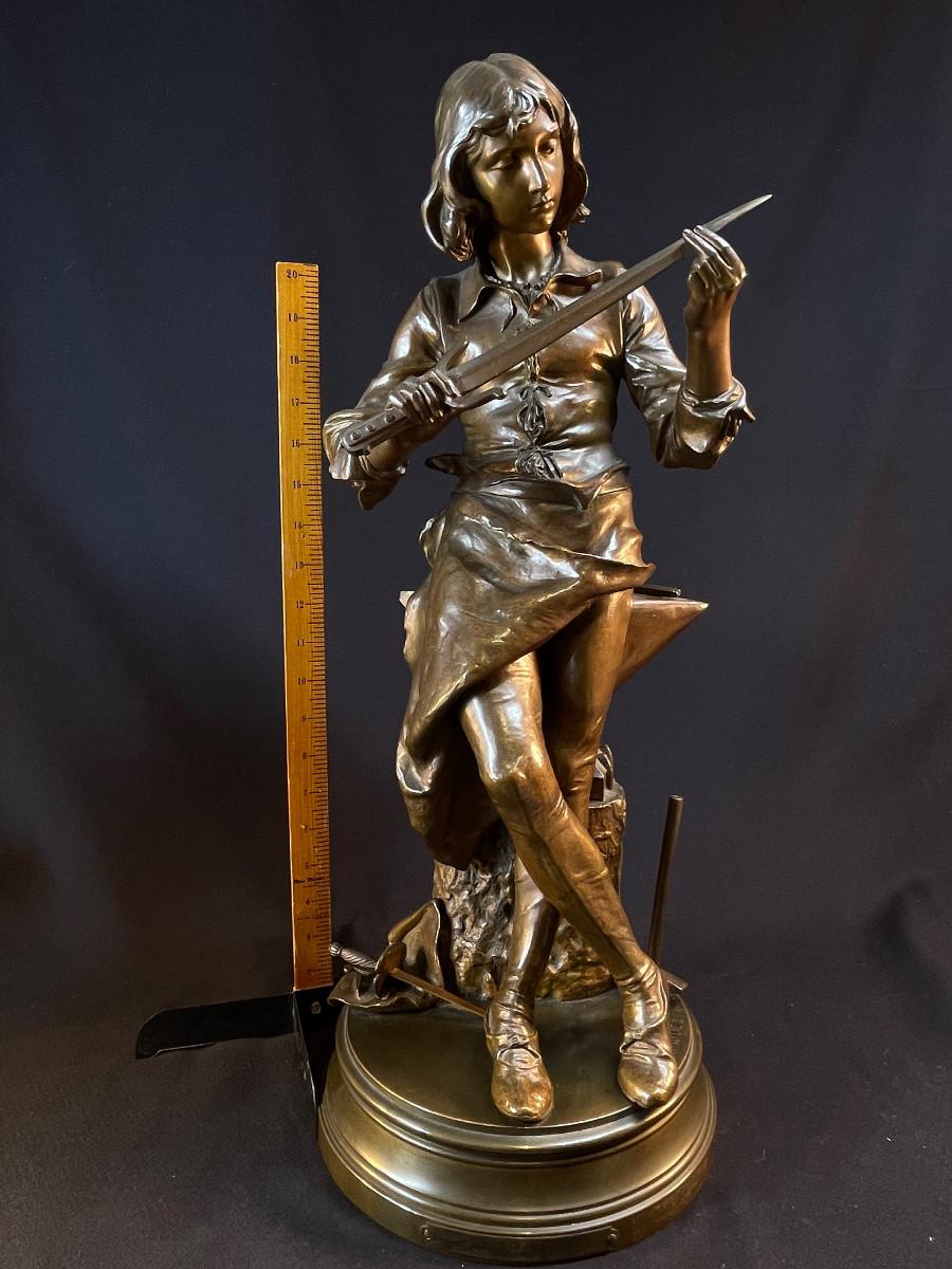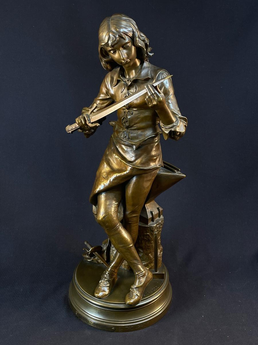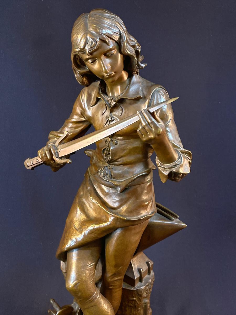 The subject item a an exceptional antique French bronze sculpture posing a young sword maker examining how to remedy a damaged sword. The slightly bent tip of the sword is original to the casting - not later damage.