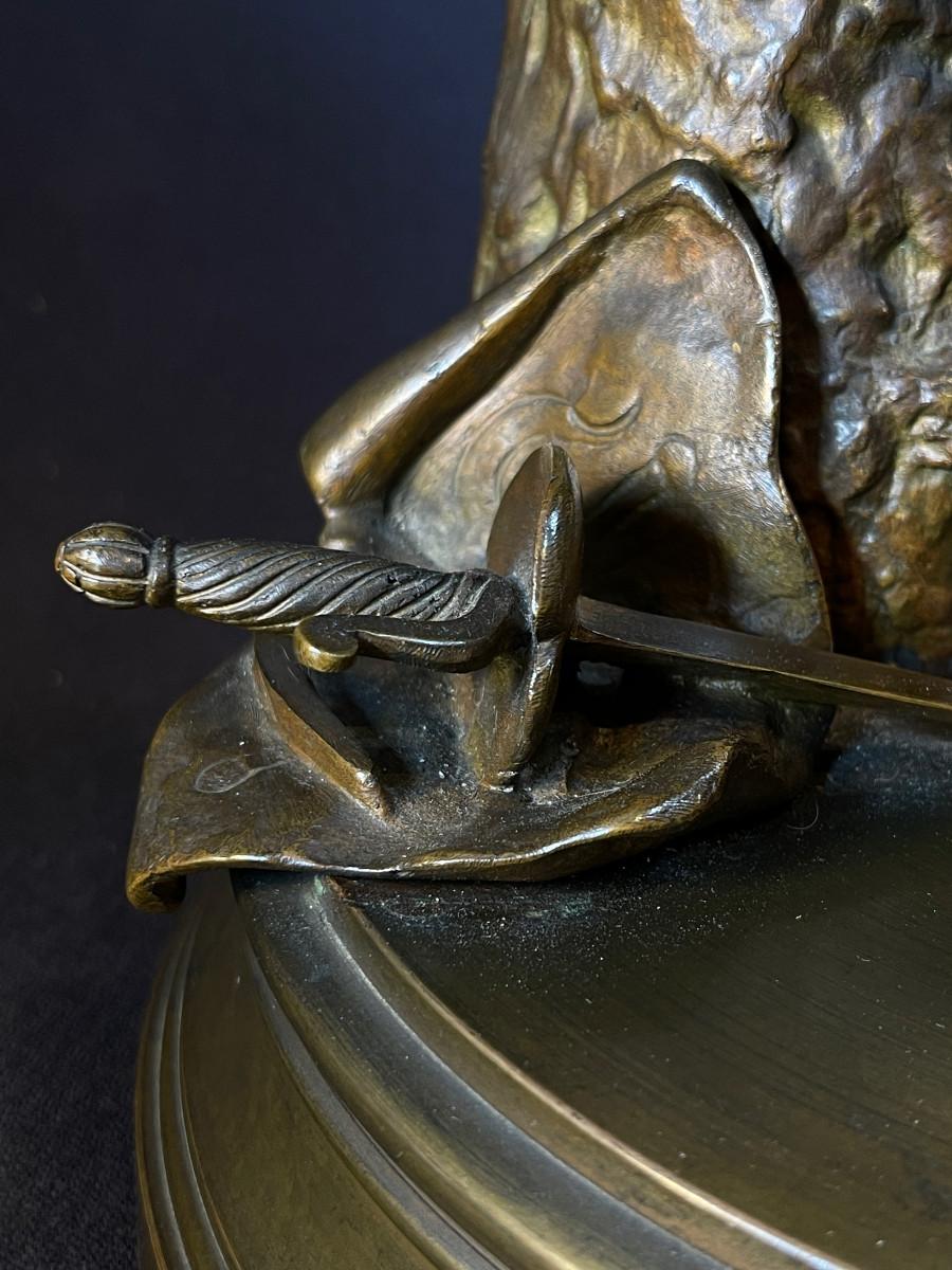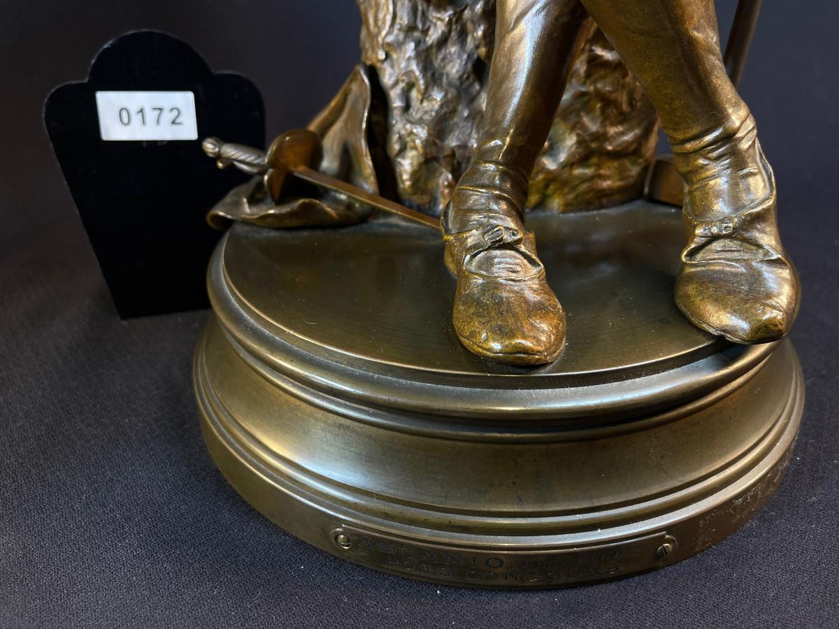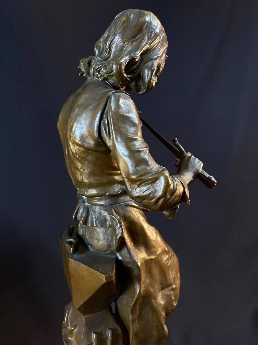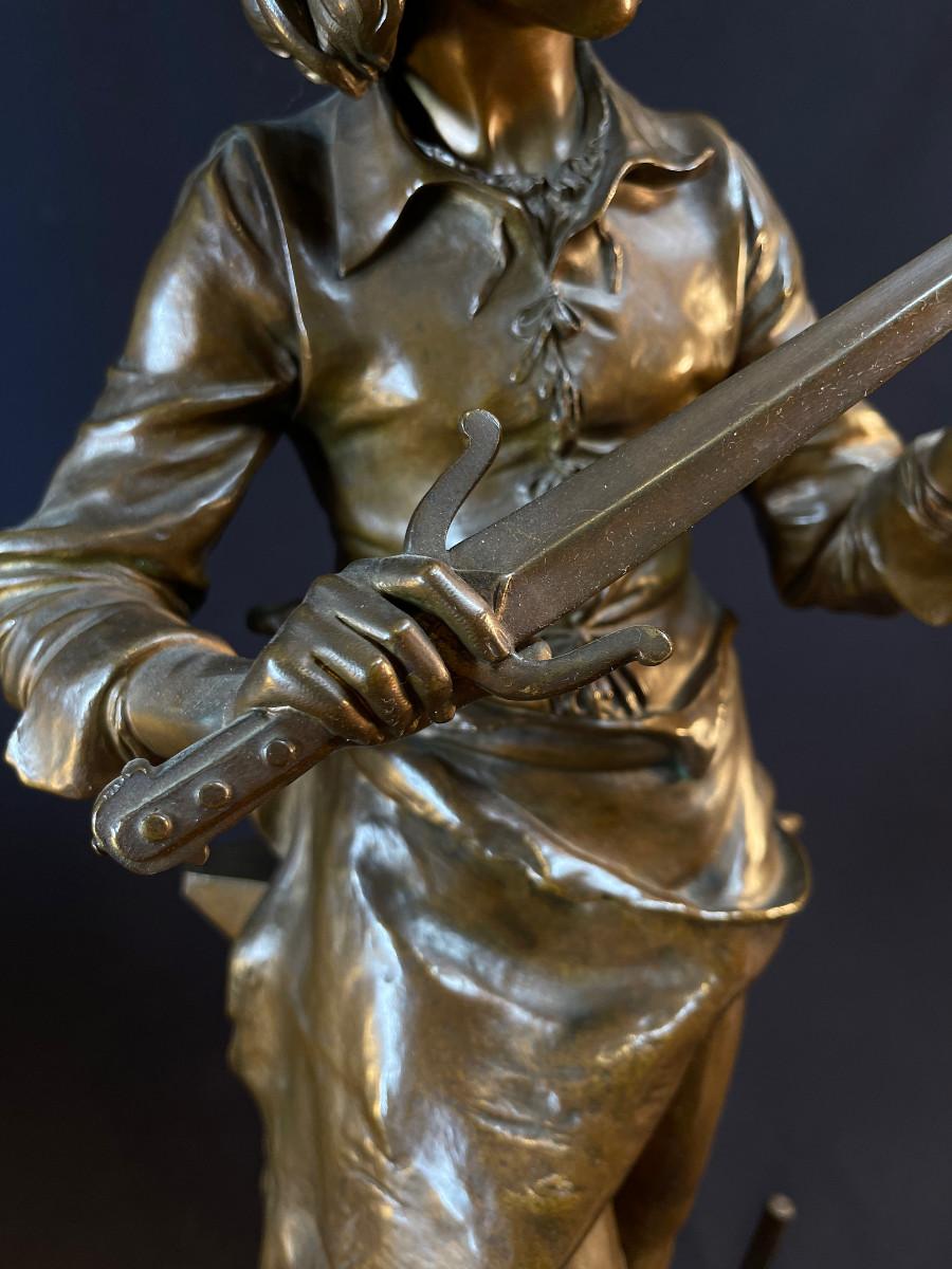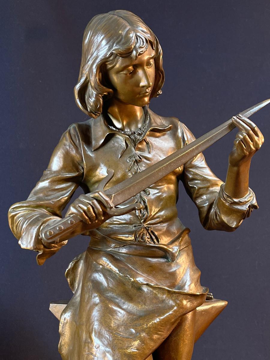 The subject item a an exceptional antique French bronze sculpture posing a young sword maker examining how to remedy a damaged sword. The slightly bent tip of the sword is original to the casting - not later damage.