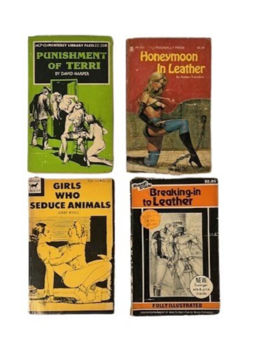 Paperbacks. Includes Punishment of Terri, Girls Who Seduce Animals, Honeymoon in Leather, and Breaking in to Leather. Total of 4 books from the 1970s. Age related wear.