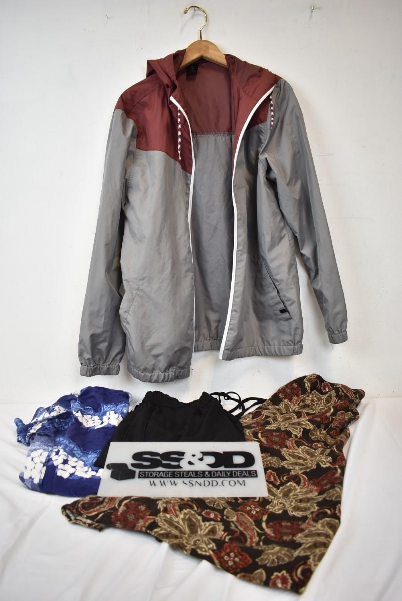 Adult Clothing, 4Pcs: Mens Windbreaker-M, Womens Bathing Suit Wrap, Skirt-10, Pants-12