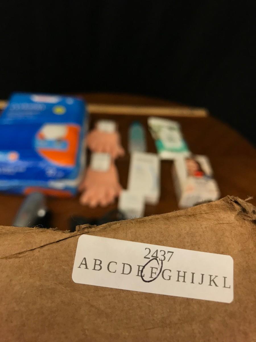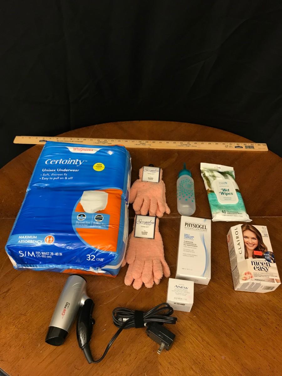selfcare: adult diapers s/m, spa gloves, hair dye, blow dryer travel size, hygiene products;