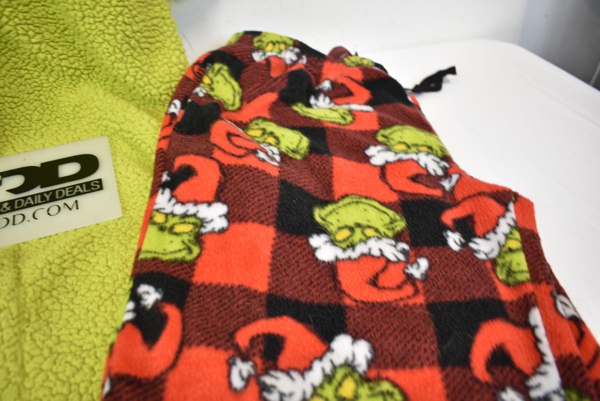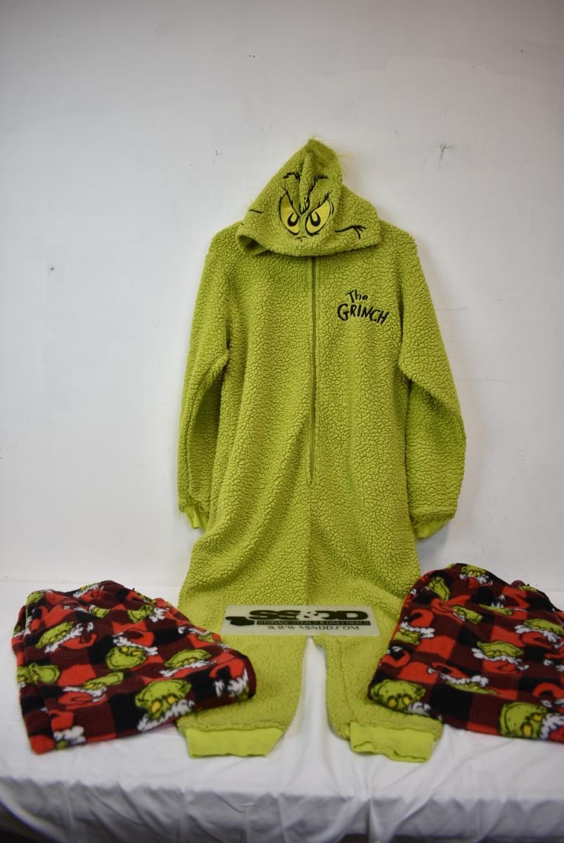 Adult Dr. Seuss Grinch PJs: 2 prs pants size XL, 1 hooded onesie no feet, size S