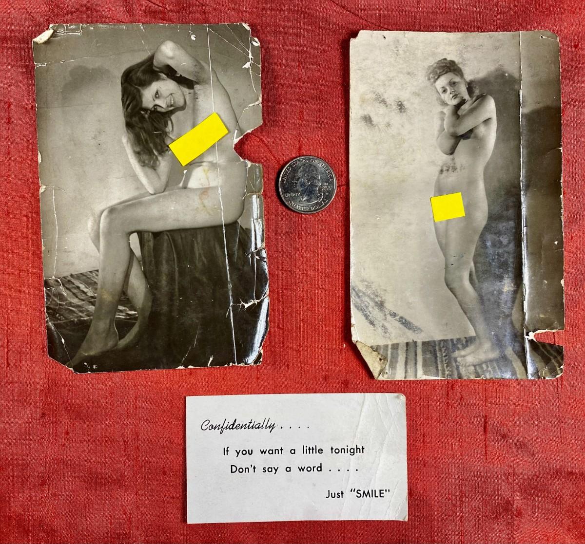 This auction lot is for "ADULT" War Photos with a Calling Card. 2 WWII (Girlie) Photos - France 1945. The Photos measure about 5-1/2-inches by 3-1/2-inches. These items are well worn. (We've covered some areas of the photos so as not to offend.) Also includes a nifty Calling Card - "Just Smile"