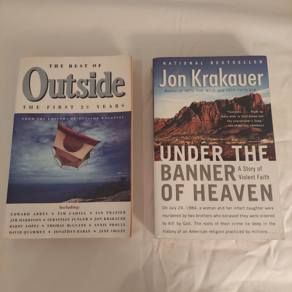 Lot includes 50+ novels about adventure hiking and exploration. Some are fiction stories based on real places. Some are non fiction accounts and memoirs. There are both hardback and paperback books. Collections by Edward Abbey, Farley Mowat, Barbara Kingsolver and more. Please see photos for details. Shipping available