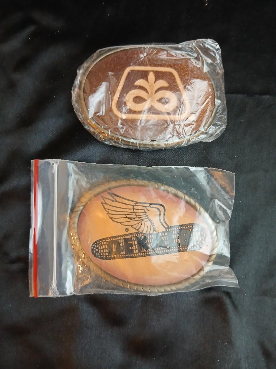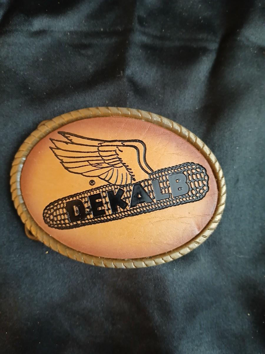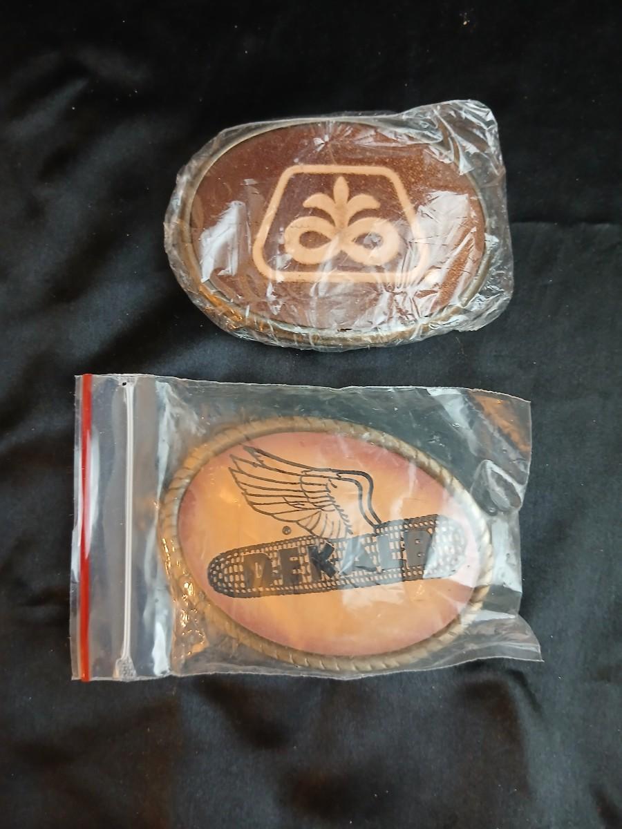 Advertisement buckles = Dekalb advertising belt buckle featuring the "flying corn cob" logo. & a Pioneer Seed Company oval leather inlay belt buckle