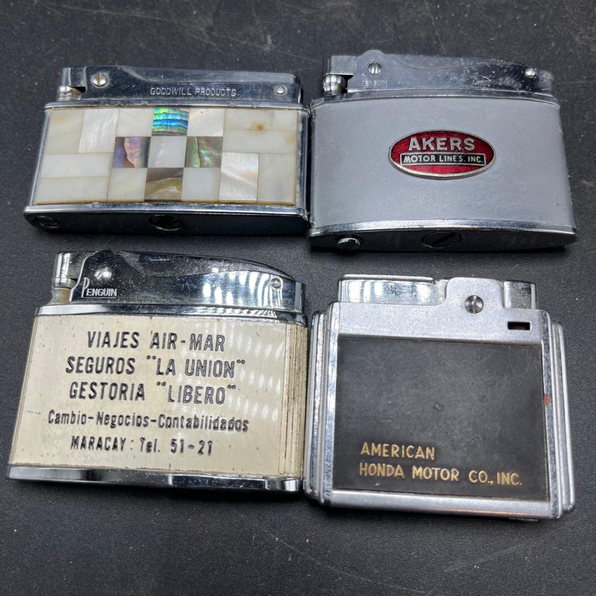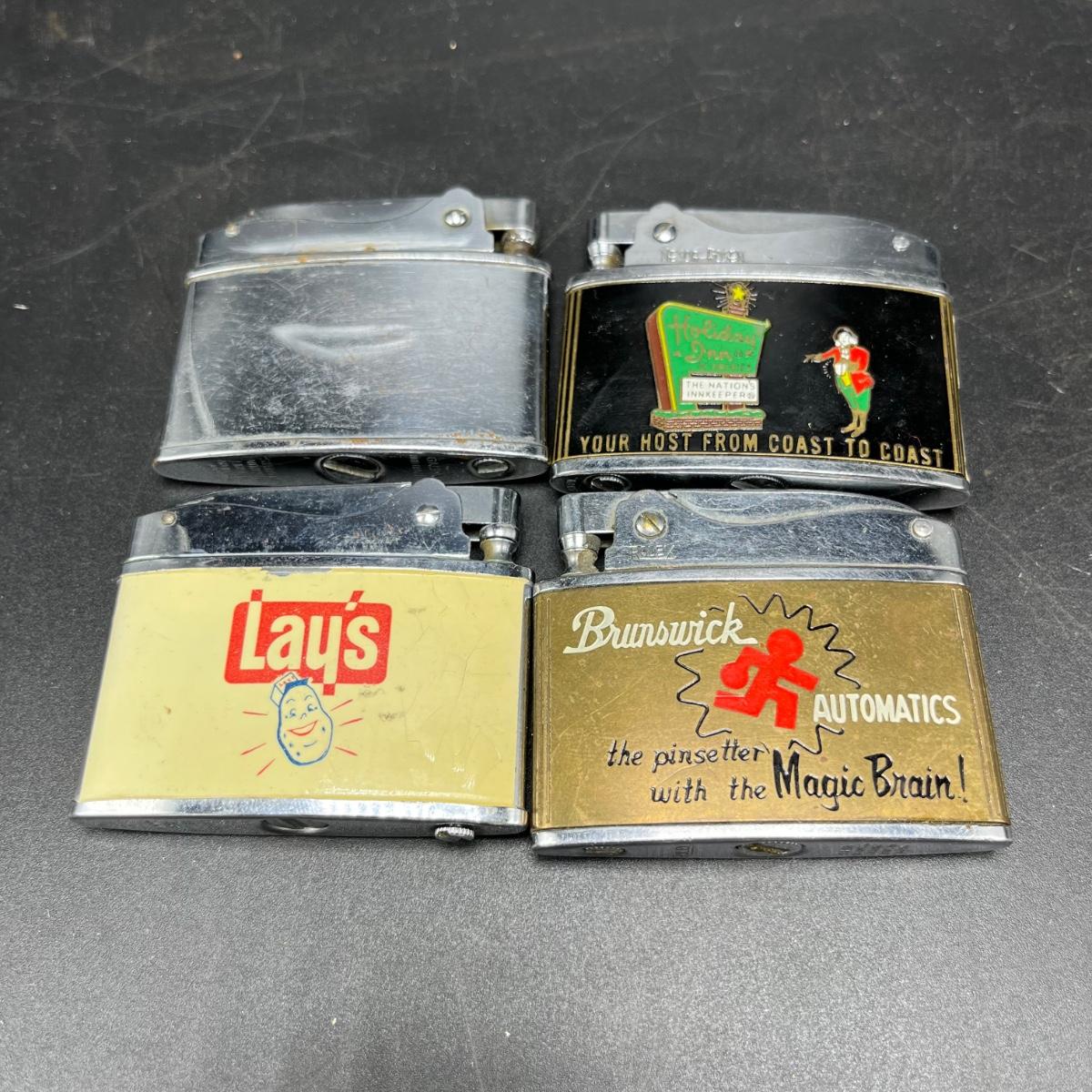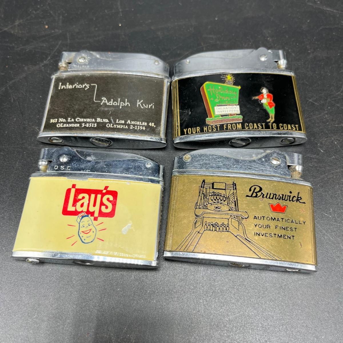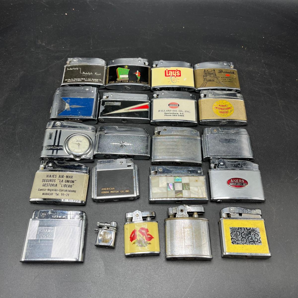 Lot contains over twenty lighter’s including Holiday Inn, Lays, Brunswick, Akers, American Honda Motor Co. Inc. and more. Lighters are made by Schick, Penguin, Firefly and more.