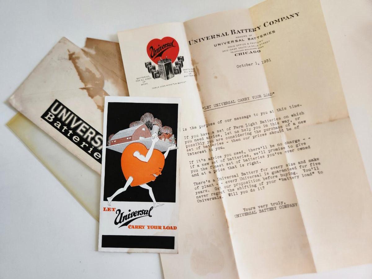 This auction lot is for an Advertising Letter for a Universal Farm Storage Battery. This letter is dated 1931 and includes both a letter and a product brochure. Interesting ephemera - especially for the vintage farm items collector.