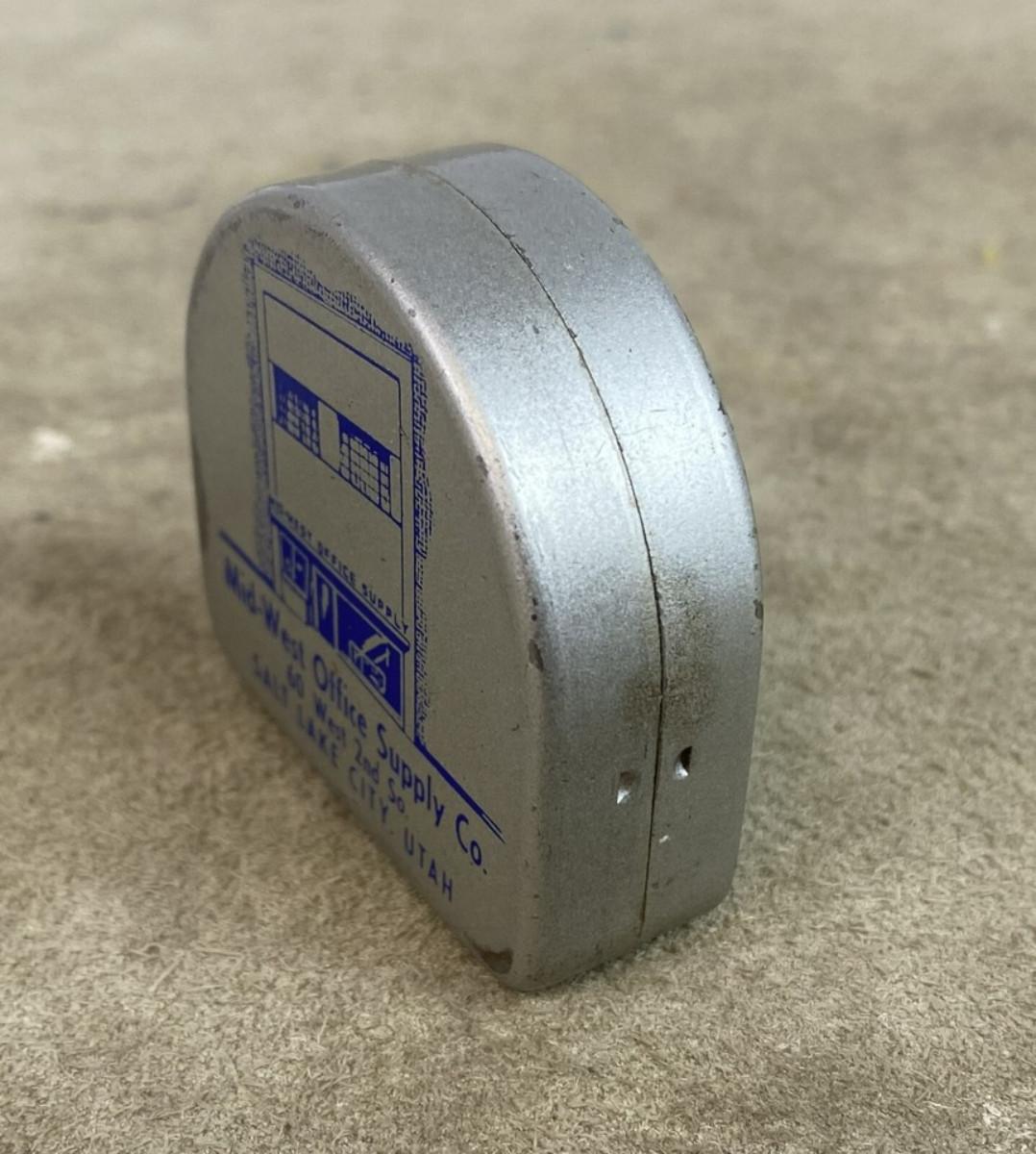 vintage advertising steel tape measure for MID-WEST OFFICE SUPPLY CO. at 60 West 2nd So. SALT LAKE CITY, UTAH...Aluminum case...72"/6' ruler...a couple of minor patches of surface oxidation with age...Looks circa 1940s-1950s...from the VERNON CO. of Newton, IA..Made in U.S.A..