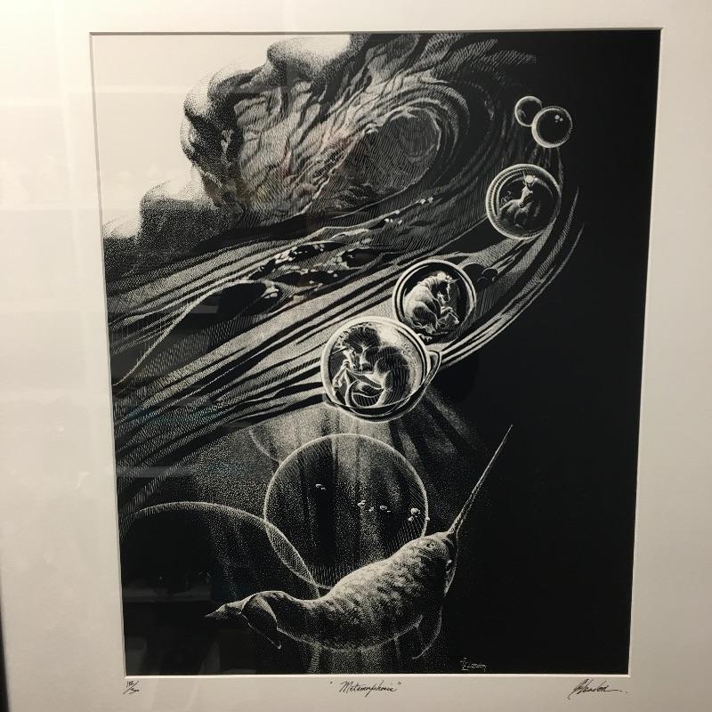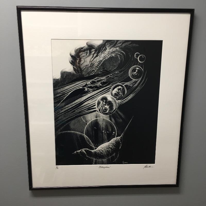 A.E. London framed print titled Metamorphosis that ties the ancient legend of the unicorn with the strange reality of the Arctic Narwhal. A truly thought provoking work of art.