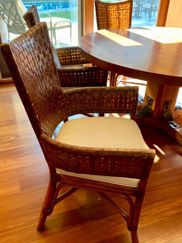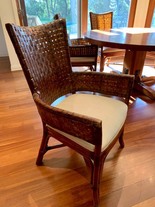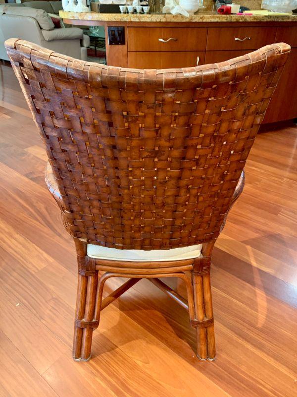 Set of 6 leather basket weave & rattan armchairs. Seat cushion. Color is worn in some areas but leather is strong. No breaks on any of the chairs. 38" tall. USED IN STAGING PICK UP AFTER HOUSE SELLS AND ESCROW CLOSES.
