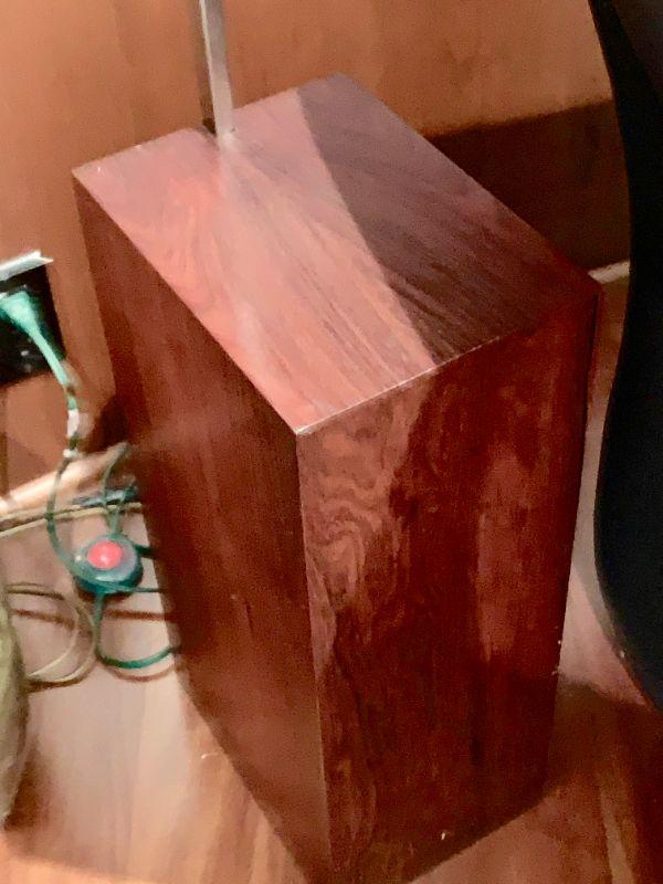 MCM over reaching arched chrome floor lamp Solid wood cube base. 2 small dings on shade.