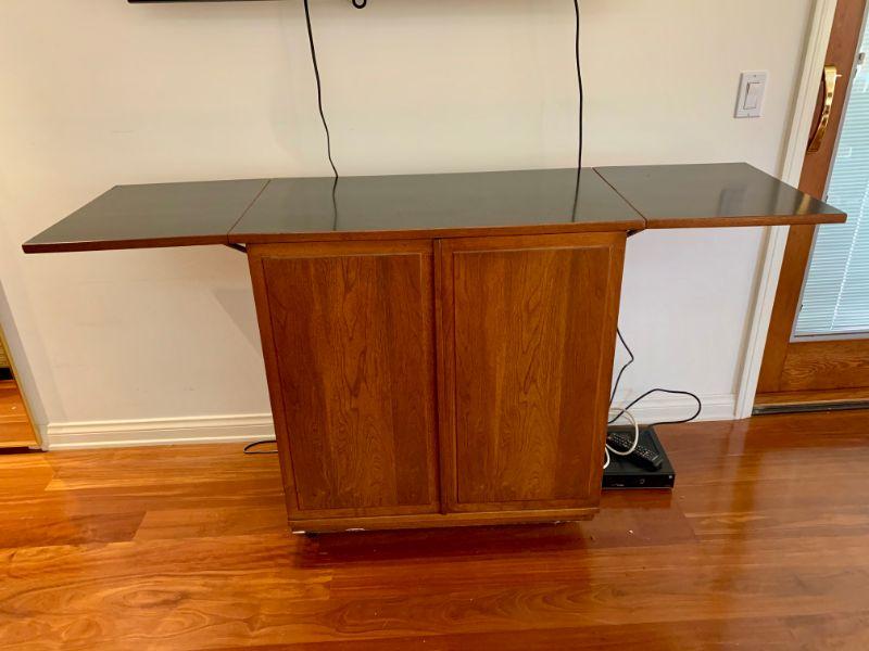 MCM Vintage Danish Modern drop leaf rolling bar cabinet. Black laminate top, 2 doors ,shelves and drawers inside. Finished back. 34" wide 64" with leaves up