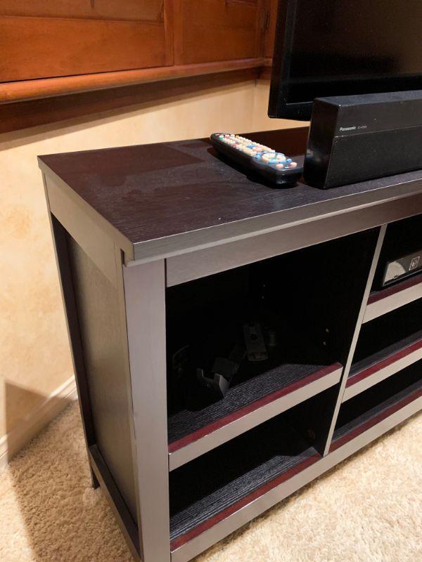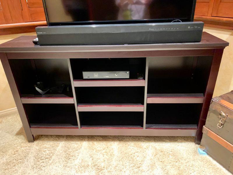 Contemporary wood console stand for TV & other media. 54" x 30" x 29" USED FOR STAGING AVAILABLE FOR PICK UP AFTER HOUSE SELLS AND ESCROW CLOSES.