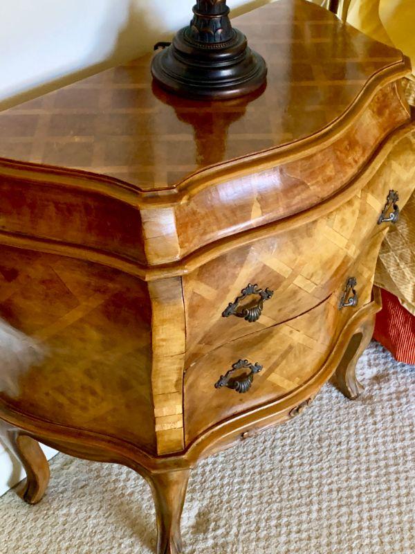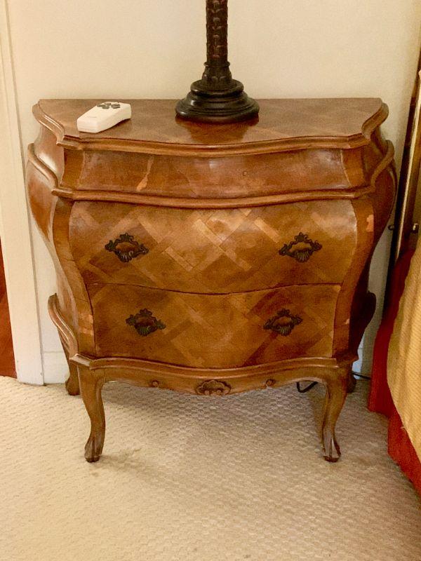 Reproduction Bombay style 2 drawer side table. Bedside cabinet. Patterned inlay design.