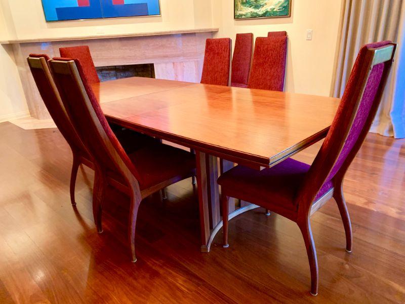 Beautiful MCM custom made walnut dining trestle table with 8 upholstered high back chairs and 2 leaves. Fully extended with the added leaves it is 9 feet long and 40 inches wide at the center. The chairs have been recovered at some time during the past 10 years. Very well cared for this dining set is made to last for generations to come!
