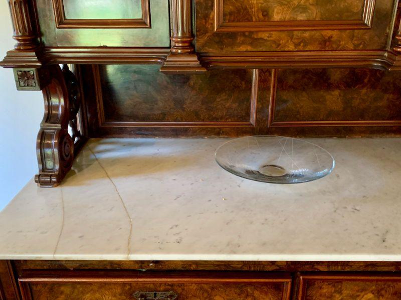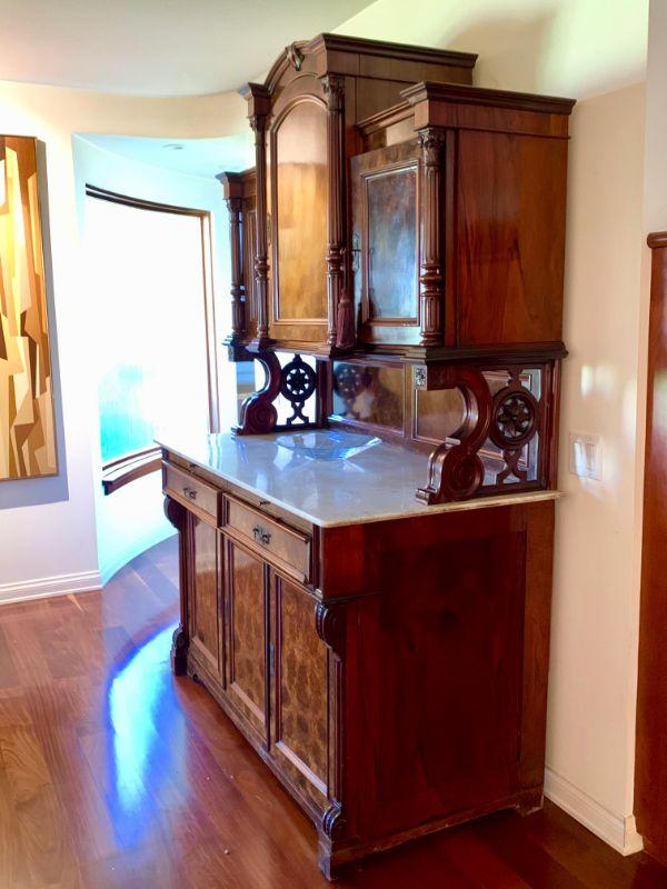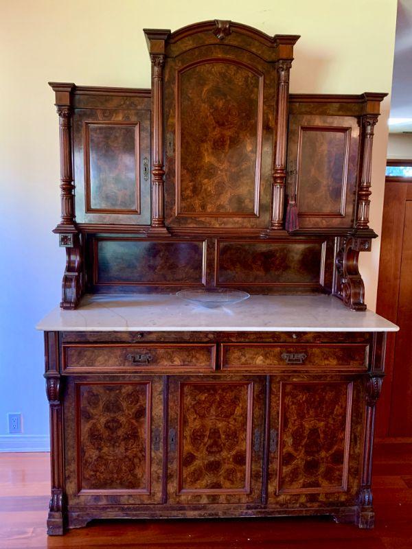 Monster antique burled wood breakfront stands 7'1" tall 5'9" wide and 28" deep. Three doors across the top with a tall center, supported by cut out carved brackets, white marble top, 2 drawers, and 3 doors beneath. Large amount of storage and marble top makes a great serving space. The wood has been lovingly cared for and is in good shape. Marble is cracked in several places. All original hardware including a key that locks doors. CAN BE PICKED UP WHEN HOUSE SELLS AND ESCROW CLOSES.