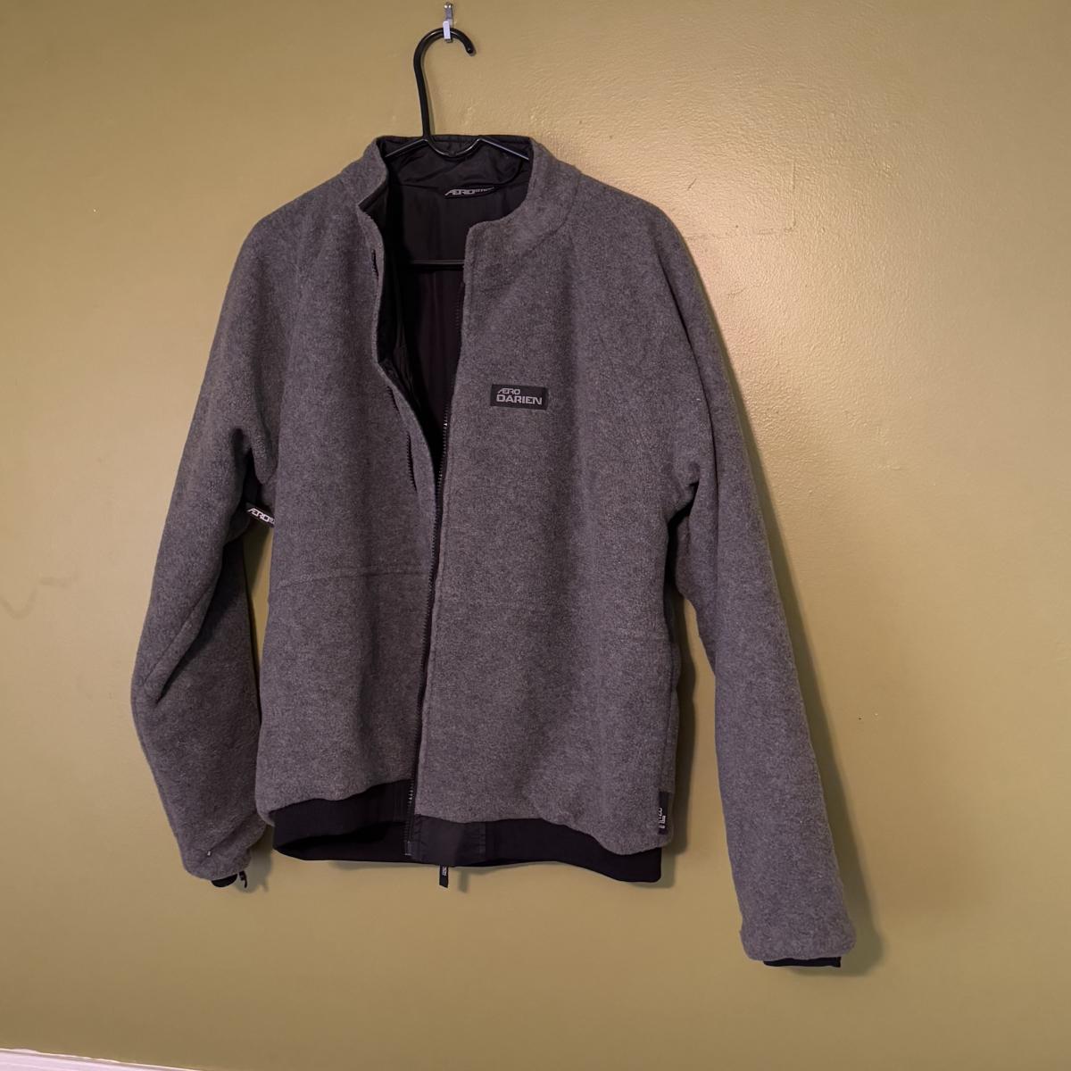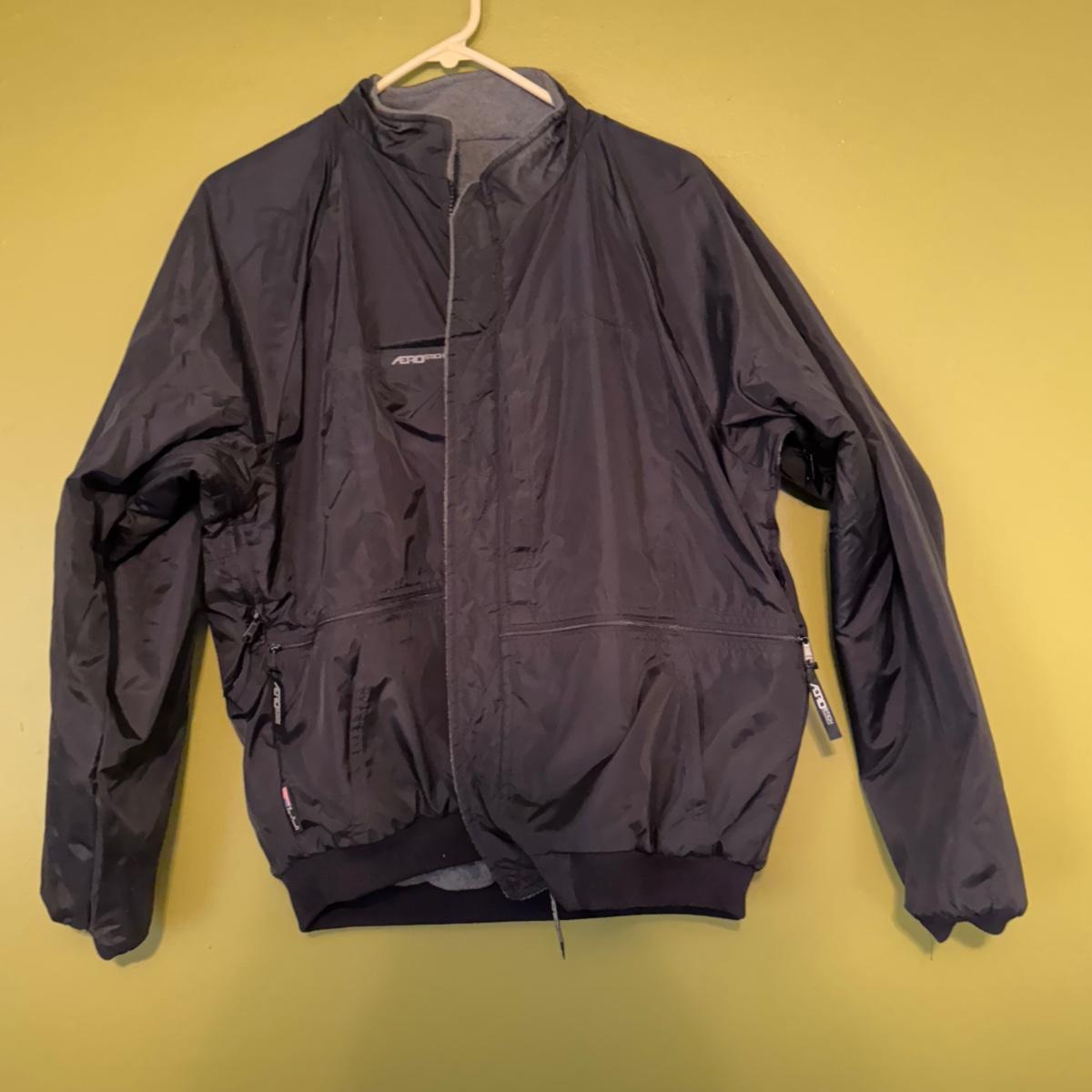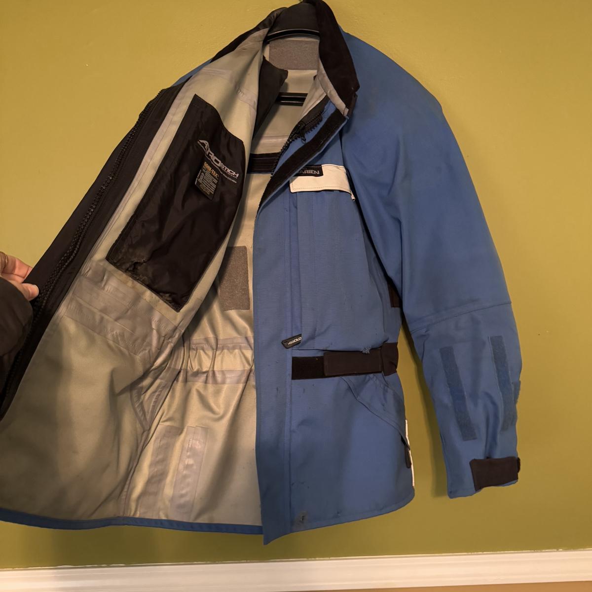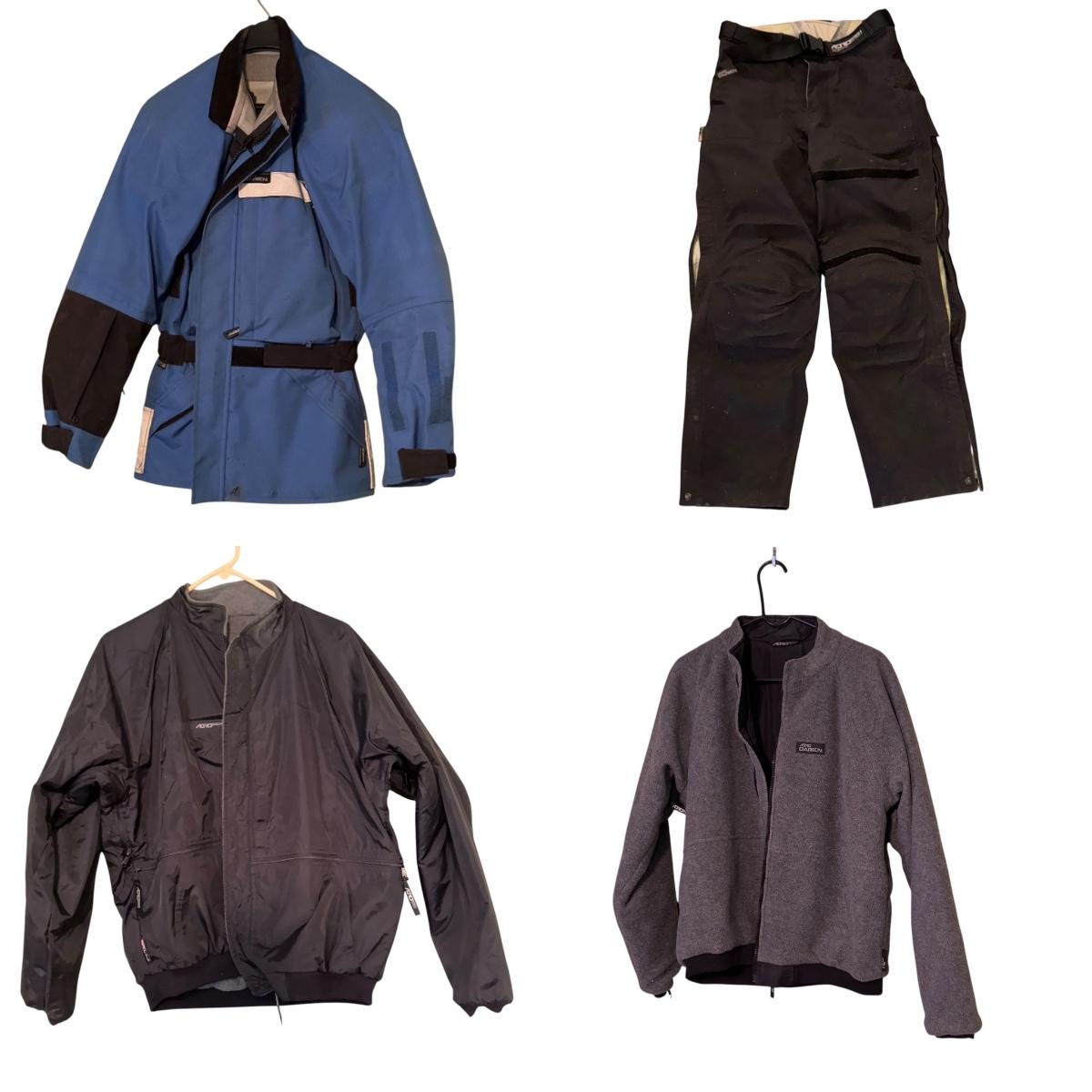 Lot includes one reversible Aero Darien fleece in a size large and an Aero stitch motorcycle jacket in a size large. Also included is a pair of Aero Darien pants in a size 32. The blue jacket pictured comes with a sealed bag of instructions on how to care for the jacket, along with a few replacement pads. There is a small hole on this jacket - see picture included. Shipping available.