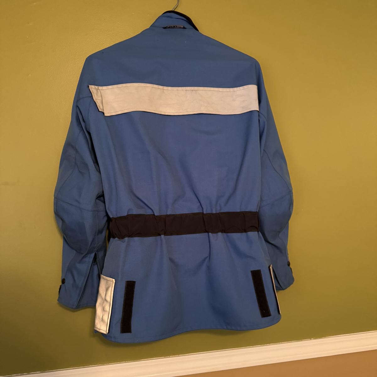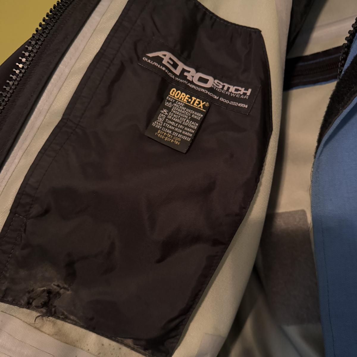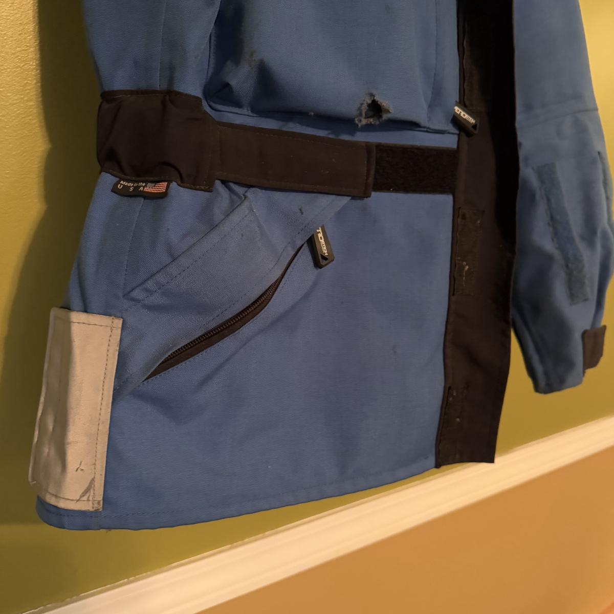 Lot includes one reversible Aero Darien fleece in a size large and an Aero stitch motorcycle jacket in a size large. Also included is a pair of Aero Darien pants in a size 32. The blue jacket pictured comes with a sealed bag of instructions on how to care for the jacket, along with a few replacement pads. There is a small hole on this jacket - see picture included. Shipping available.