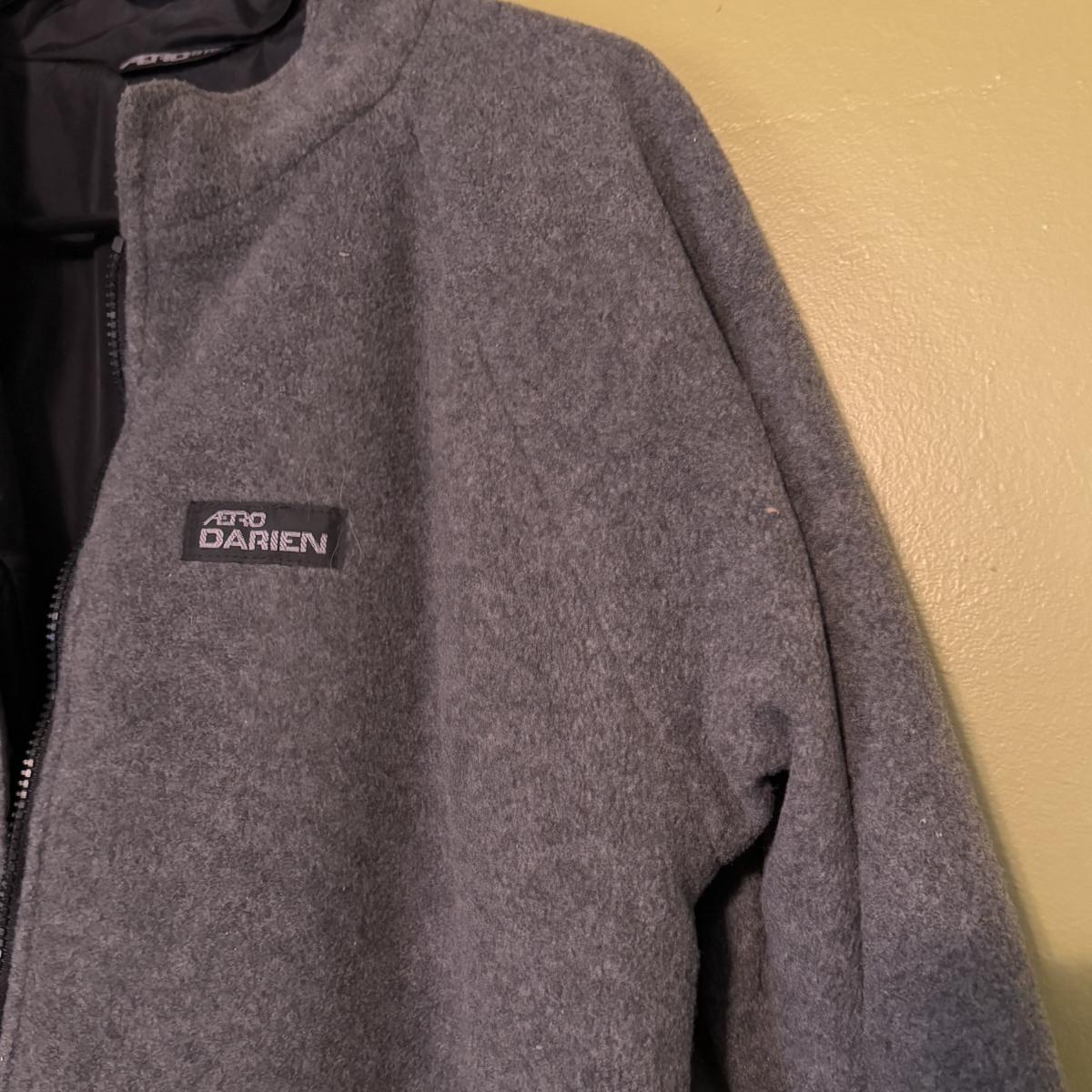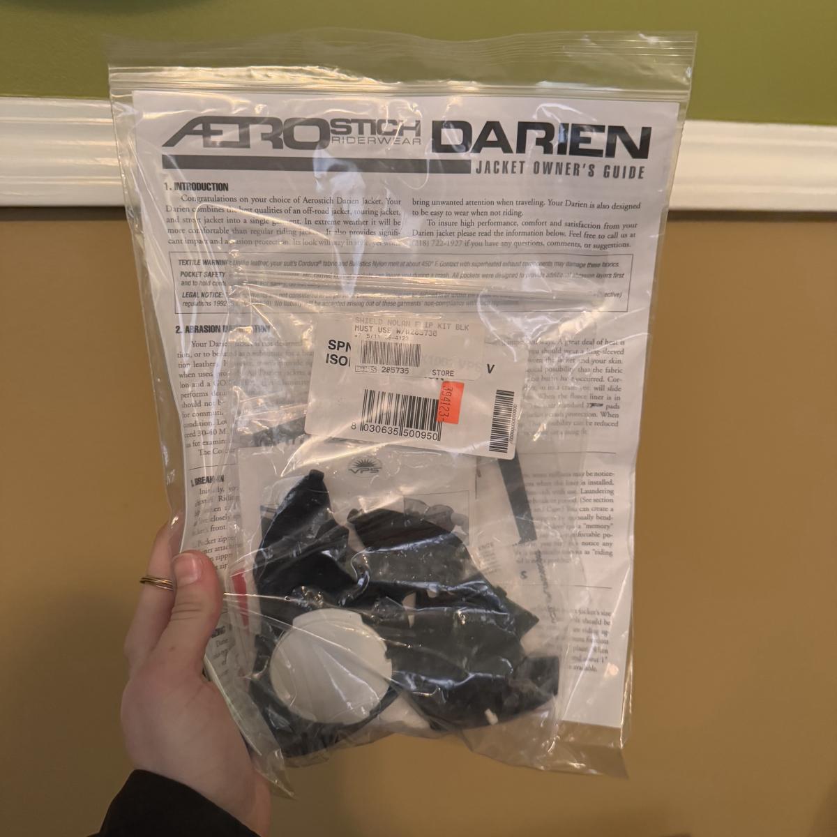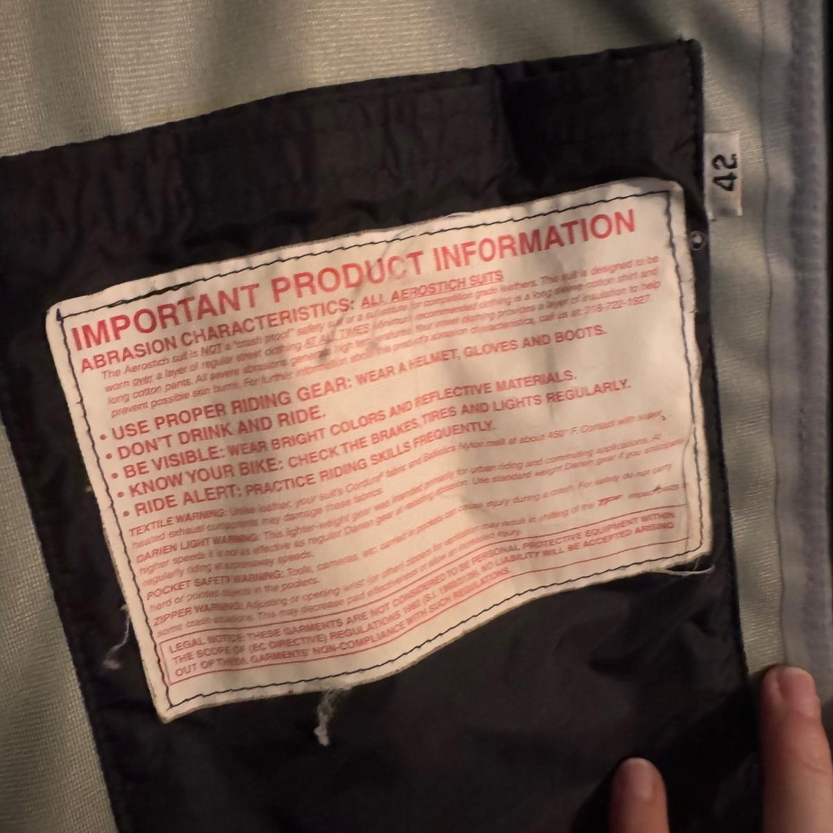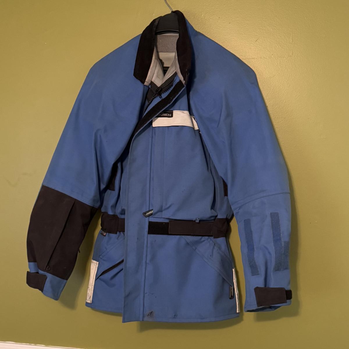 Lot includes one reversible Aero Darien fleece in a size large and an Aero stitch motorcycle jacket in a size large. Also included is a pair of Aero Darien pants in a size 32. The blue jacket pictured comes with a sealed bag of instructions on how to care for the jacket, along with a few replacement pads. There is a small hole on this jacket - see picture included. Shipping available.