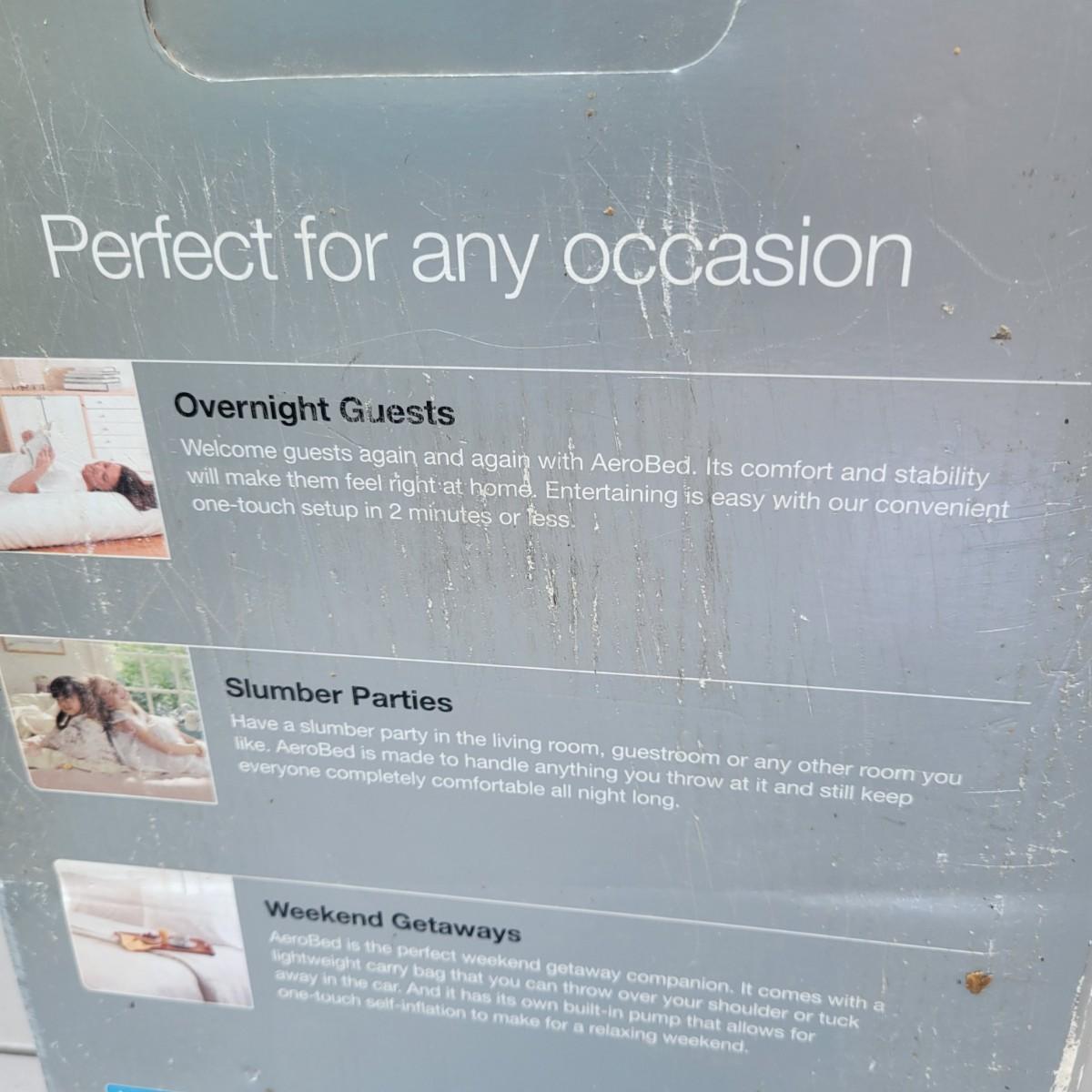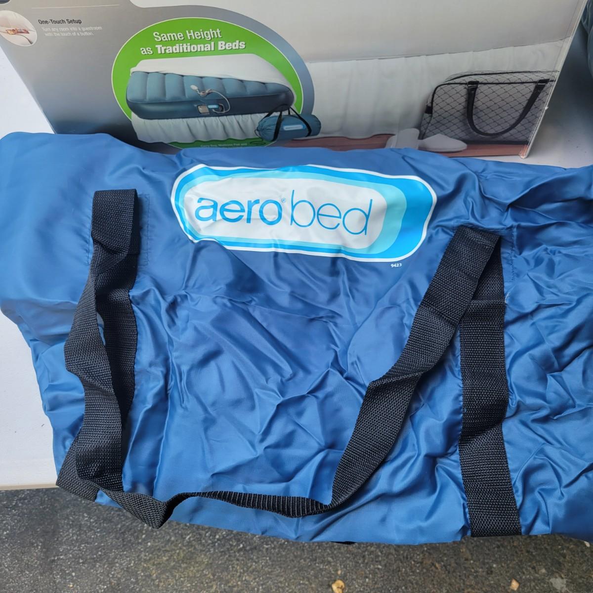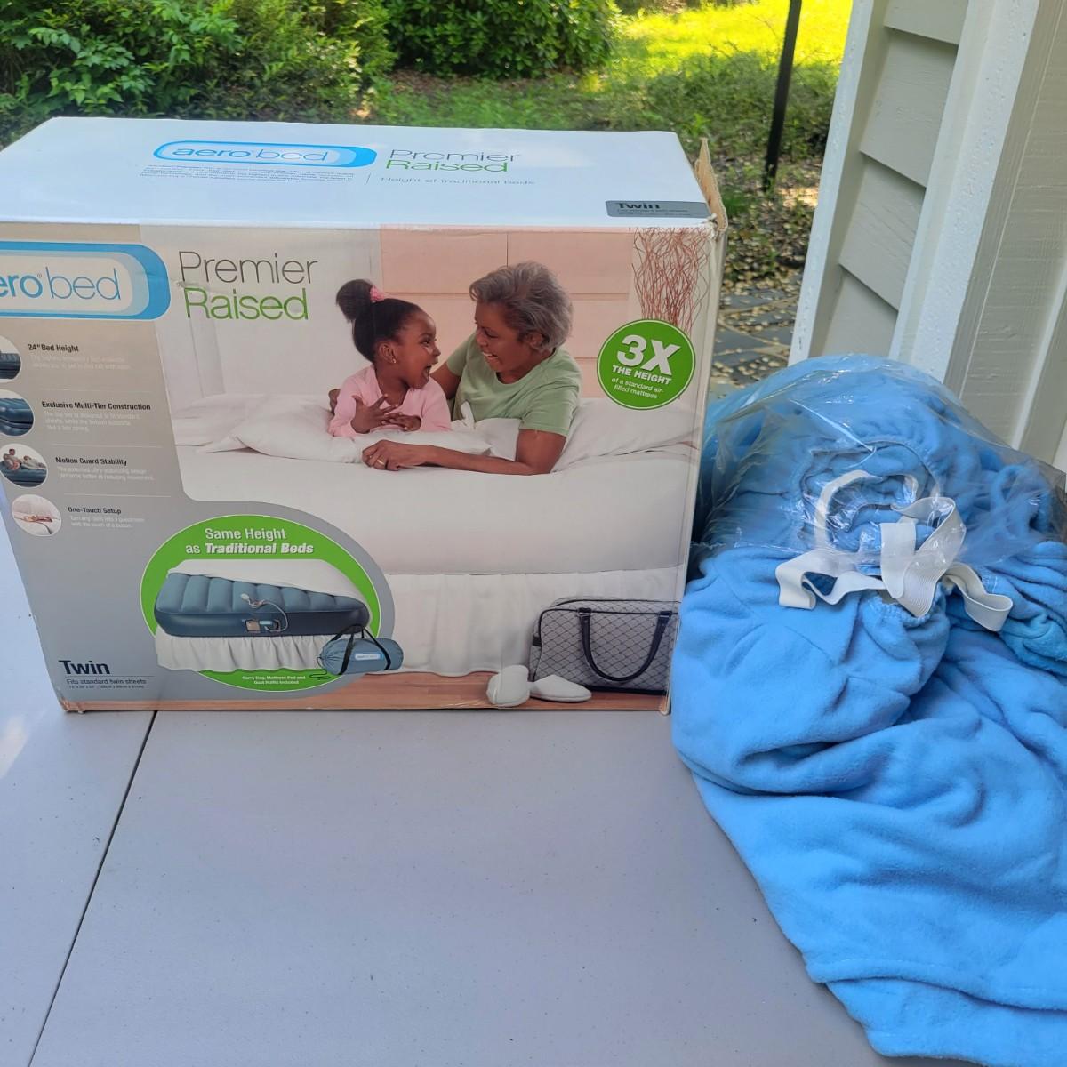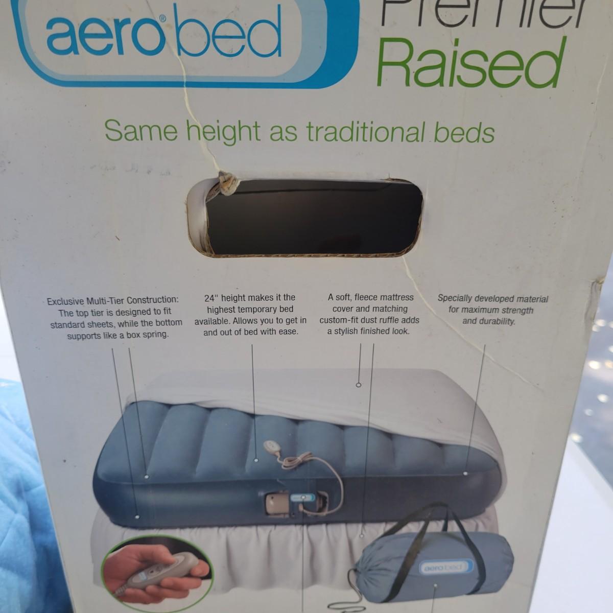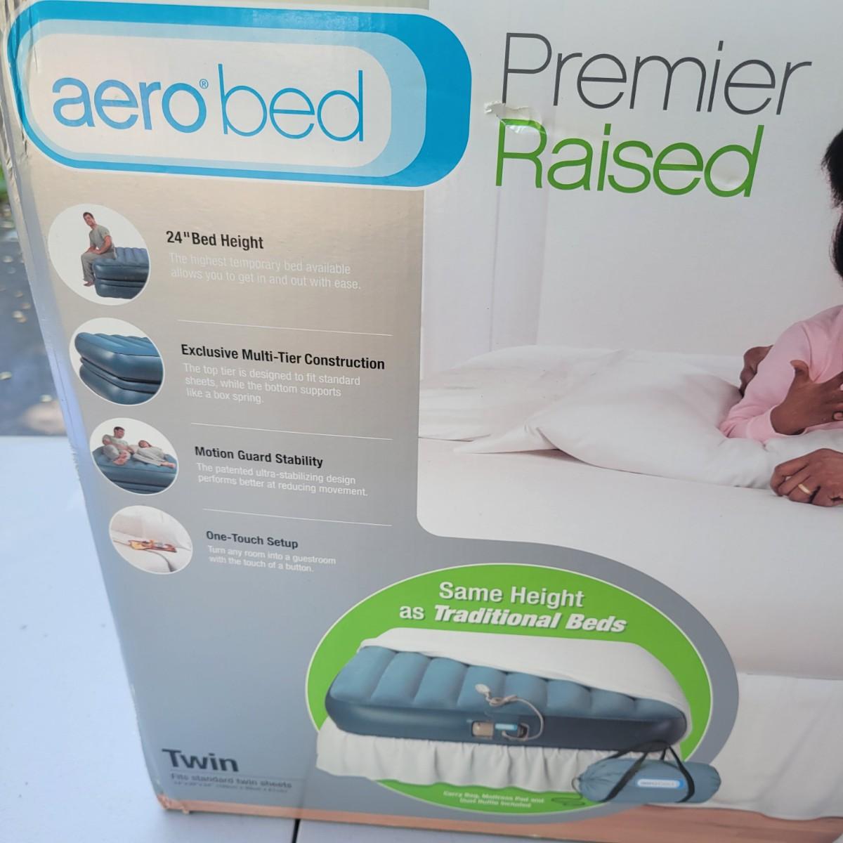 Aerobed Premier Raised inflatable bed. Twin sized, 24" height with built in ac pump. New and in original packaging. Also includes 2 fleece covers to fit bed and carry case, both appears to be unused. Local pickup only