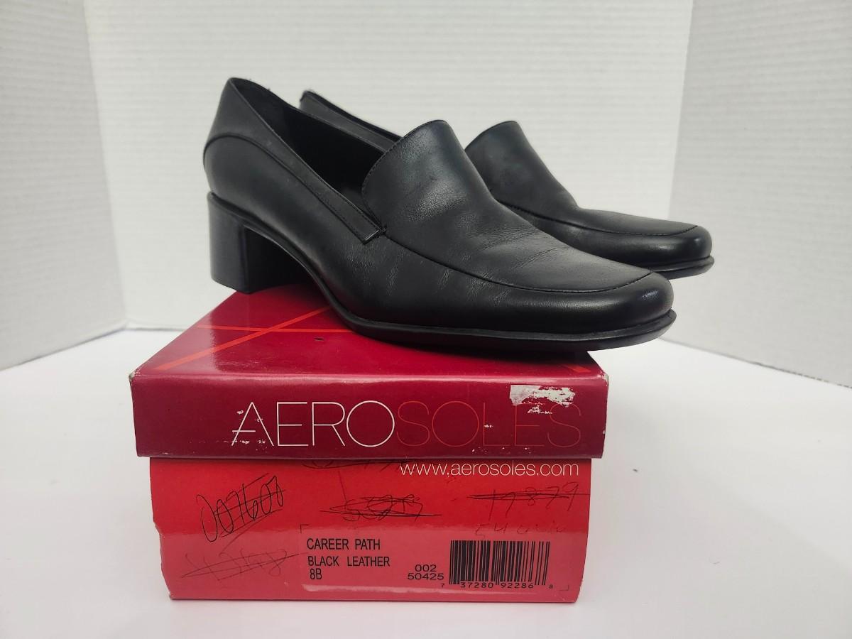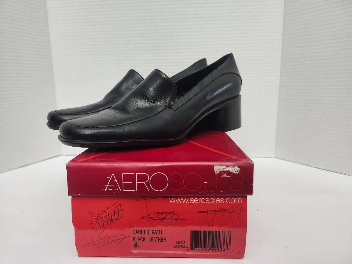 Pair of Aerosoles Career Path slip on shoes in black leather with block heel and squared toe. Marked Career Path Black Leather size 8B on original Aerosoles box. Low profile loafer style designed for office and professional wear. Includes original branded box as shown. All details stated based on visible labeling and photographs only.
