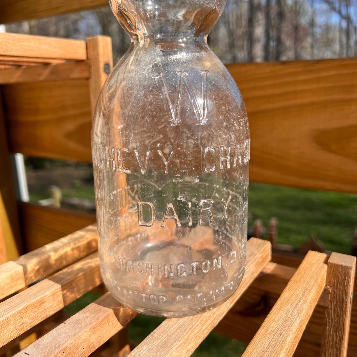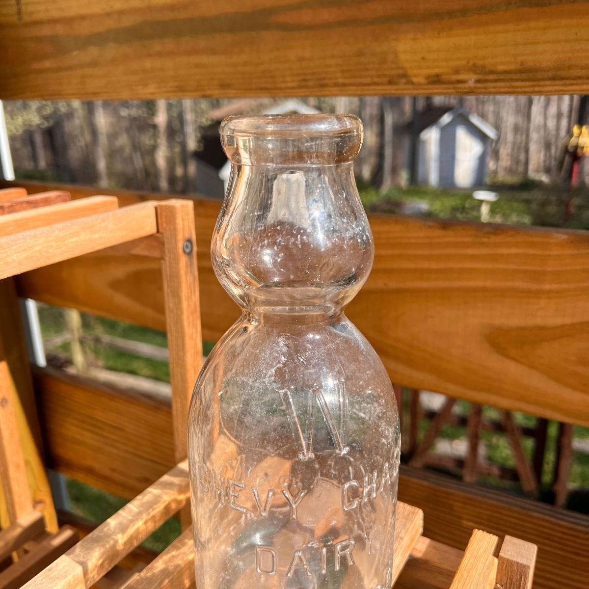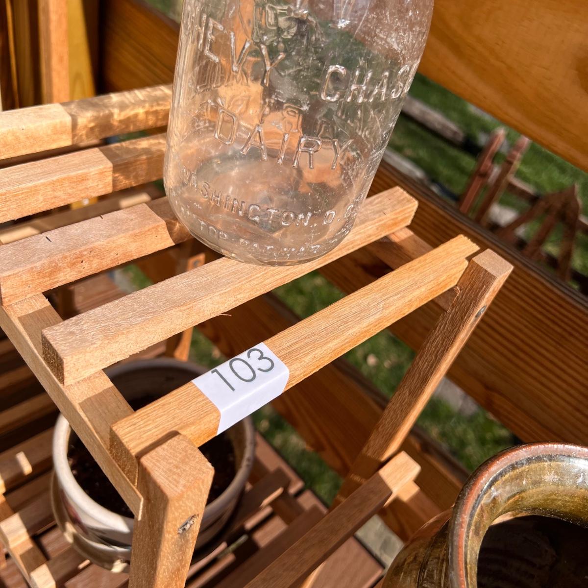 Vintage Chevy Chase milk bottle, stone vase or candle holder, glass frog candle holder, pottery planter bowl, pottery jug, wooden shelf
