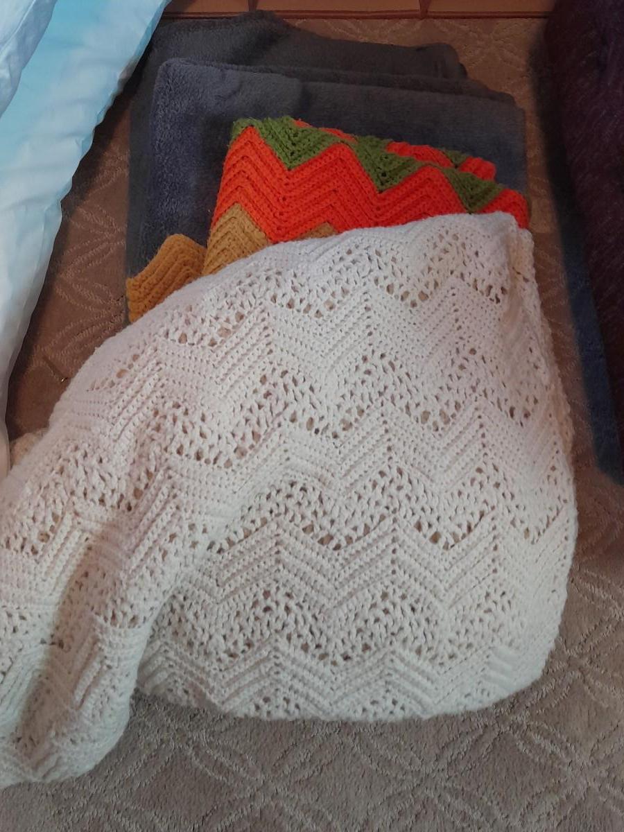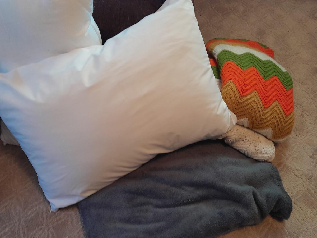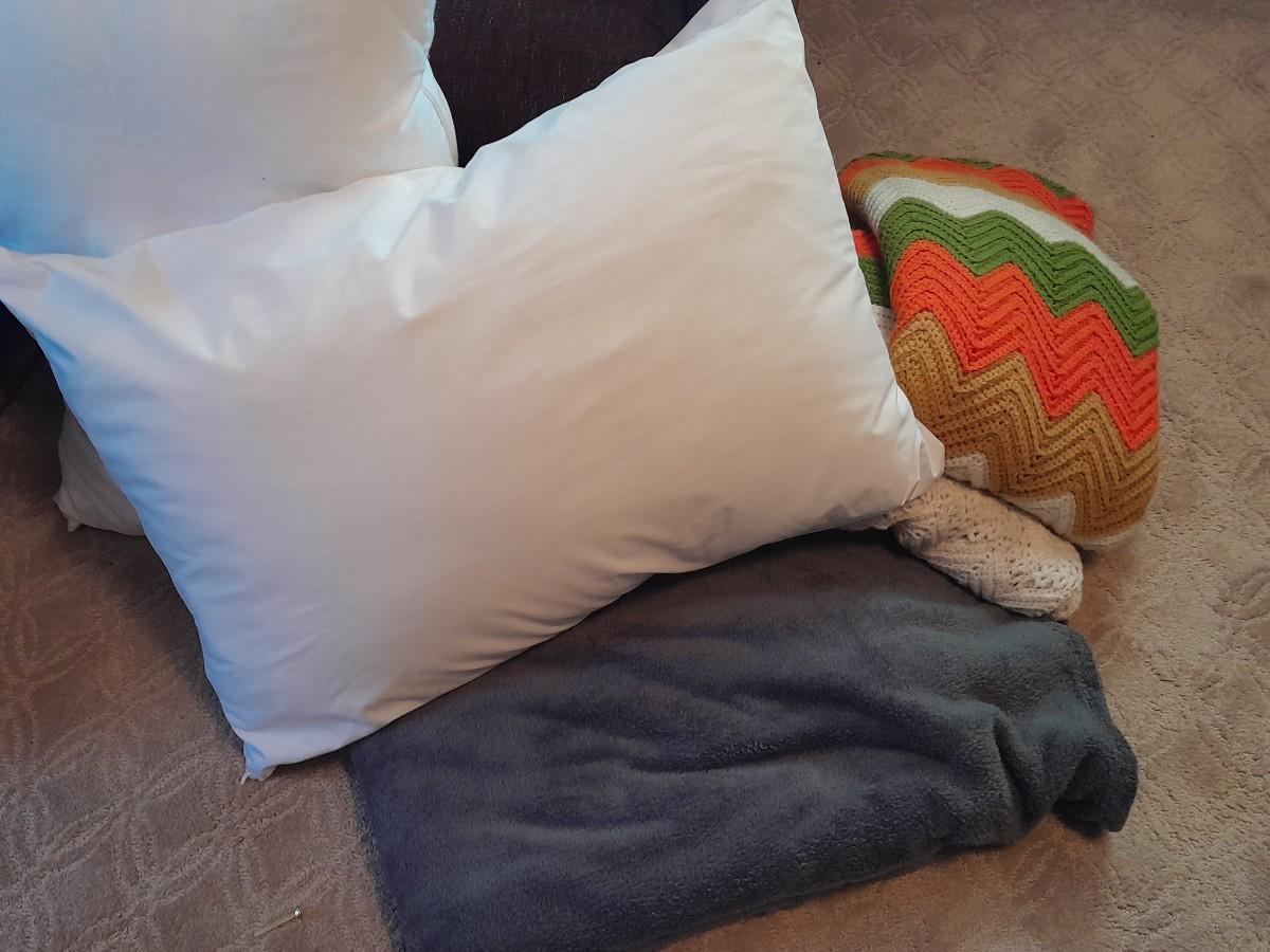 TWO AFGHAN BLANKETS, PILLOW, AND SOFT GREY BLANKET