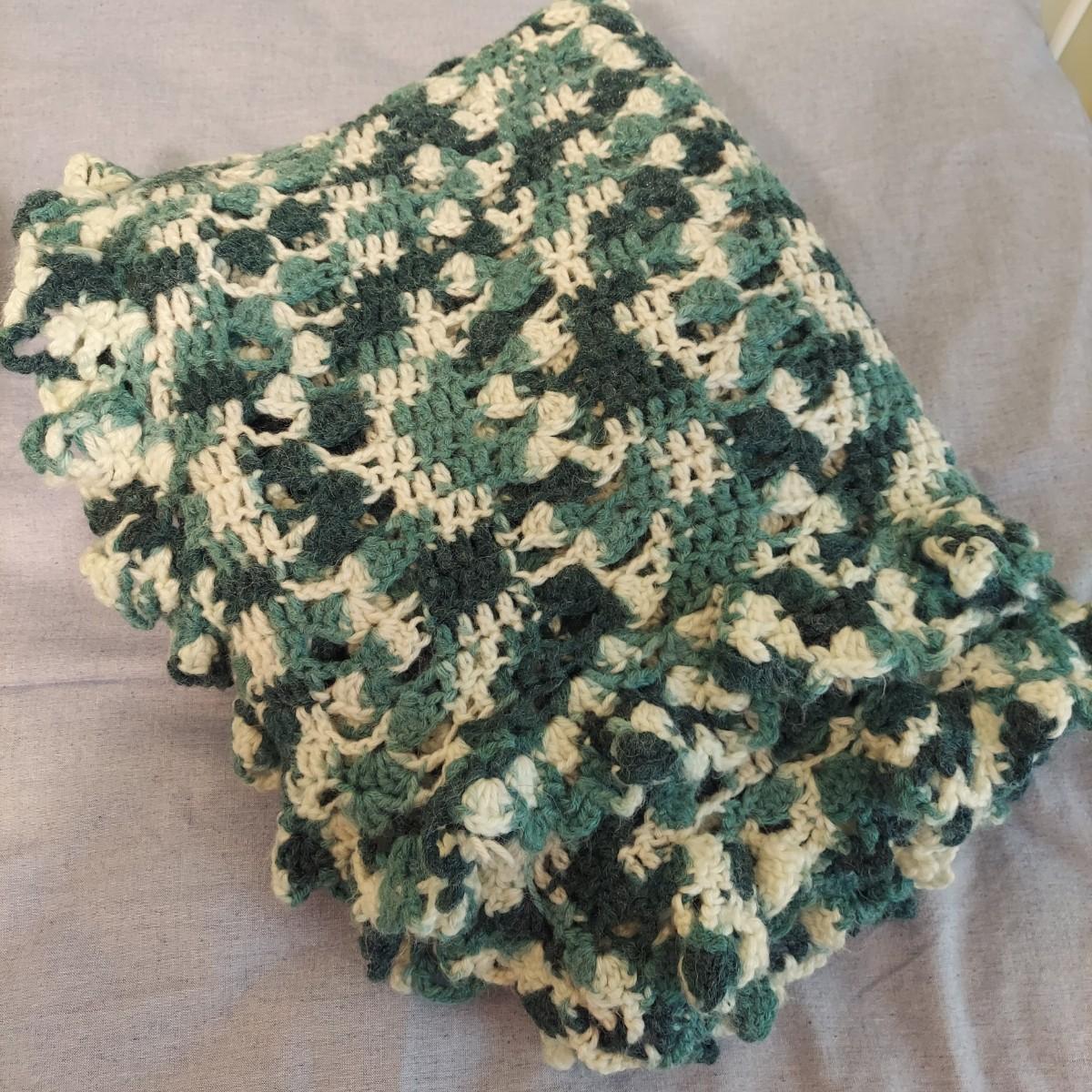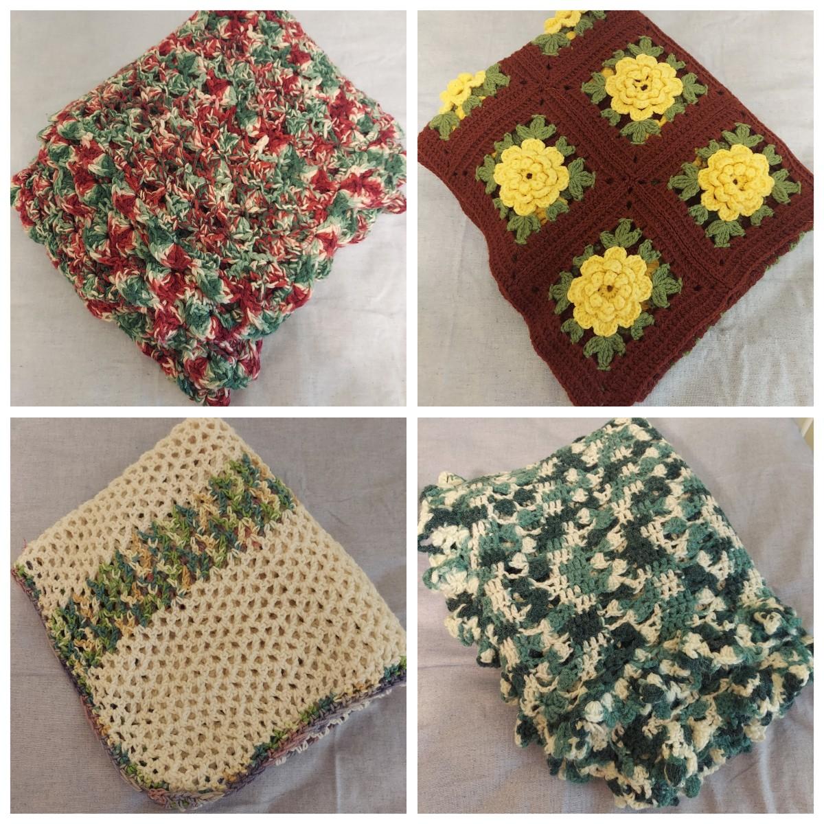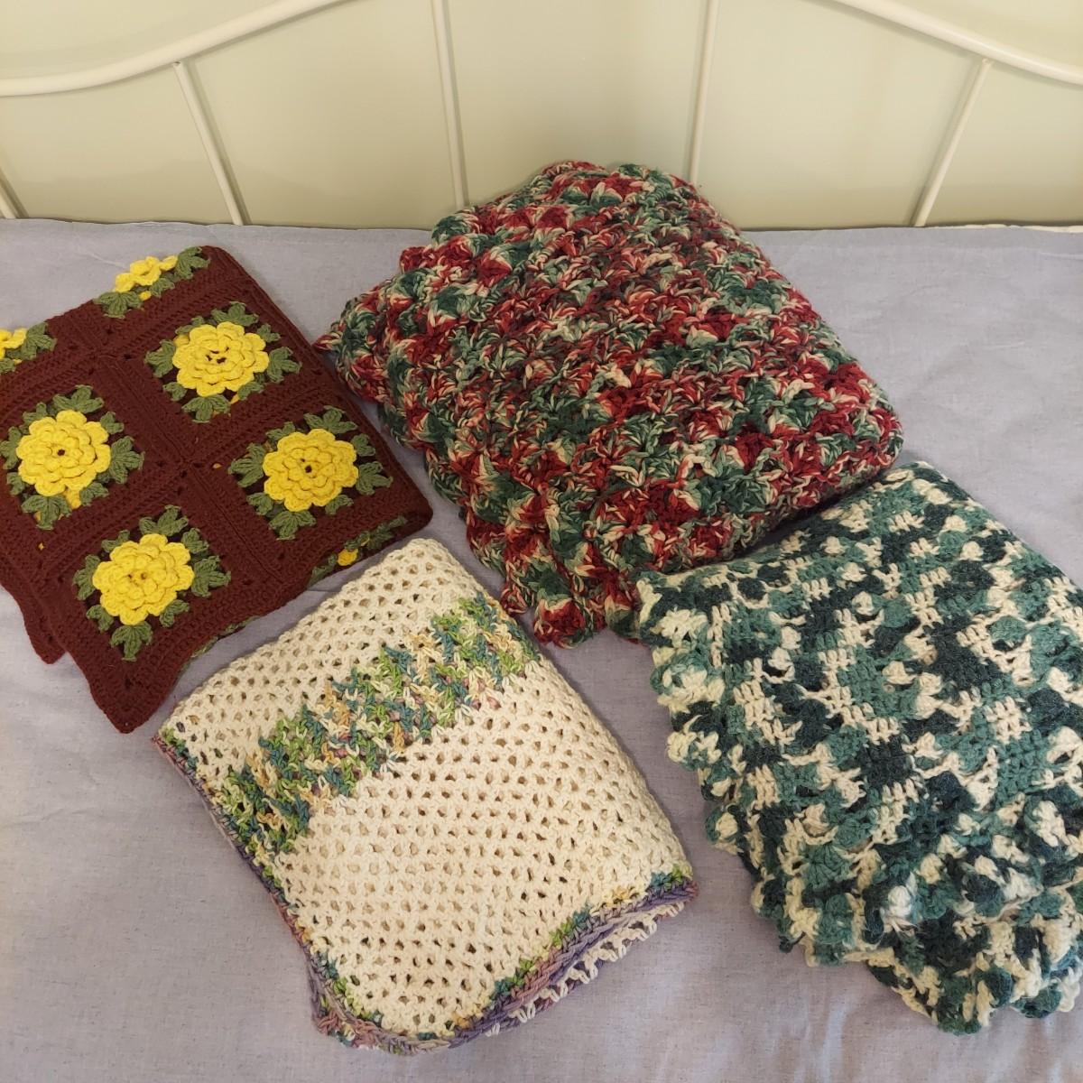 Four knitted afghan throws in various styles. The largest blanket is roughly twin size. The others are lap blankets. Shown on a twin bed. Please see photos for details. Shipping available.