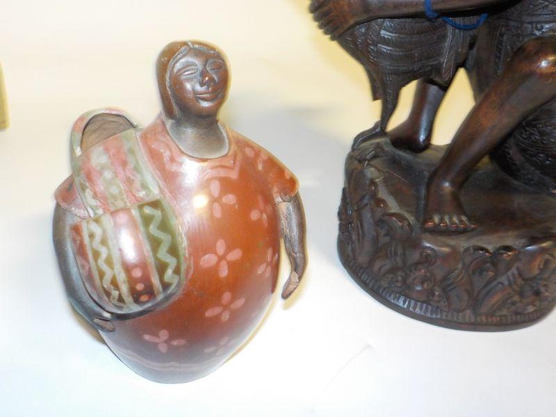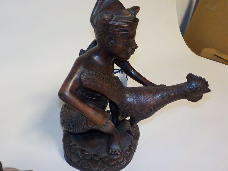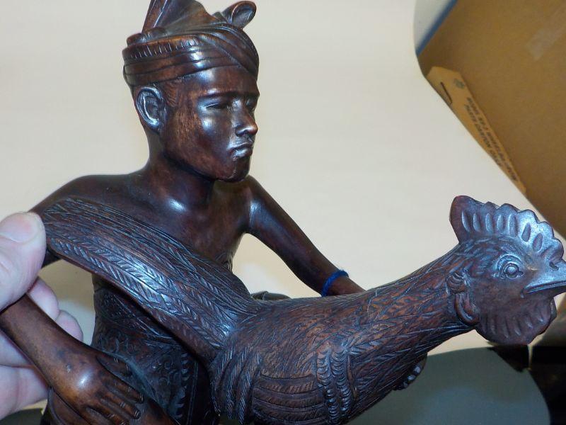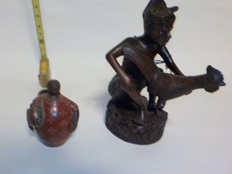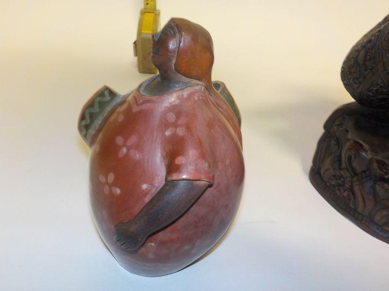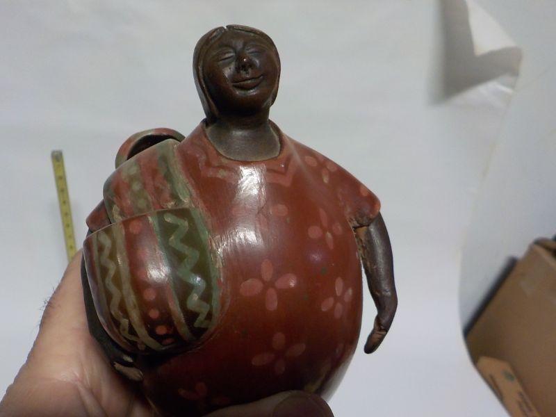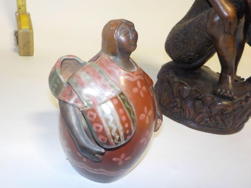 .Two items: Wood carved sculpture of man with rooster. As is: Cracks in base, rooster legs are broken and missing. Peruvian ceramic figure of a woman, signed on bottom.