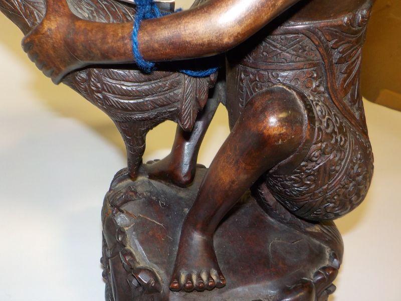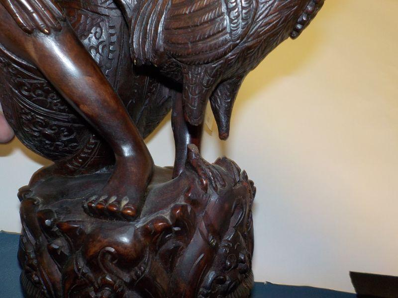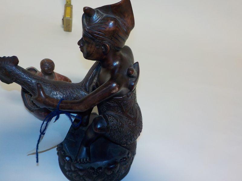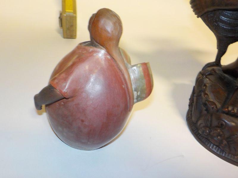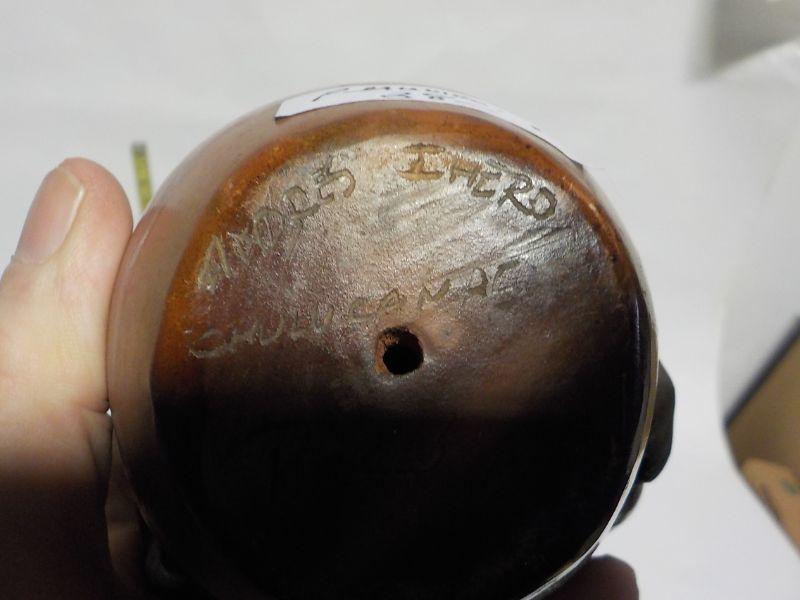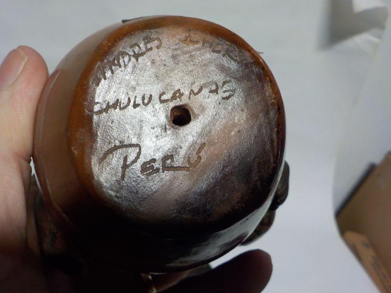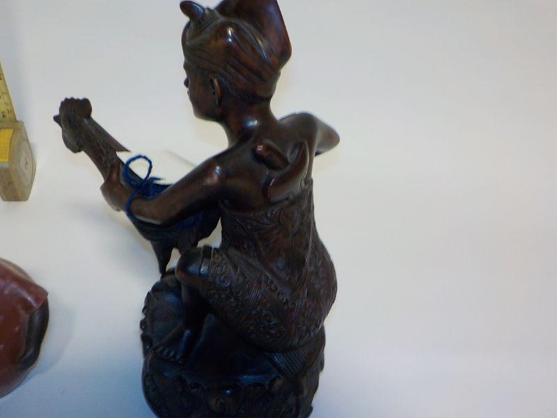 .Two items: Wood carved sculpture of man with rooster. As is: Cracks in base, rooster legs are broken and missing. Peruvian ceramic figure of a woman, signed on bottom.