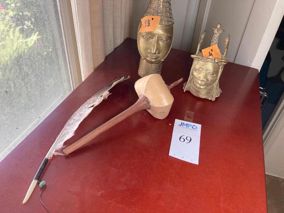 Bronze heads 9 1/2" and 6"h. 15 inch feather w string & bead. Musical rattle wood, 11 1/2".