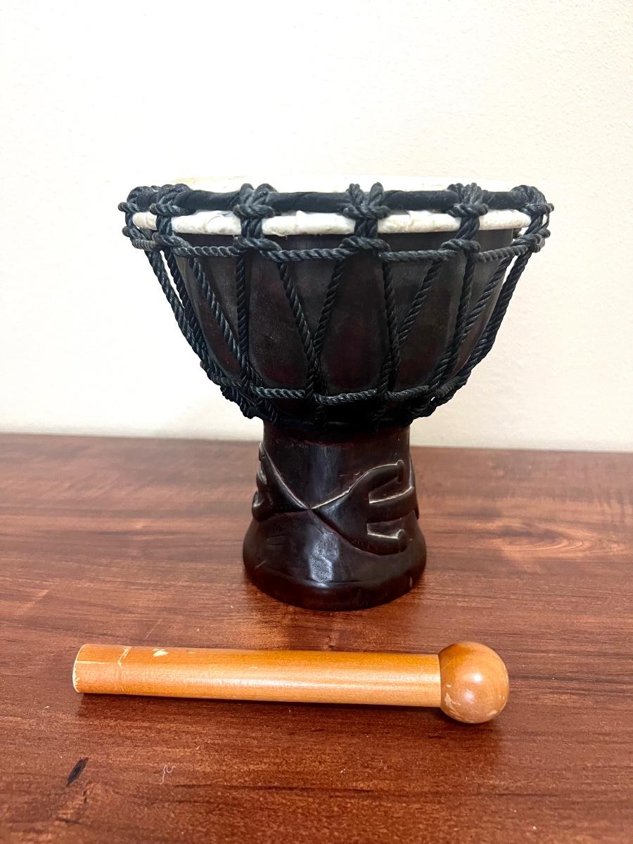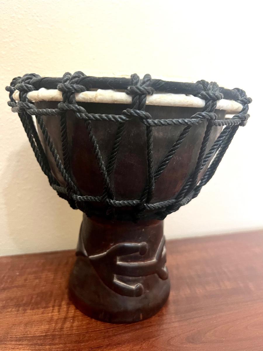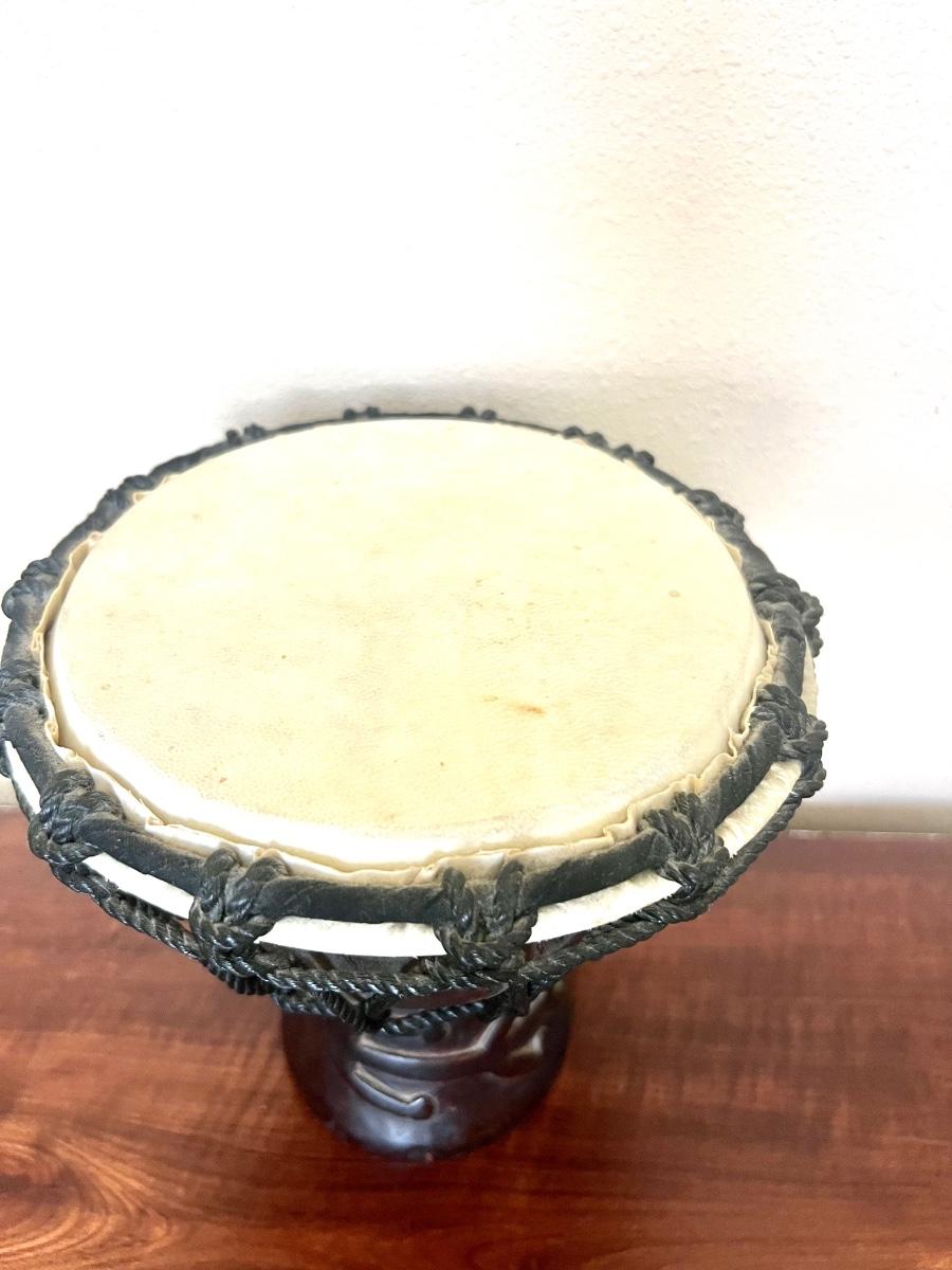 African Carved Hand Drum. Measures 7 1/2 inches tall drum measures at 8 inches round.