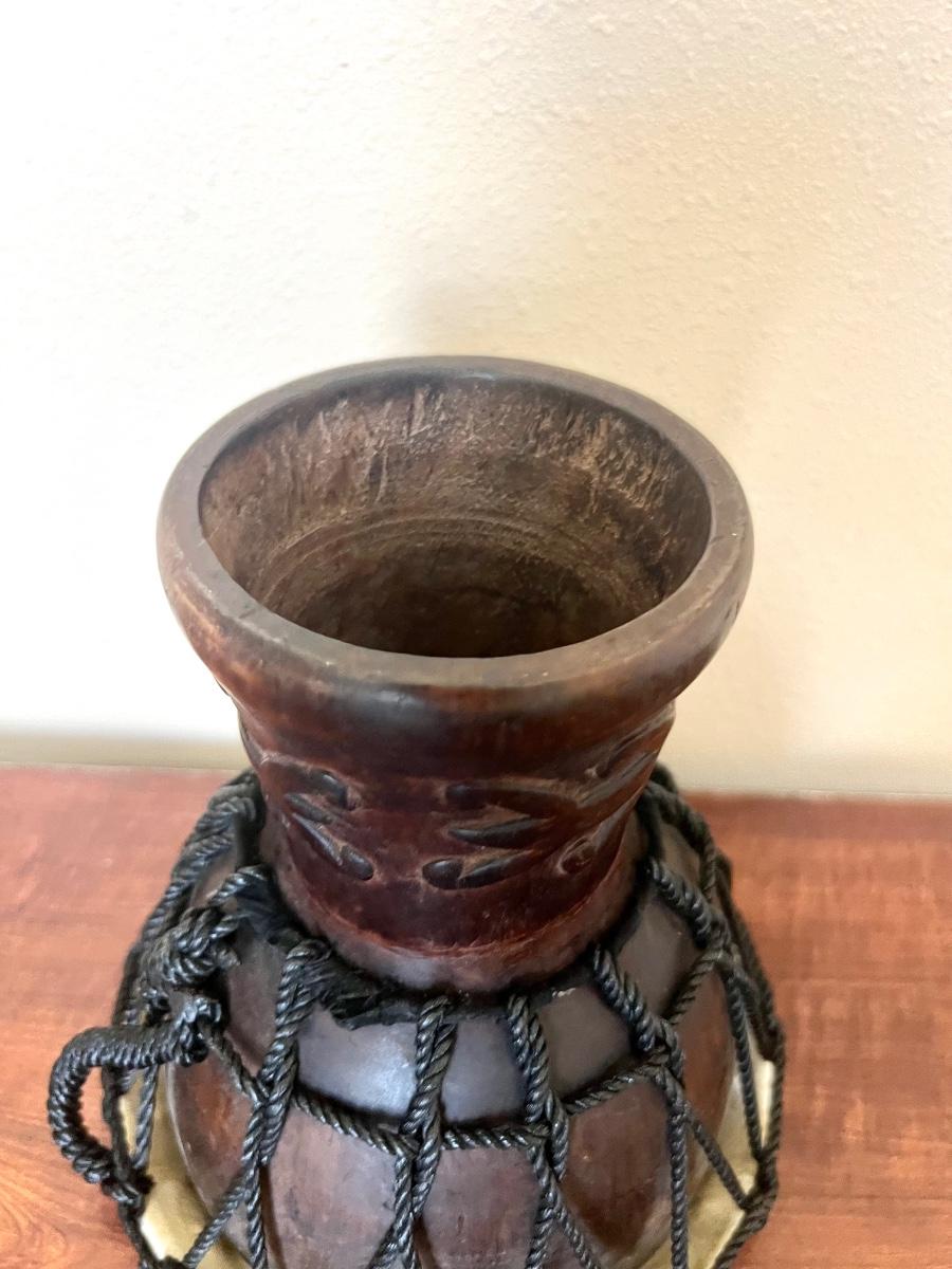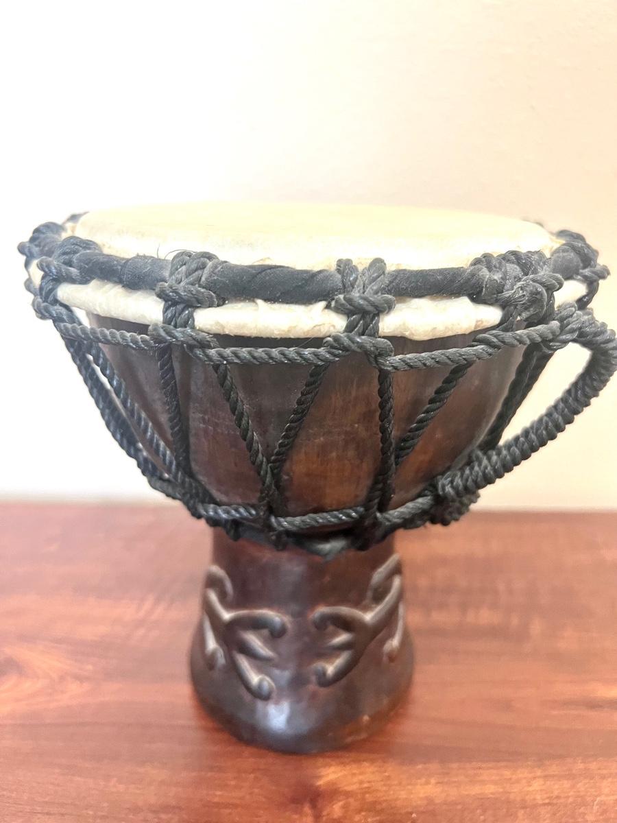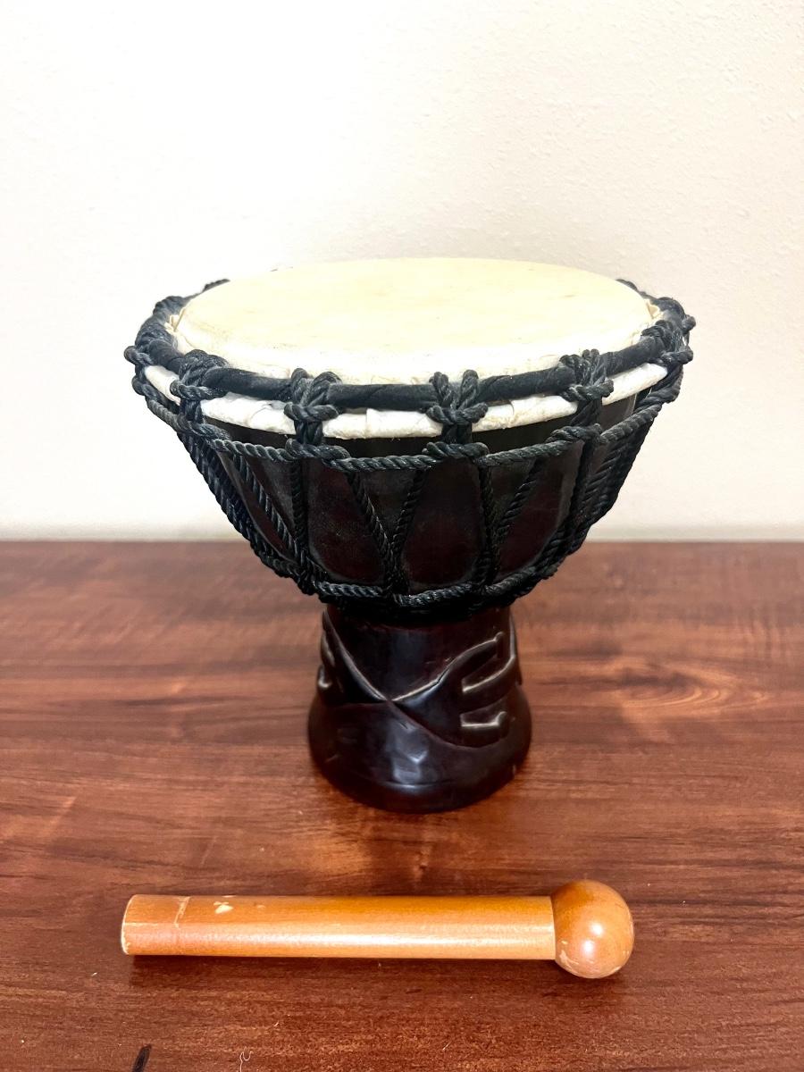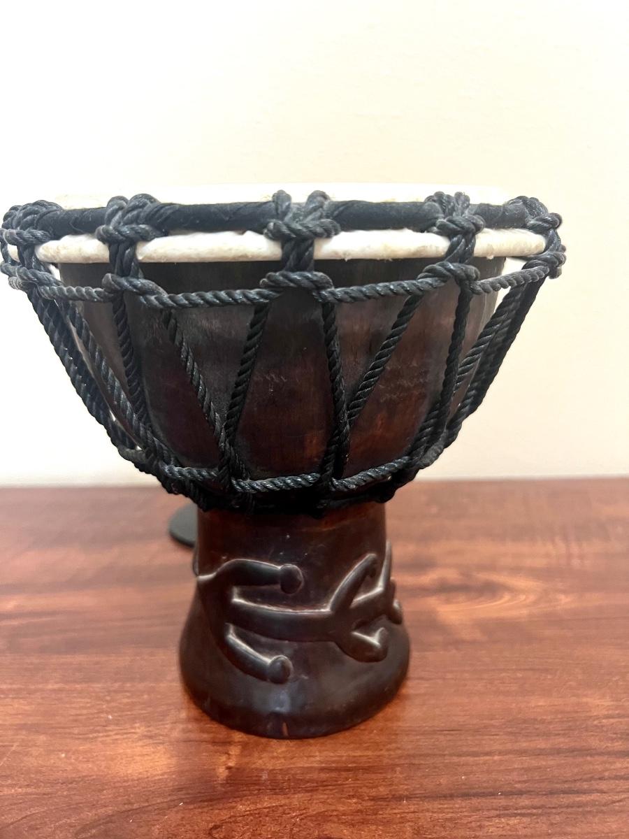African Carved Hand Drum. Measures 7 1/2 inches tall drum measures at 8 inches round.