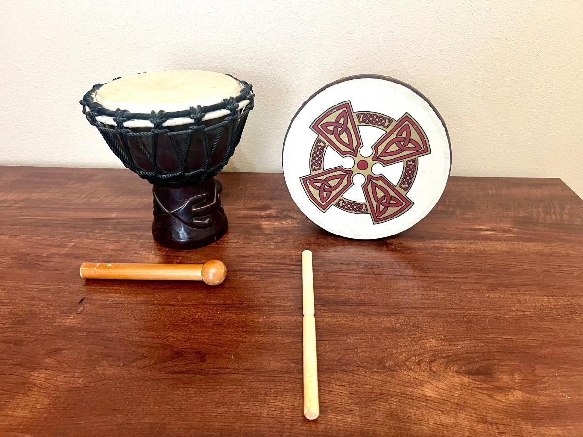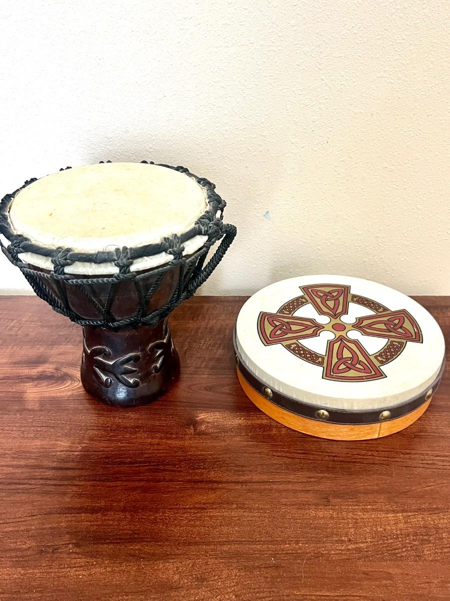 African Carved Hand Drum & Irish Kilkenny Cross Design Irish Bodhran