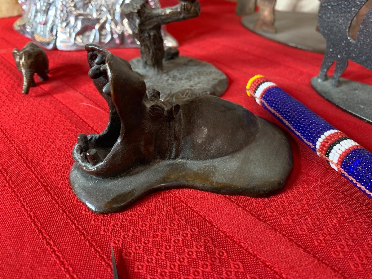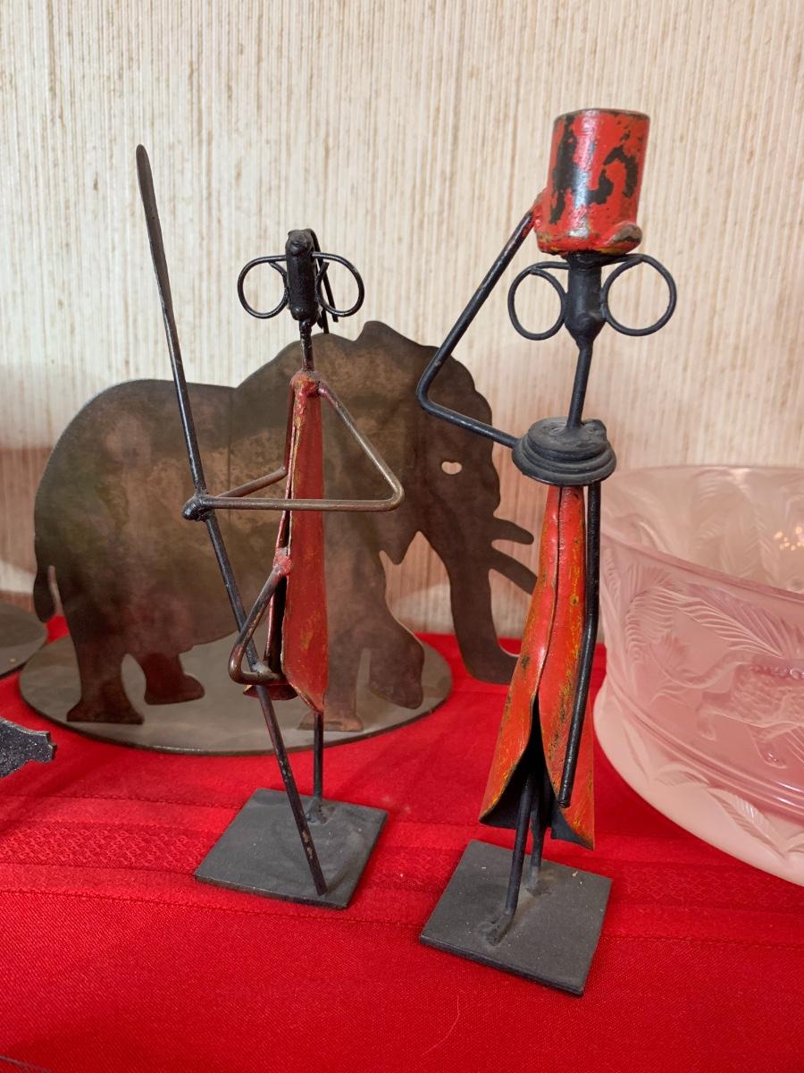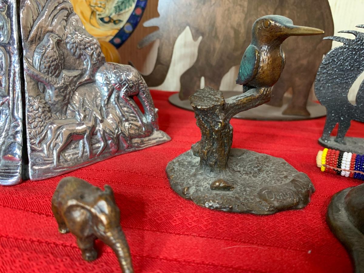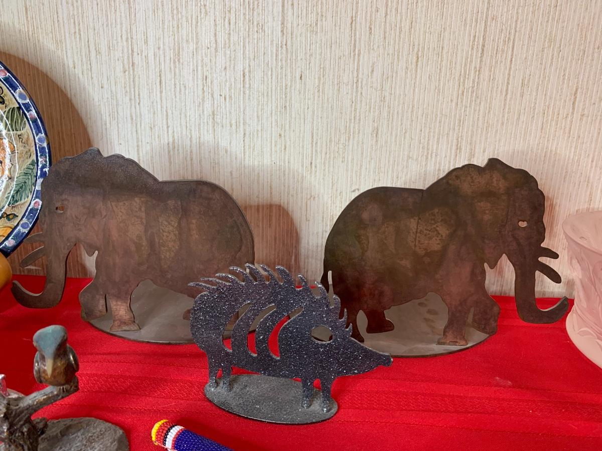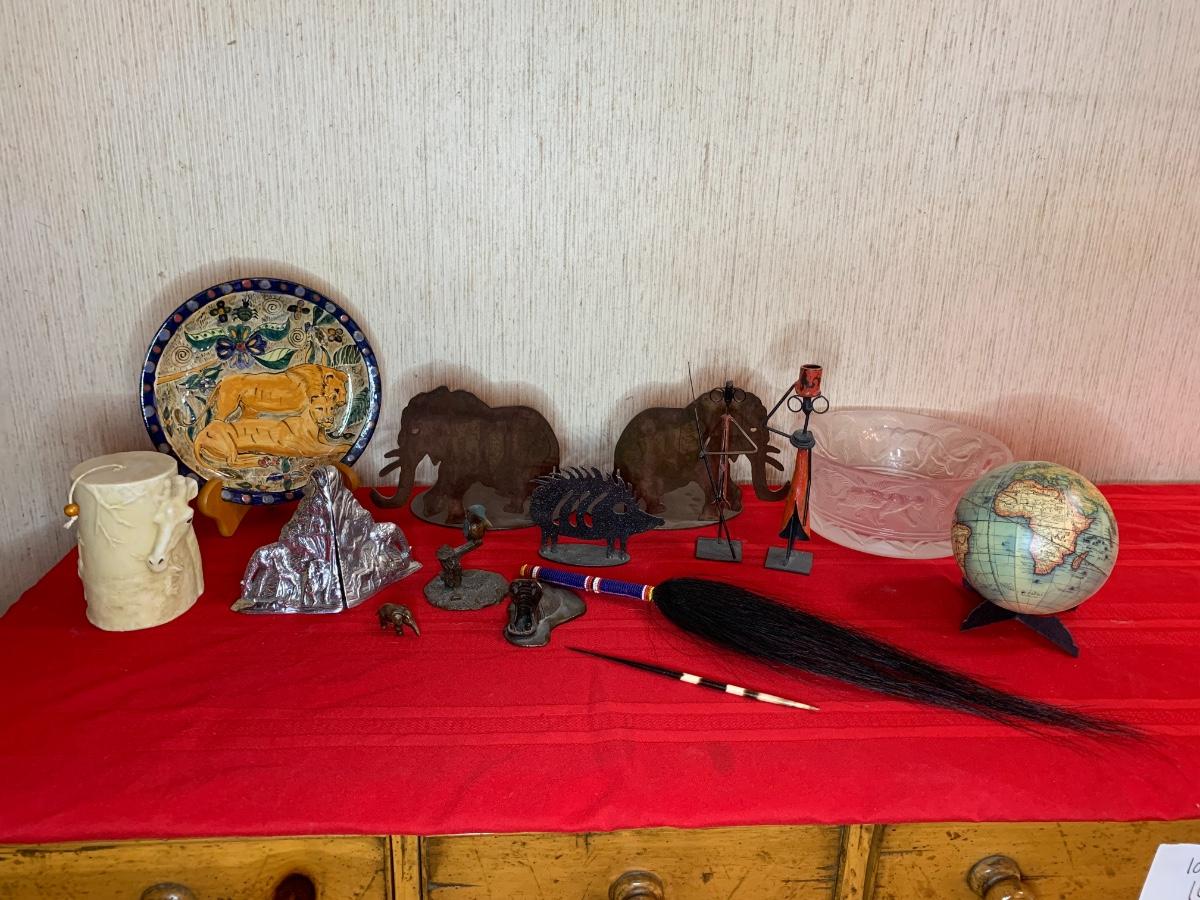 Misc African decor including a glass bowl with tiger etching, two metal elephant decor pieces, one beaded animal hair decor piece and a one lightweight decorative globe with stand