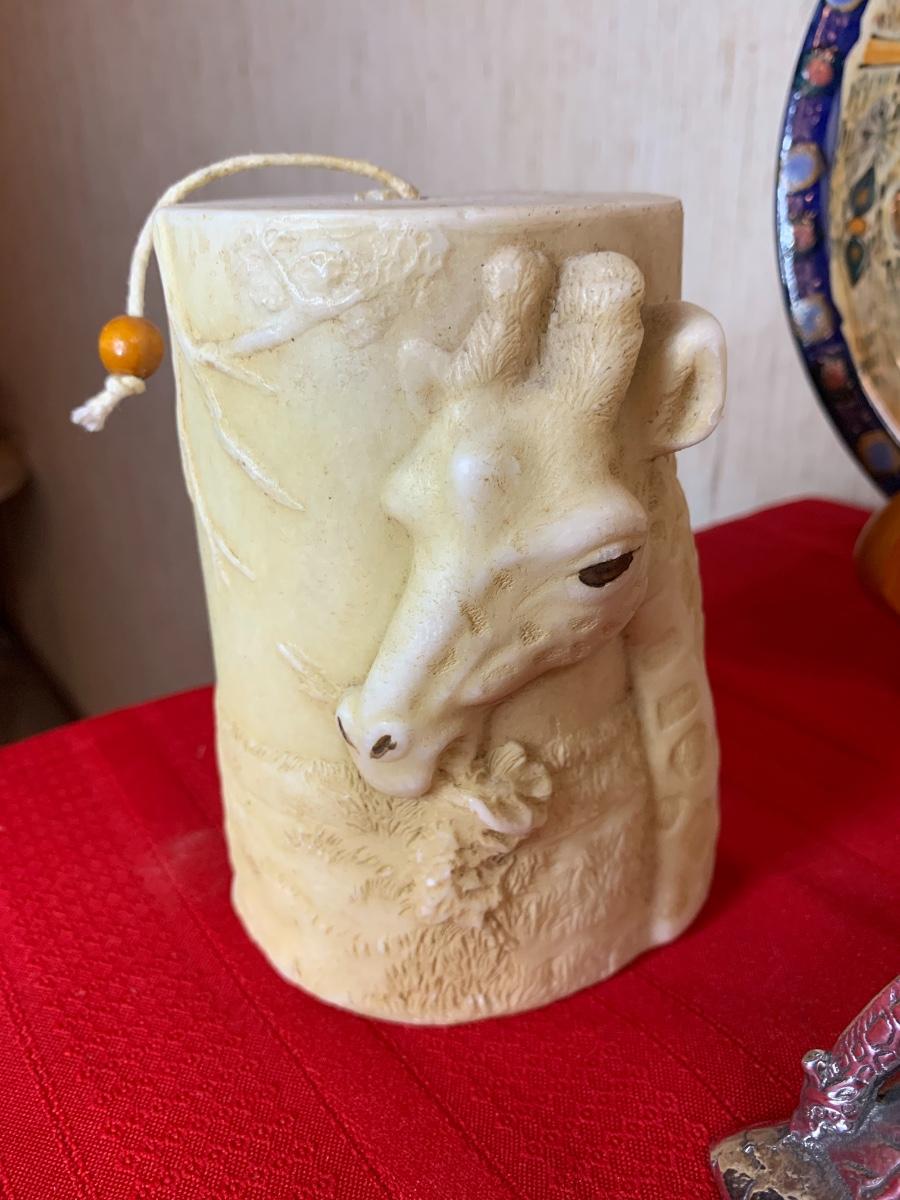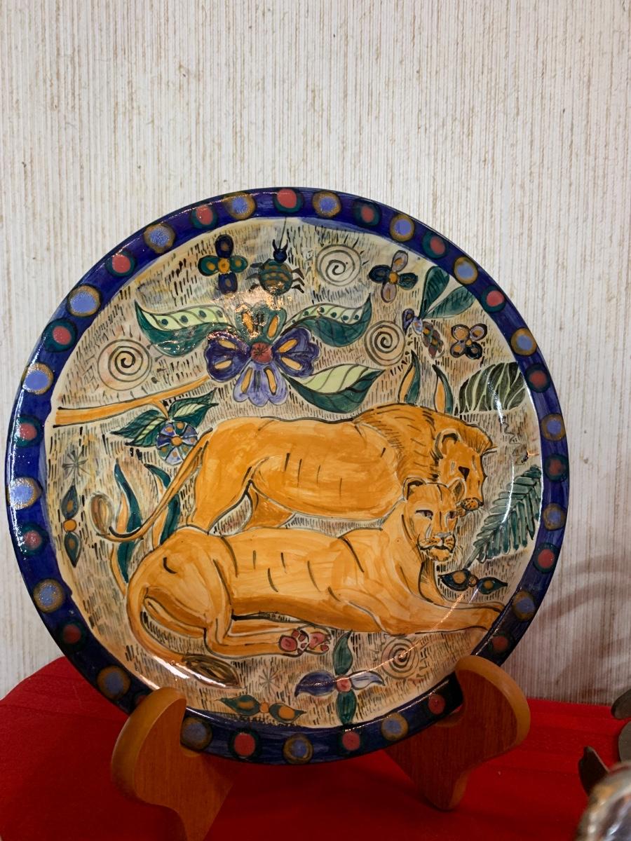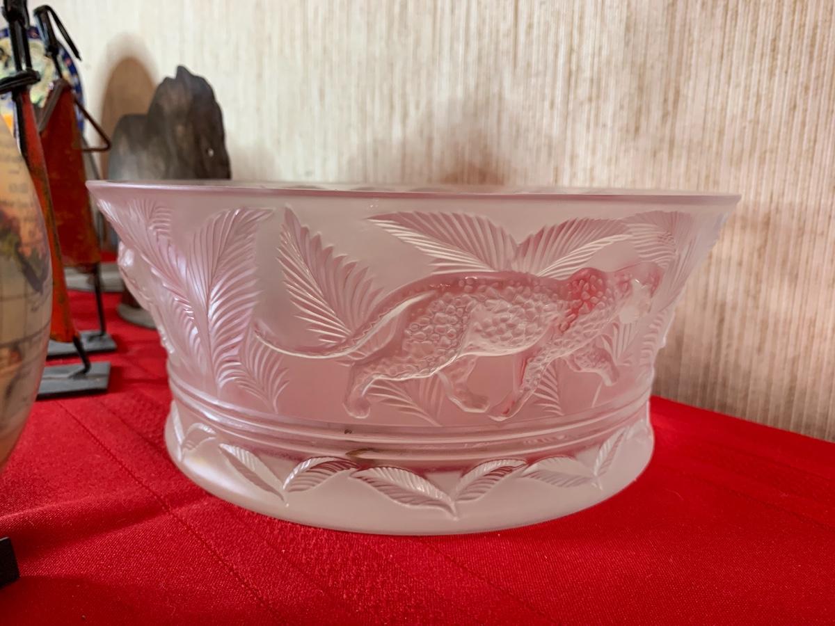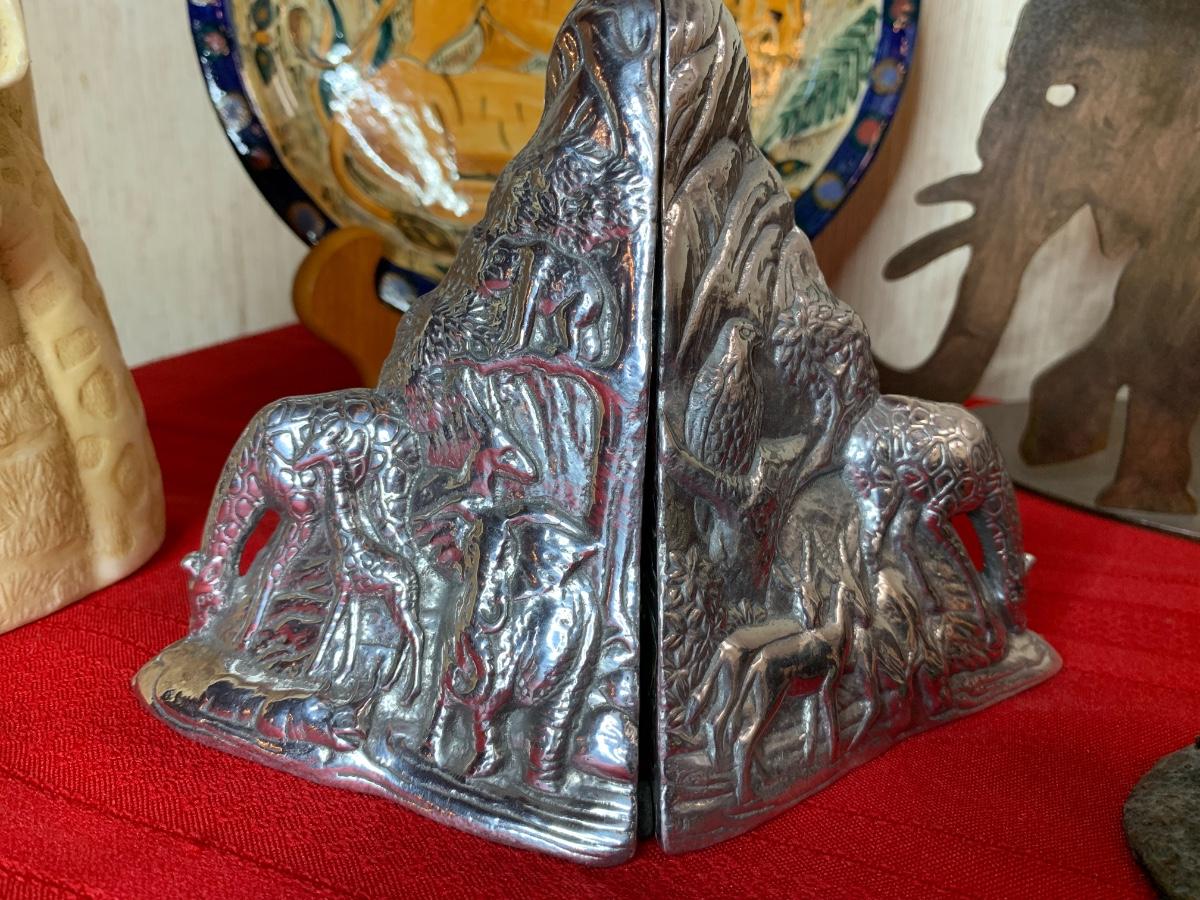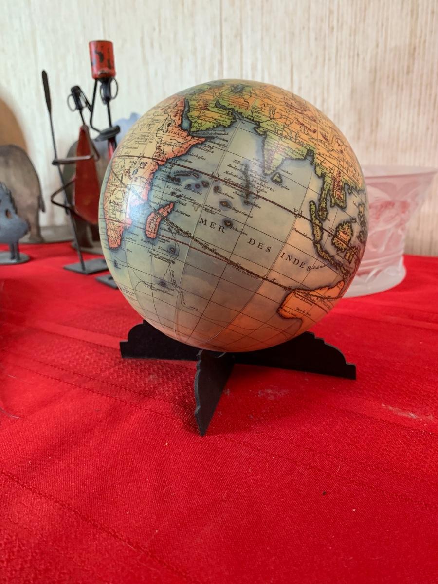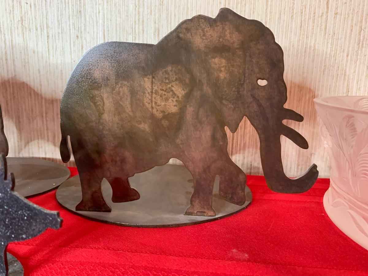 Misc African decor including a glass bowl with tiger etching, two metal elephant decor pieces, one beaded animal hair decor piece and a one lightweight decorative globe with stand