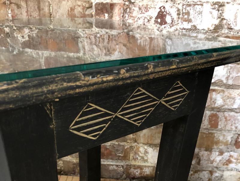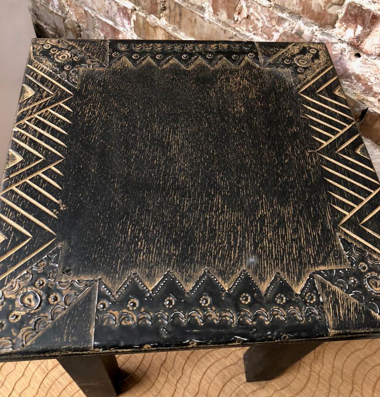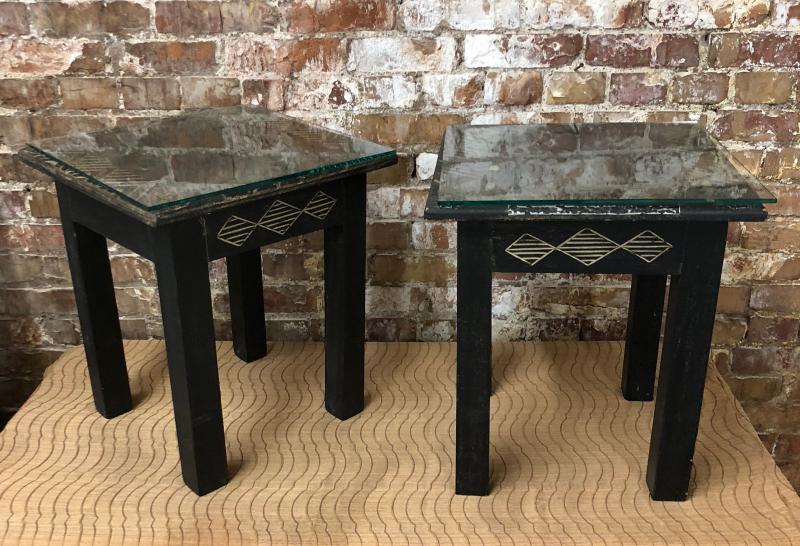 Here are a pair of African hand carved wooden lamp tables..Glass tops on these two..Good condition...16 x 16"...18" tall...