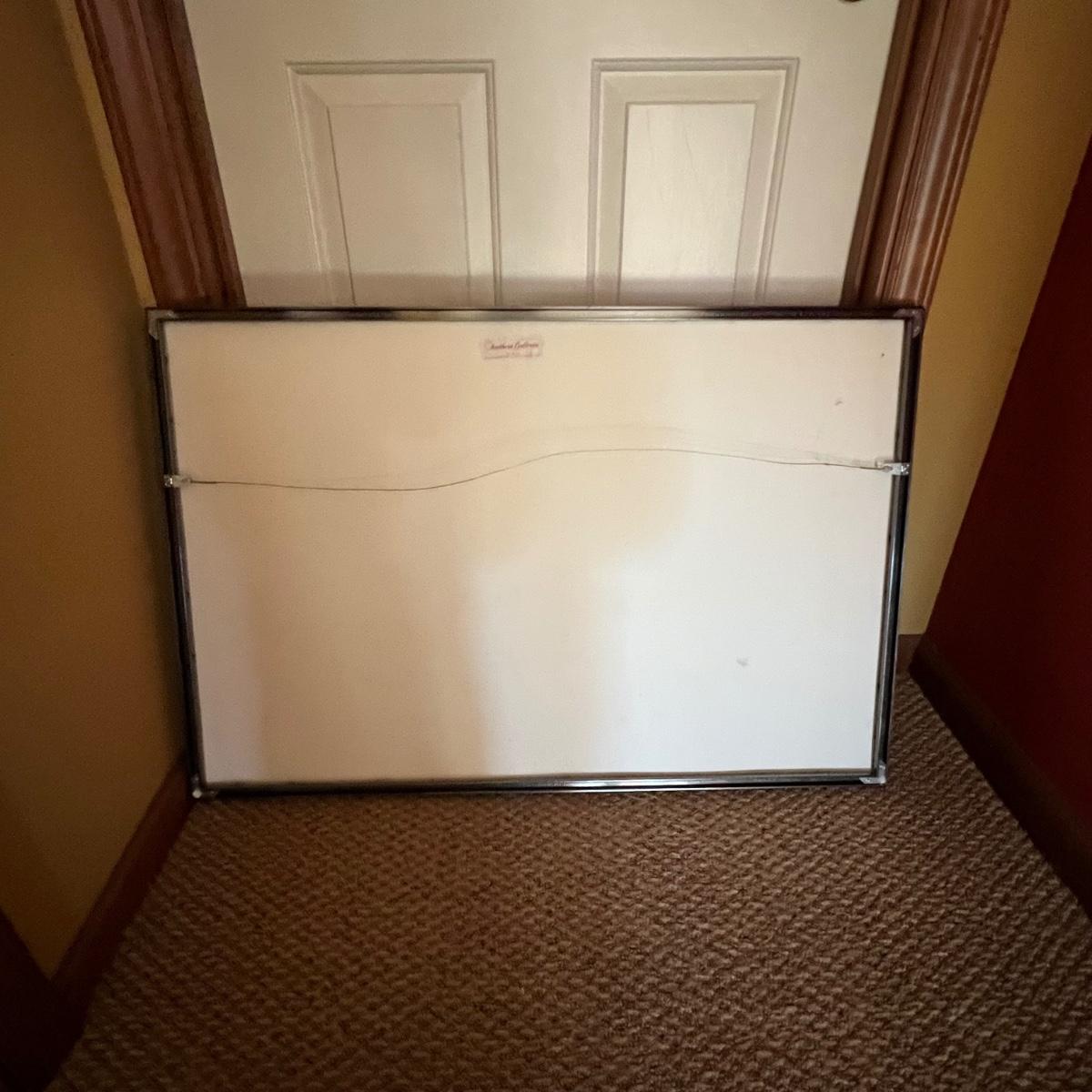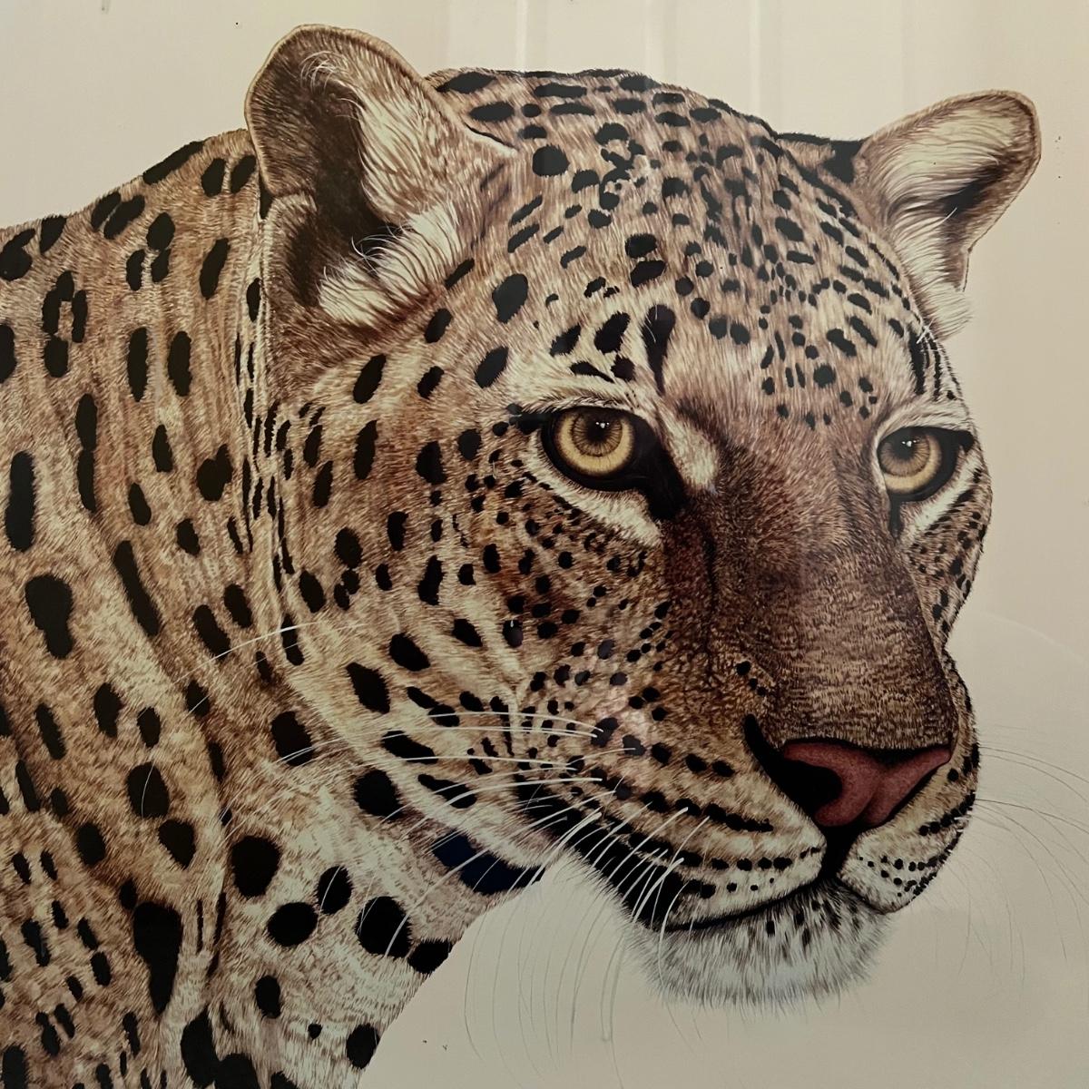 Stunning signed print of an African Leopard. Mounted under glass in a silver colored metal frame which measures 36” x 24”H.