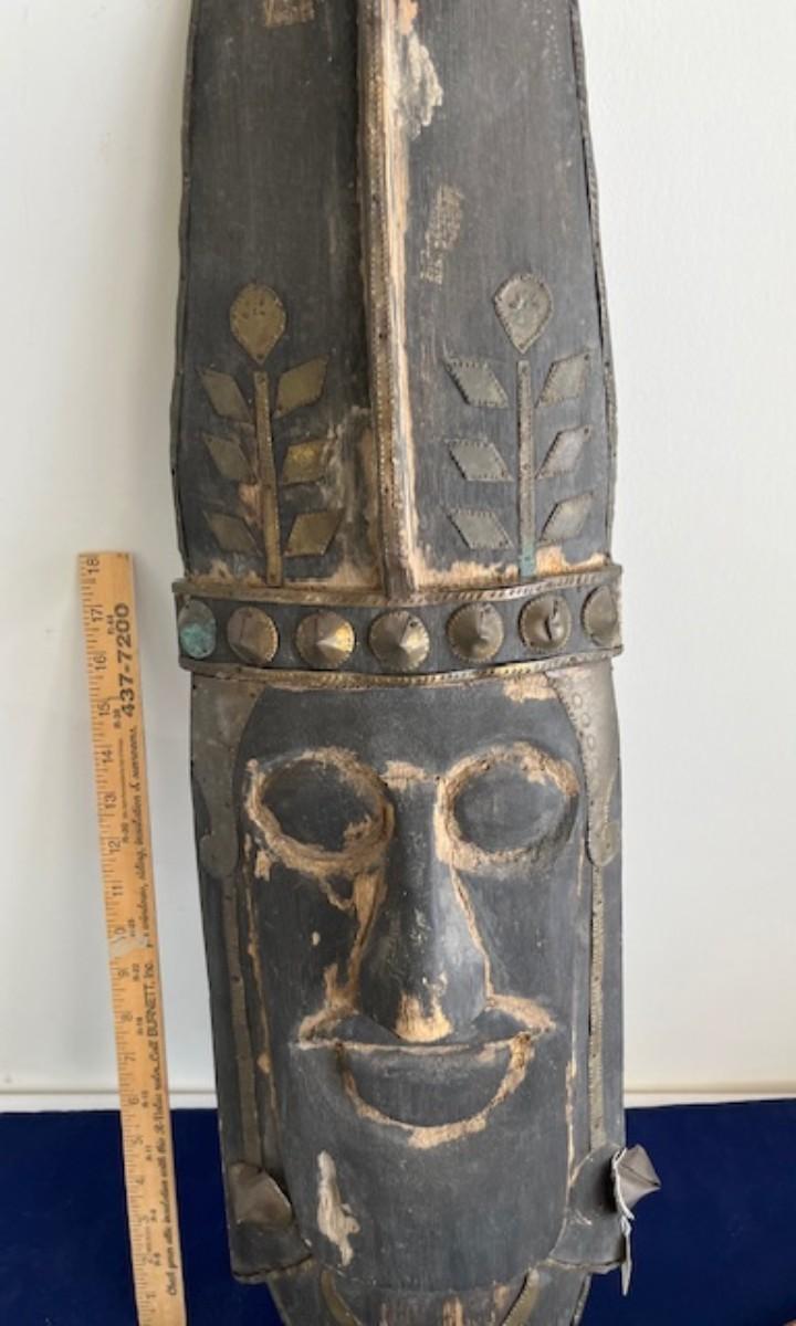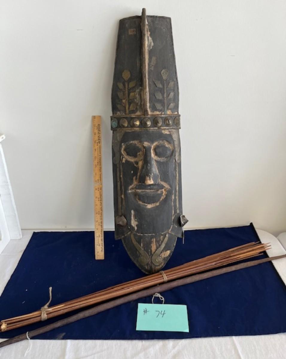 African Toma mask wood and brass, 29 x 9, arrows and bow