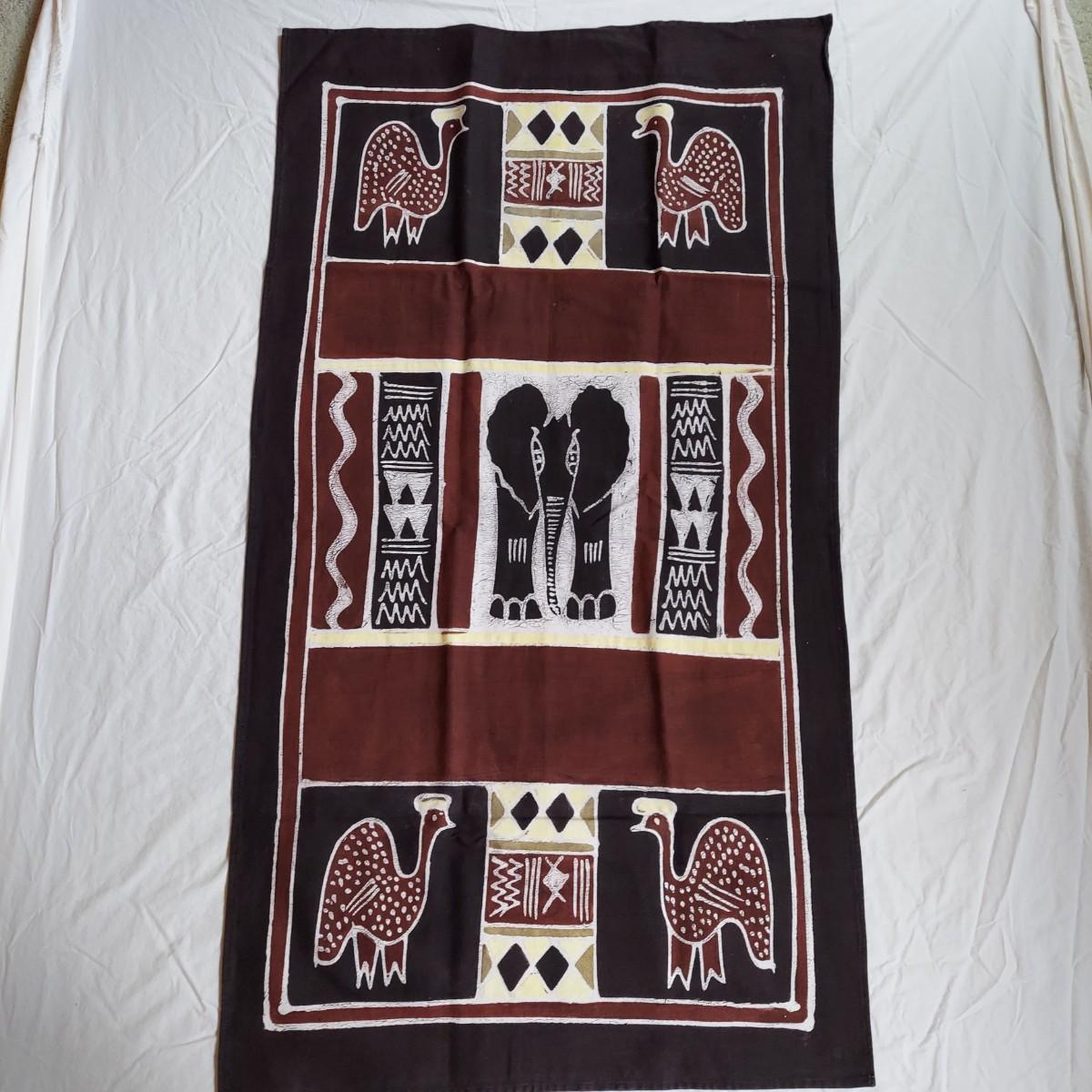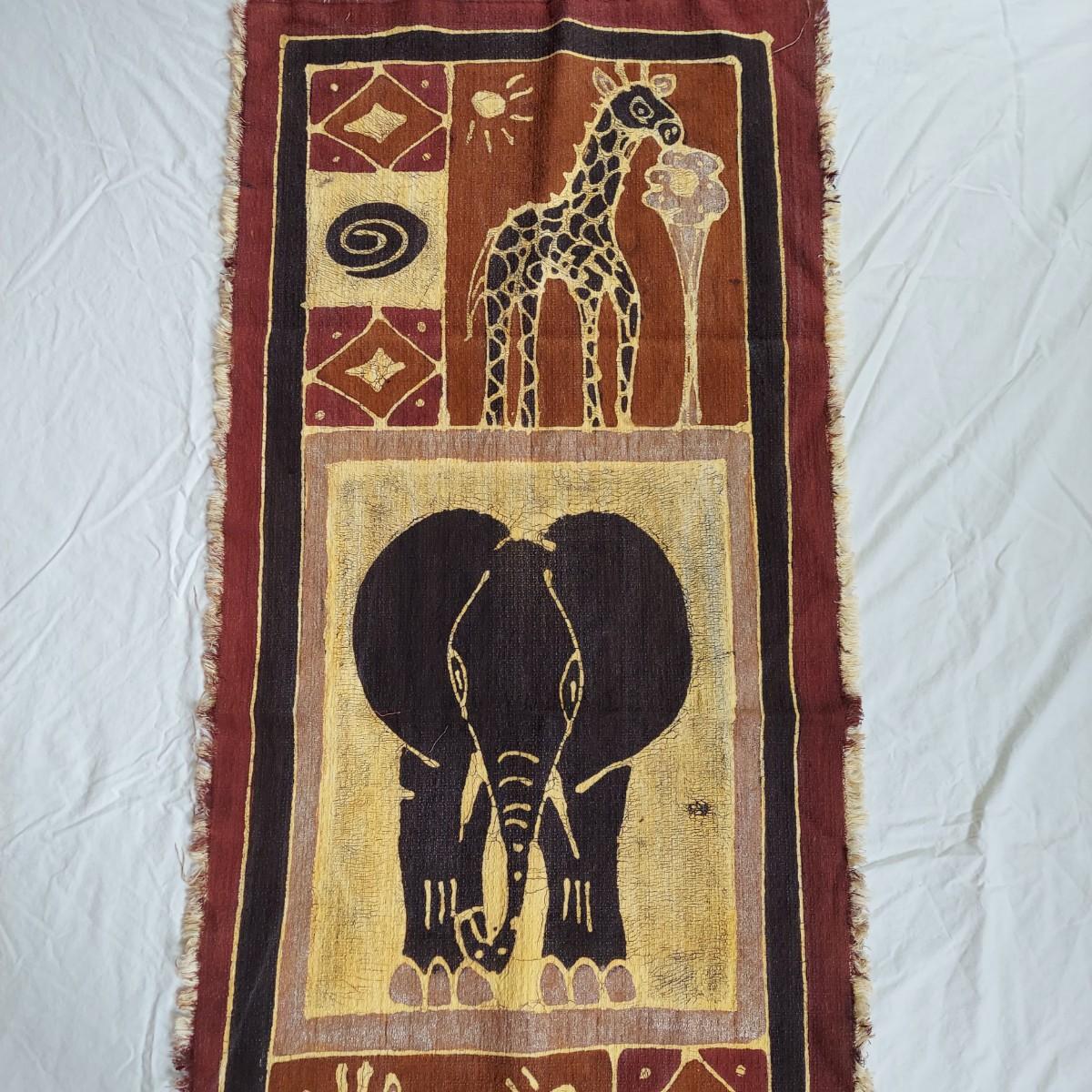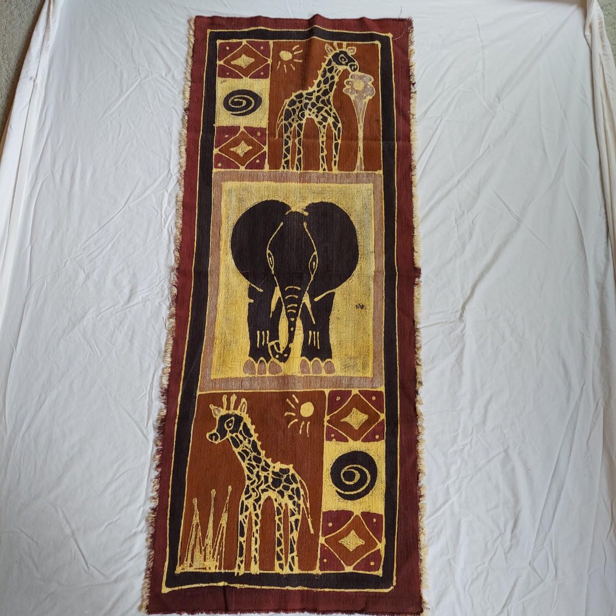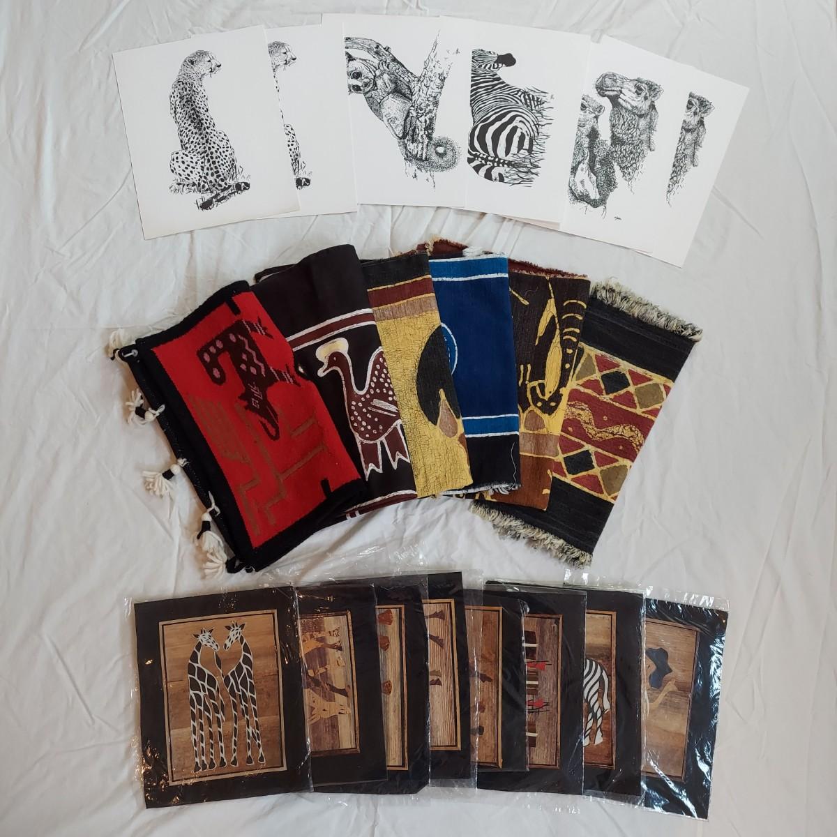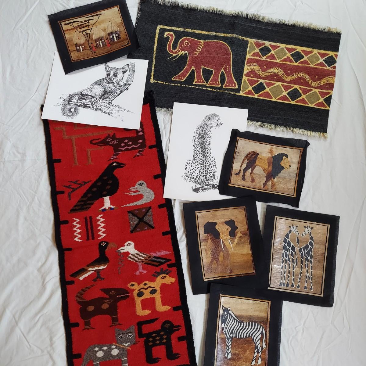 Various types of African art. There are six cloth tapestries in varying sizes. The smallest is the red Egyptian tapestry. It measures approximately 37" x 15". The largest is the blue batik style cloth and its approximately 57" x 34". There are six pen and ink drawings of animals. They measure 10" x 13"H. There are eight art pieces made of cloth, wood and paper. They're approximately 9" x 11"H. Shipping available.